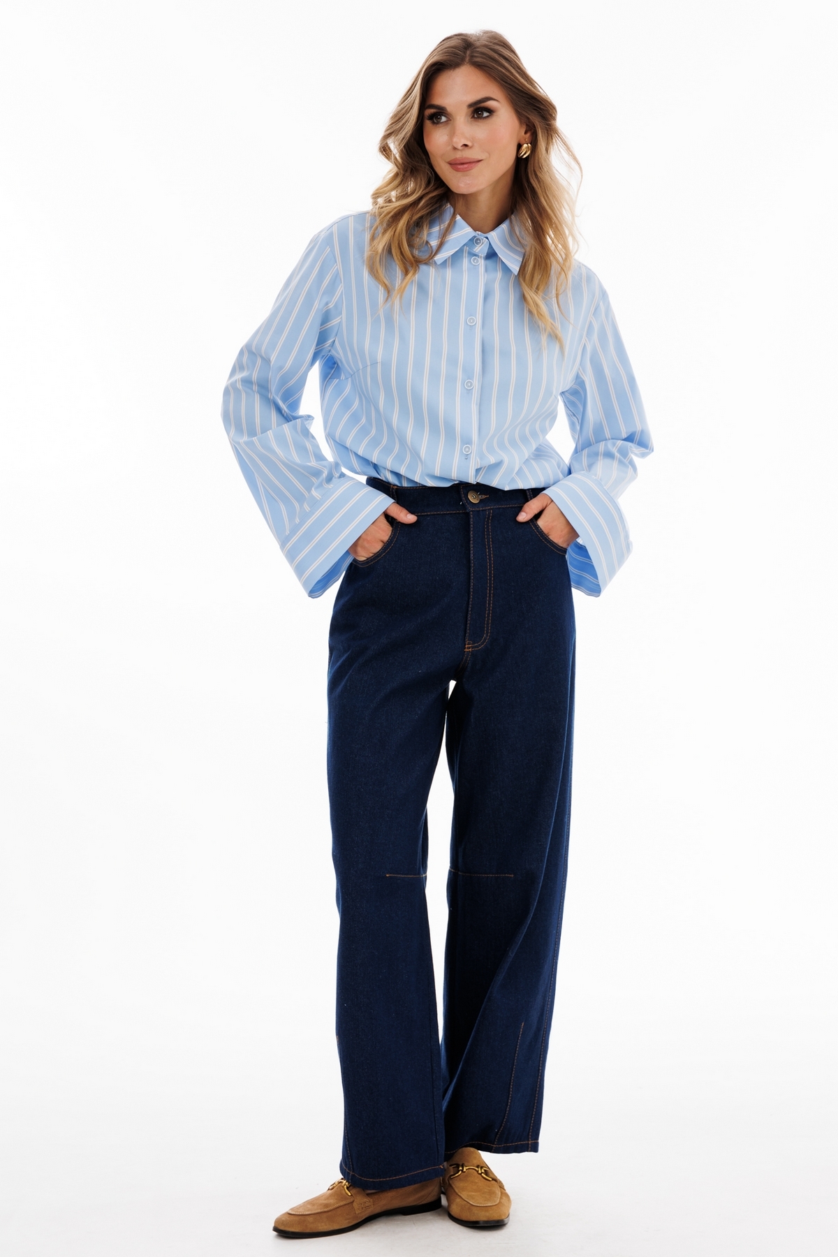 Блузка выполнена из блузочной ткани в полоску. Блузка прямого силуэта, длиной ниже линии бедер. Спереди центральная застежка на пуговицы. Спинка цельная. Вортник стояче-отложной с отрезной стойкой. Плечевой шов удлинен. Рукав рубашечный, одношовный. Низ рукава на широкой манжете. В боковых швах разрезы. Низ блузки фигурной формы.