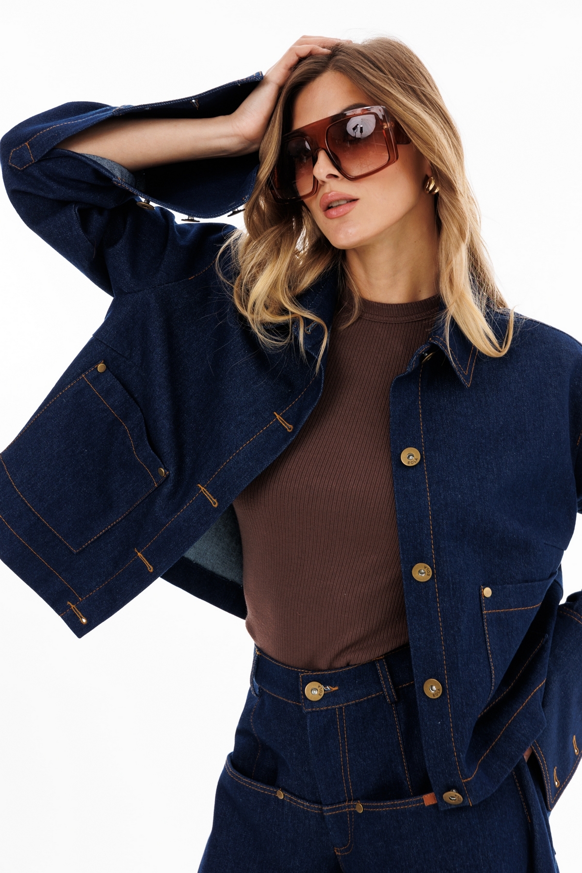 Блузка выполнена из плотного джинса. Блузка прямого силуэта, длиной ниже линии талии. Спереди накладные карманы и центральная застежка с планкой на пробивные пуговицы. На спинке кокетка и две складки. Воротник стояче-отложной с отрезной стойкой. Плечевой шов удлинен. Рукав рубашечного покроя, одношовный. Низ рукава на притачной манжете с застежкой на пробивные пуговицы. Рукав удлинен. Блузка декорирована по кокетке спинки нашивкой из натуральной кожи.