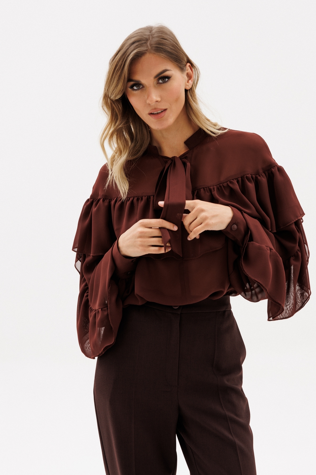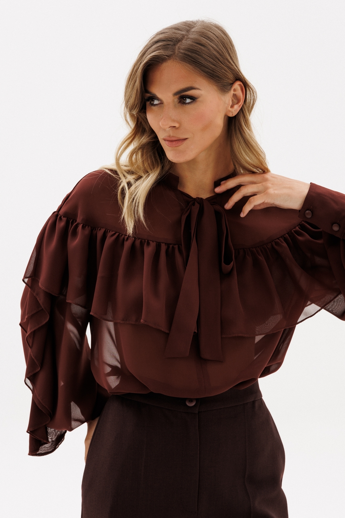 Блузка выполнена из шифона. Блузка прямого силуэта, длиной до линии бедер. Спереди средний шов и кокетка, V-образный вырез и завязки. Ни спинке кокетка. Воротник-стойка. Кокетка переда и спинки переходит на рукав. Рукав двухшовный, расширеный и присборенный к низу. Низ рукава на притачной манжете с застежкой на пуговицы. В боковых швах разрезы. Блузка декорирована оборками из основной ткани по линиям кокеток переда и спинки, и по верхнему шву рукава.