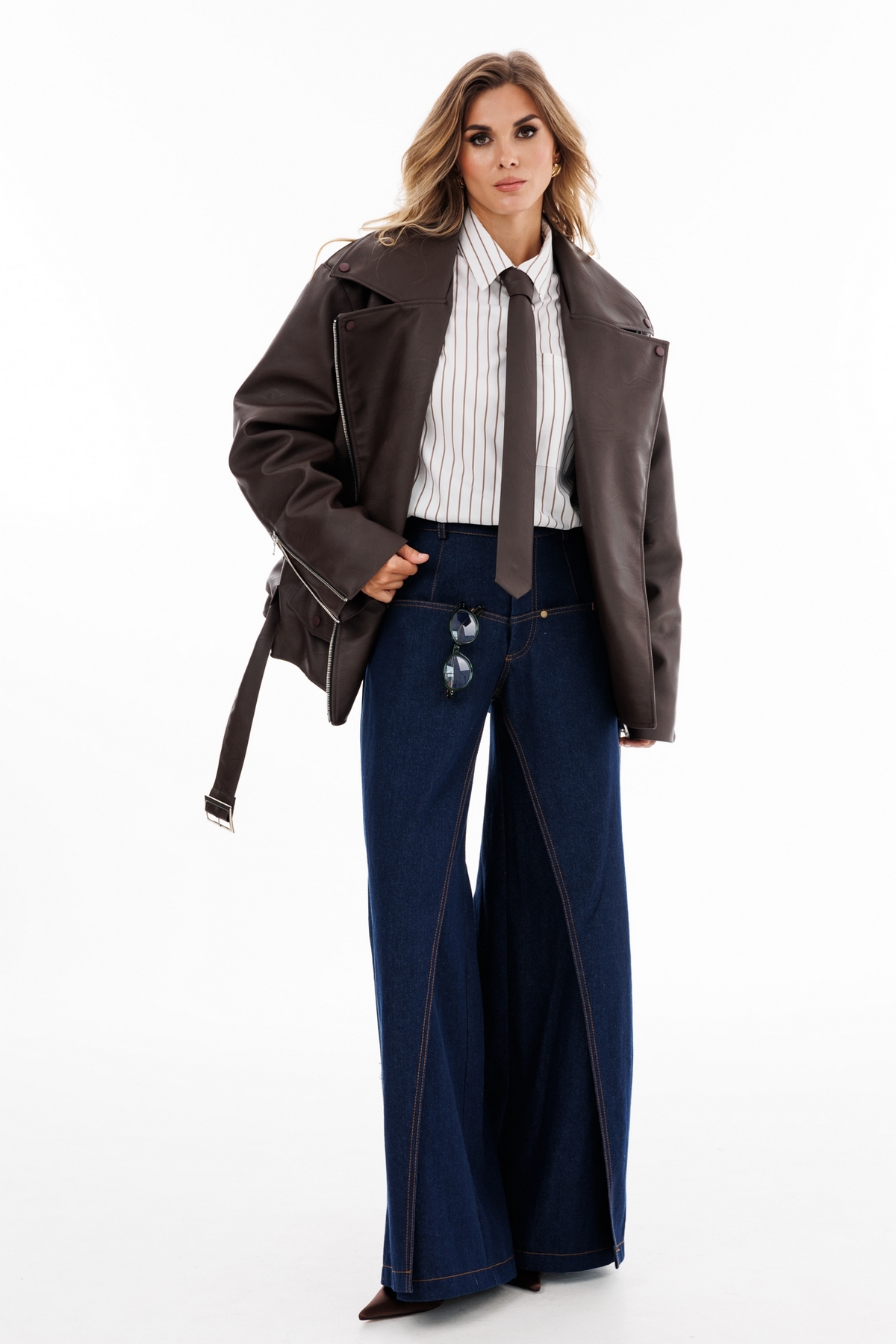 Брюки выполнены из плотного джинса. Брюки на притачном поясе, длиной до пола, расширенные к низу. Спереди верхние отлетные части, боковые карманы с фигурным входом. Застежка на пуговицу и молнию с гульфиком. На задних частях кокетки и накладные карманы. По переду брюки декорированы брендированной нашивкой из натуральной кожи.