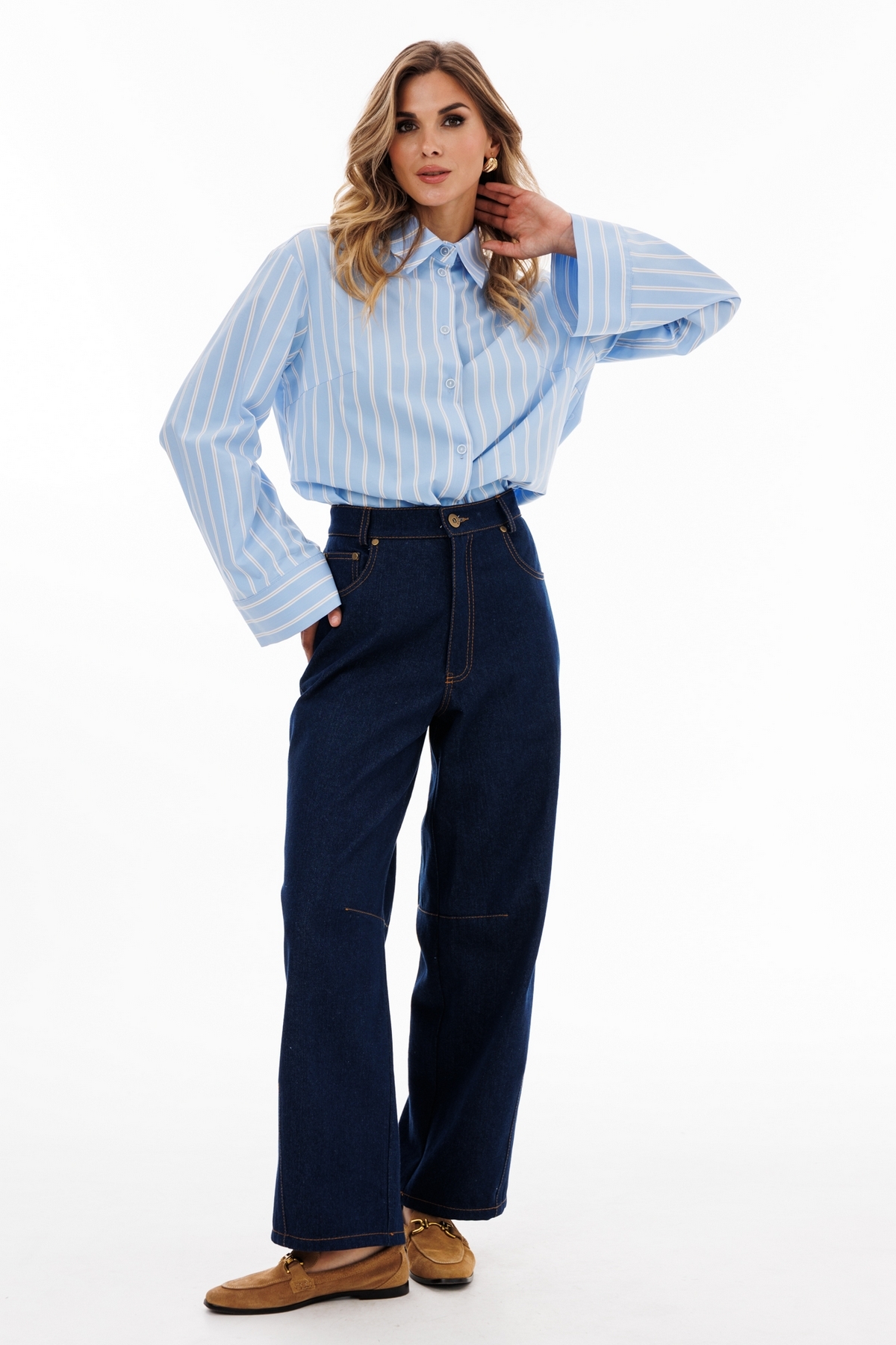 Джинсы-багги выполнены из плотного джинса. Брюки на притачном поясе, длиной до линии щиколотки, расширенные от бедер и слегка зауженные к низу. Спереди боковые карманы с фигурным входом. Застежка на пуговицу и молнию с гульфиком. На задних частях кокетки и накладные карманы. На передней и задней части коленные вытачки.