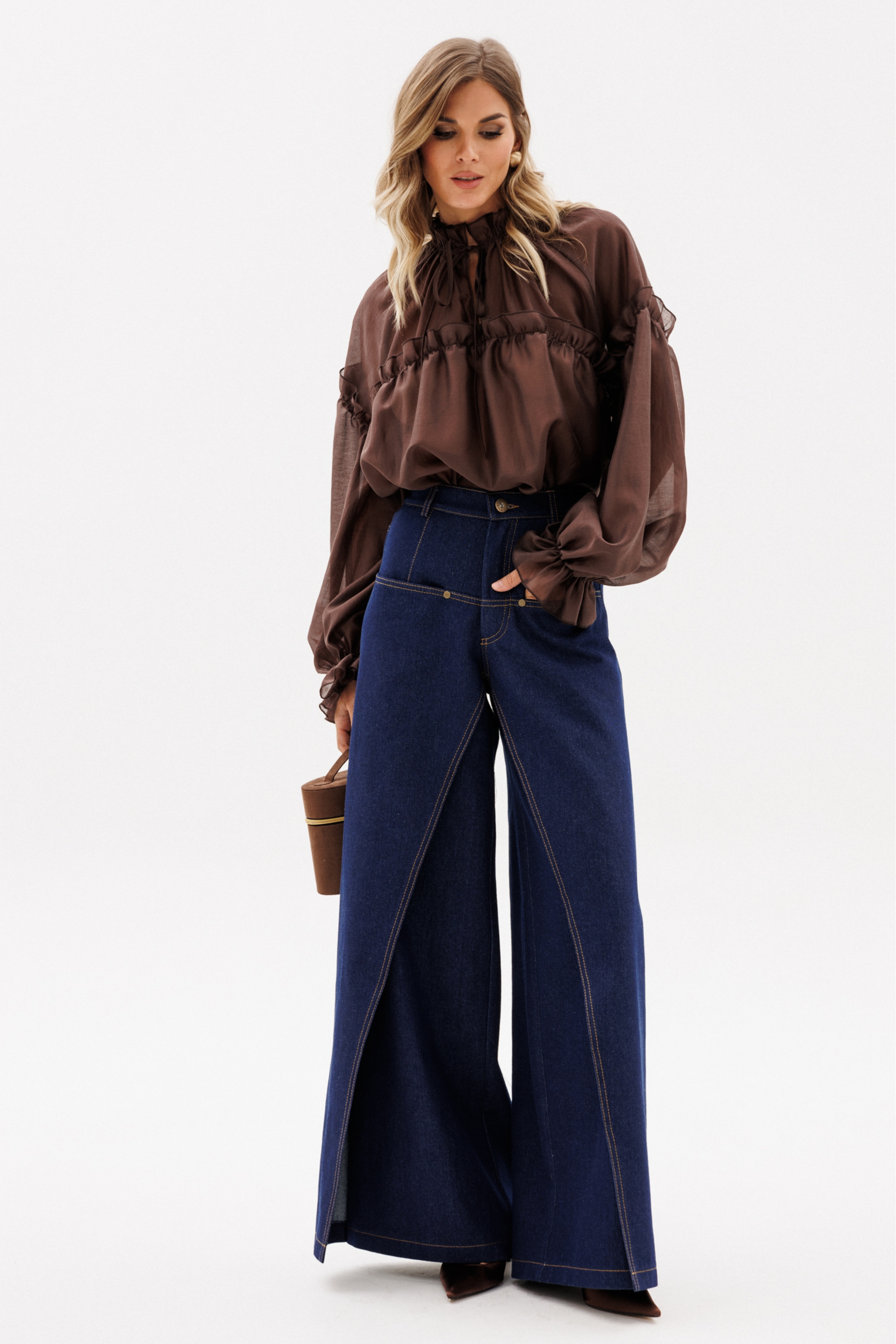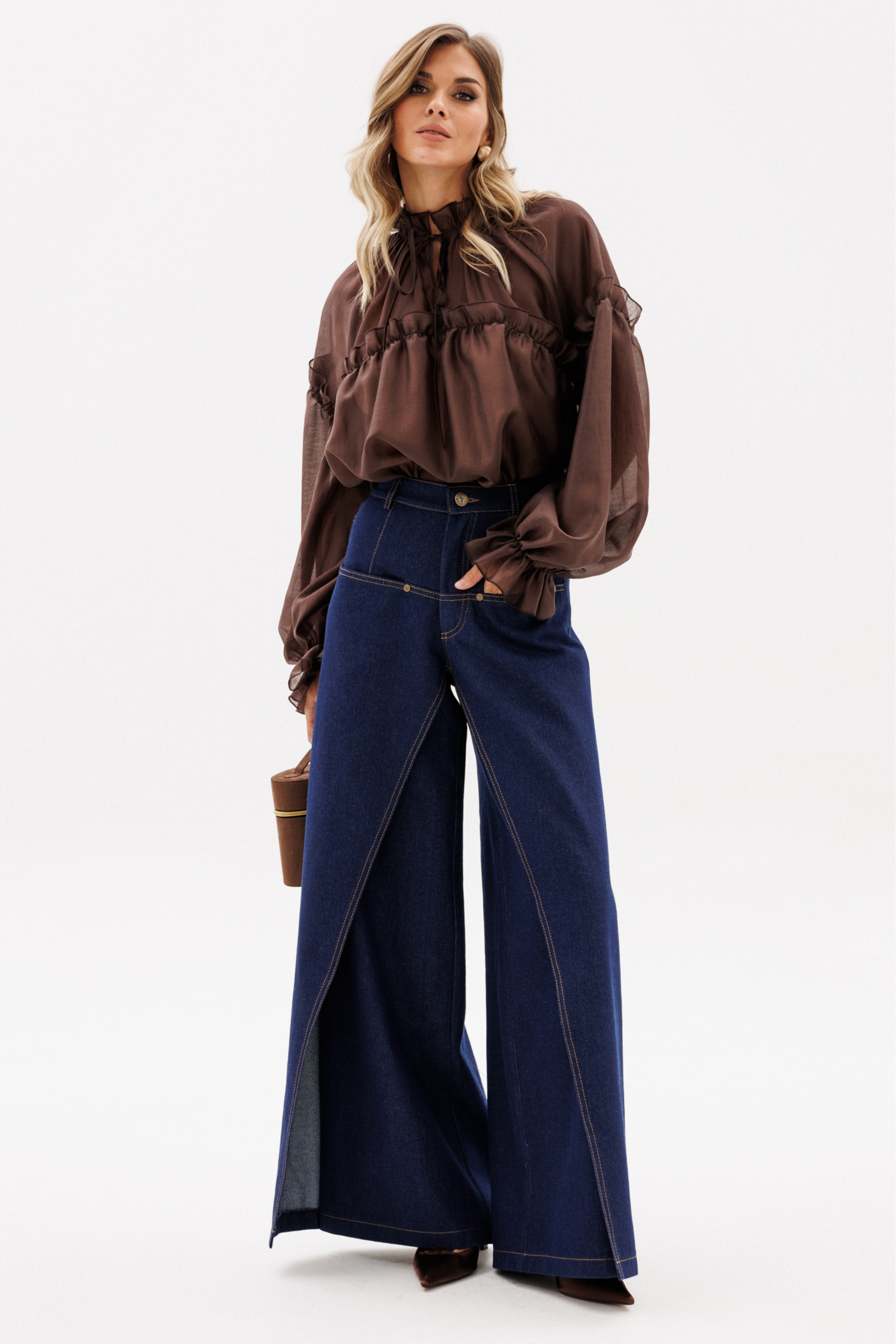 Брюки выполнены из плотного джинса. Брюки на притачном поясе, длиной до пола, расширенные к низу. Спереди верхние отлетные части, боковые карманы с фигурным входом. Застежка на пуговицу и молнию с гульфиком. На задних частях кокетки и накладные карманы. По переду брюки декорированы брендированной нашивкой из натуральной кожи.