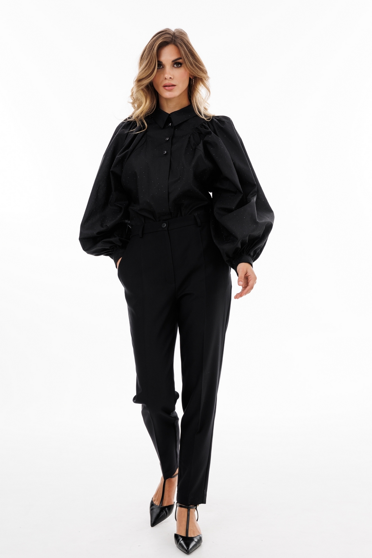 Брюки выполнены из костюмной ткани. Брюки зауженные к низу, длиной 7/8, на притачном поясе. Спереди боковые карманы с наклонным входом и застежка на молнию. Сзади декоративные карманы с листочкой.