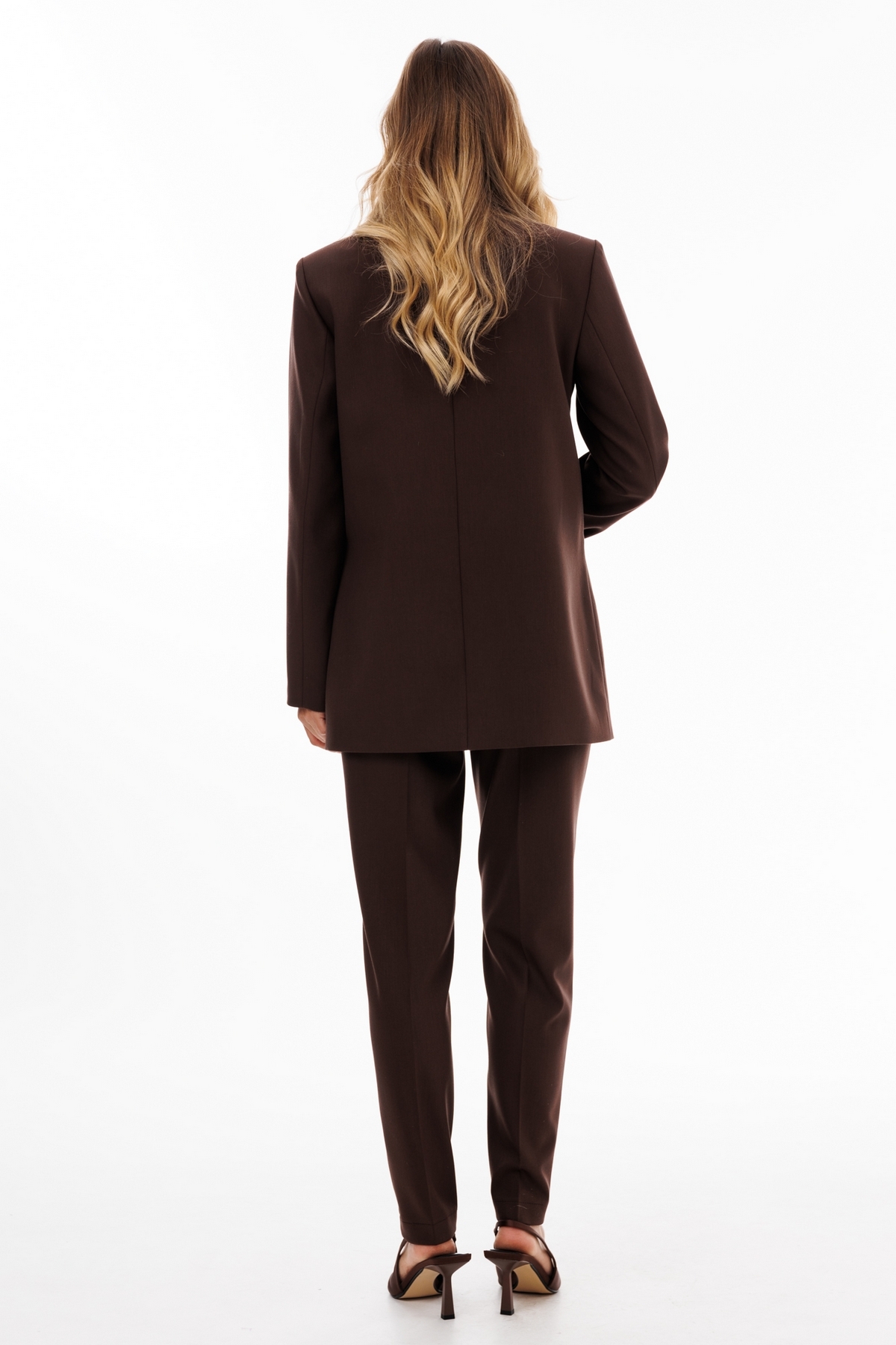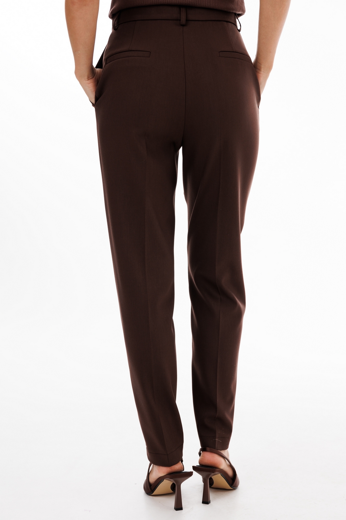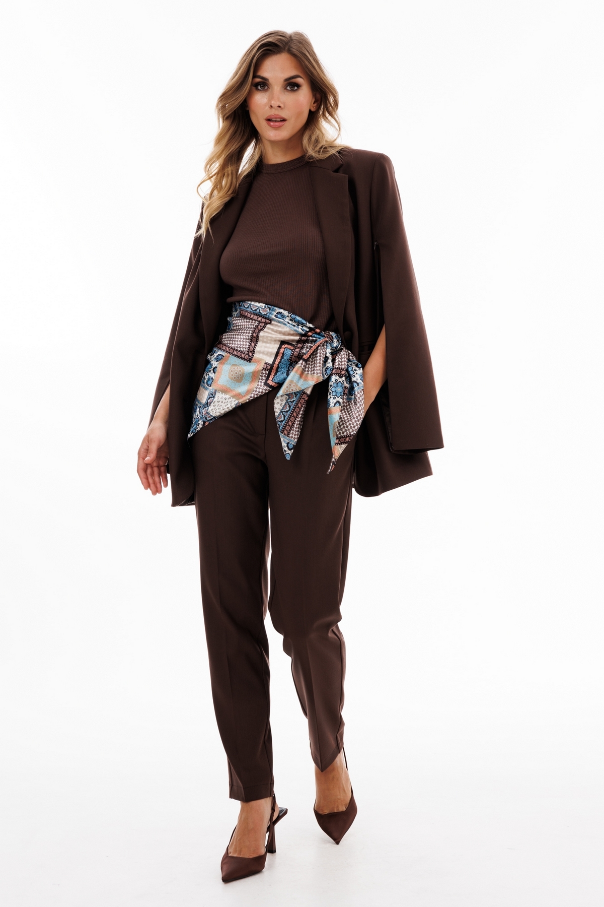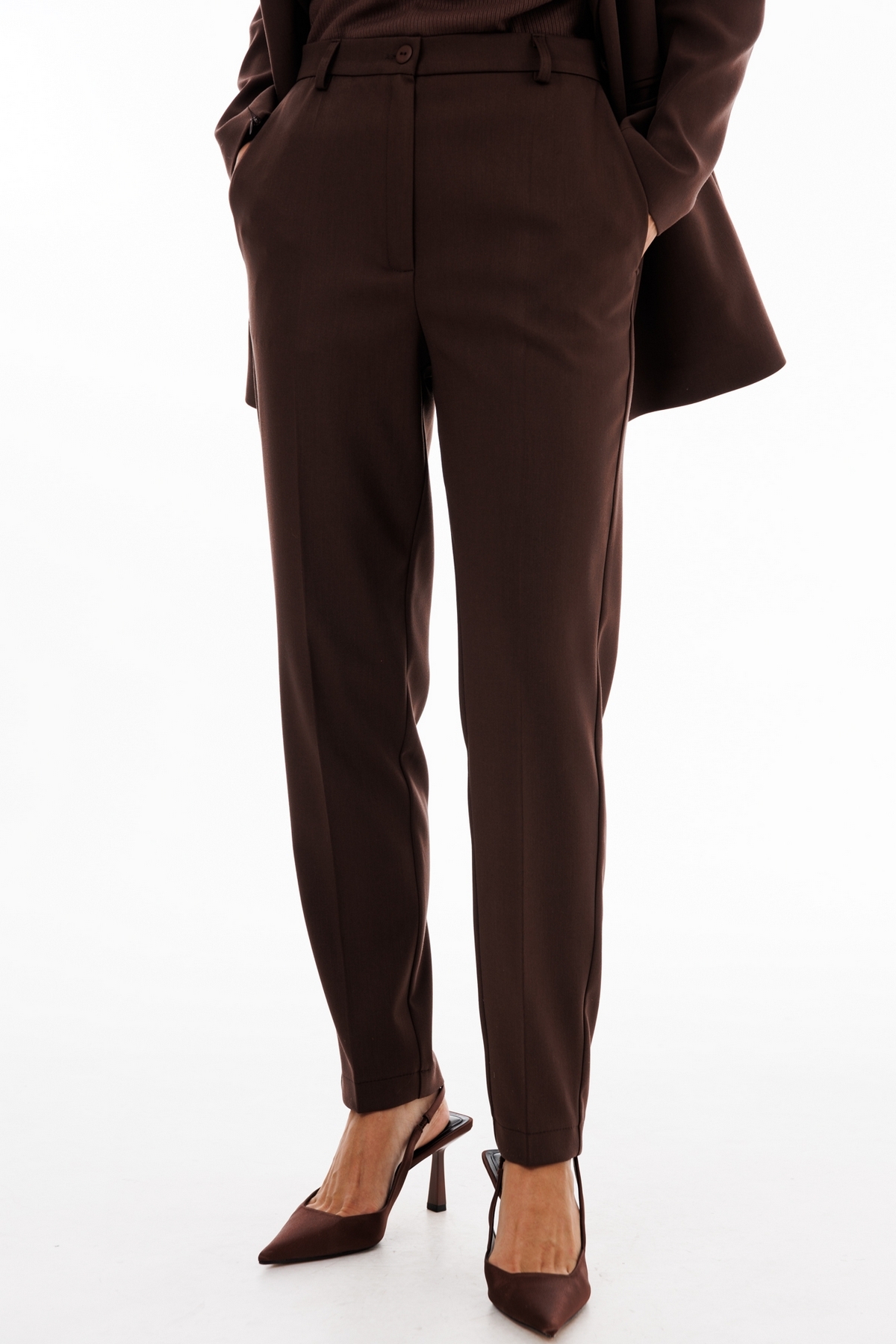 Брюки выполнены из костюмной ткани. Брюки зауженные к низу, длиной 7/8, на притачном поясе. Спереди боковые карманы с наклонным входом и застежка на молнию. Сзади декоративные карманы с листочкой.