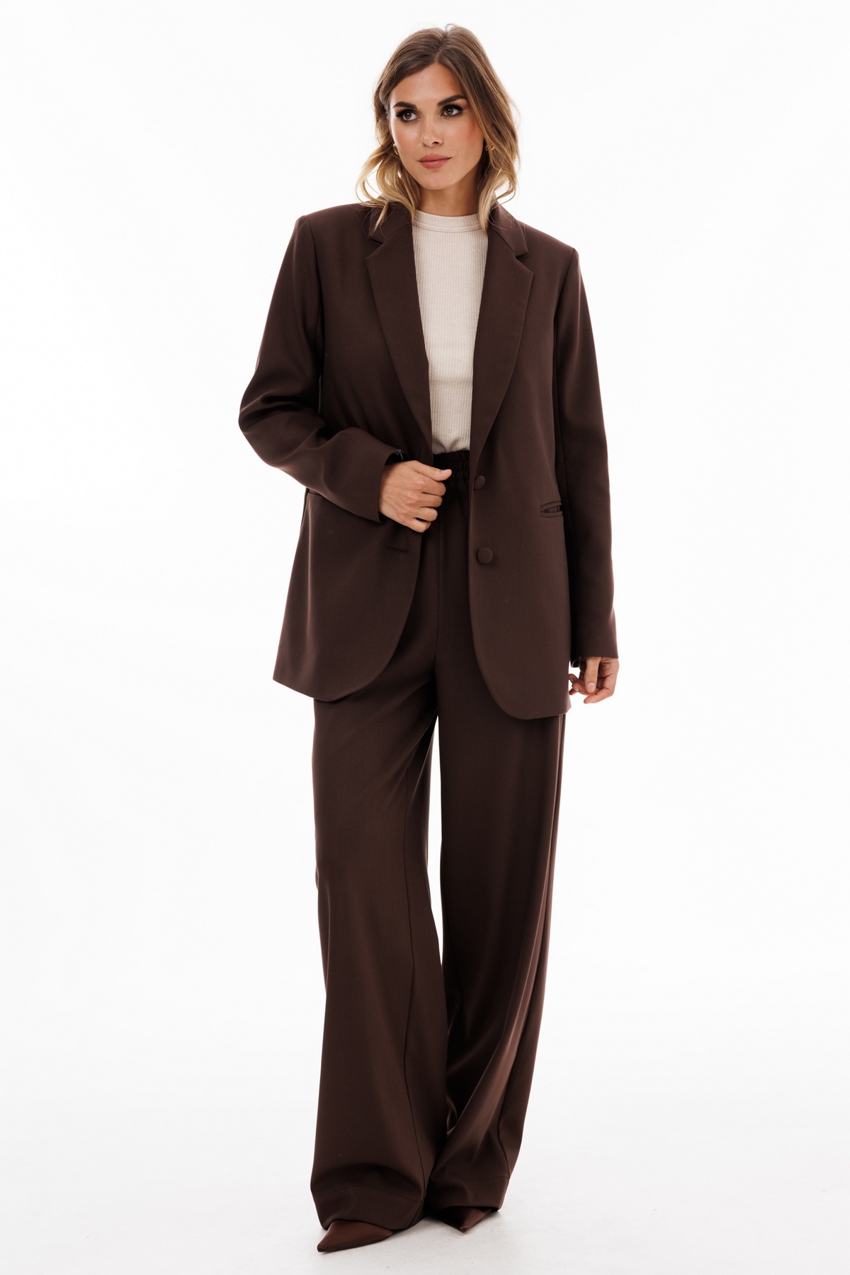 Брюки выполнены из костюмной ткани. Брюки прямого покроя длиной в пол, на притачном поясе с эластичной тесьмой. Спереди боковые карманы с наклонным входом.