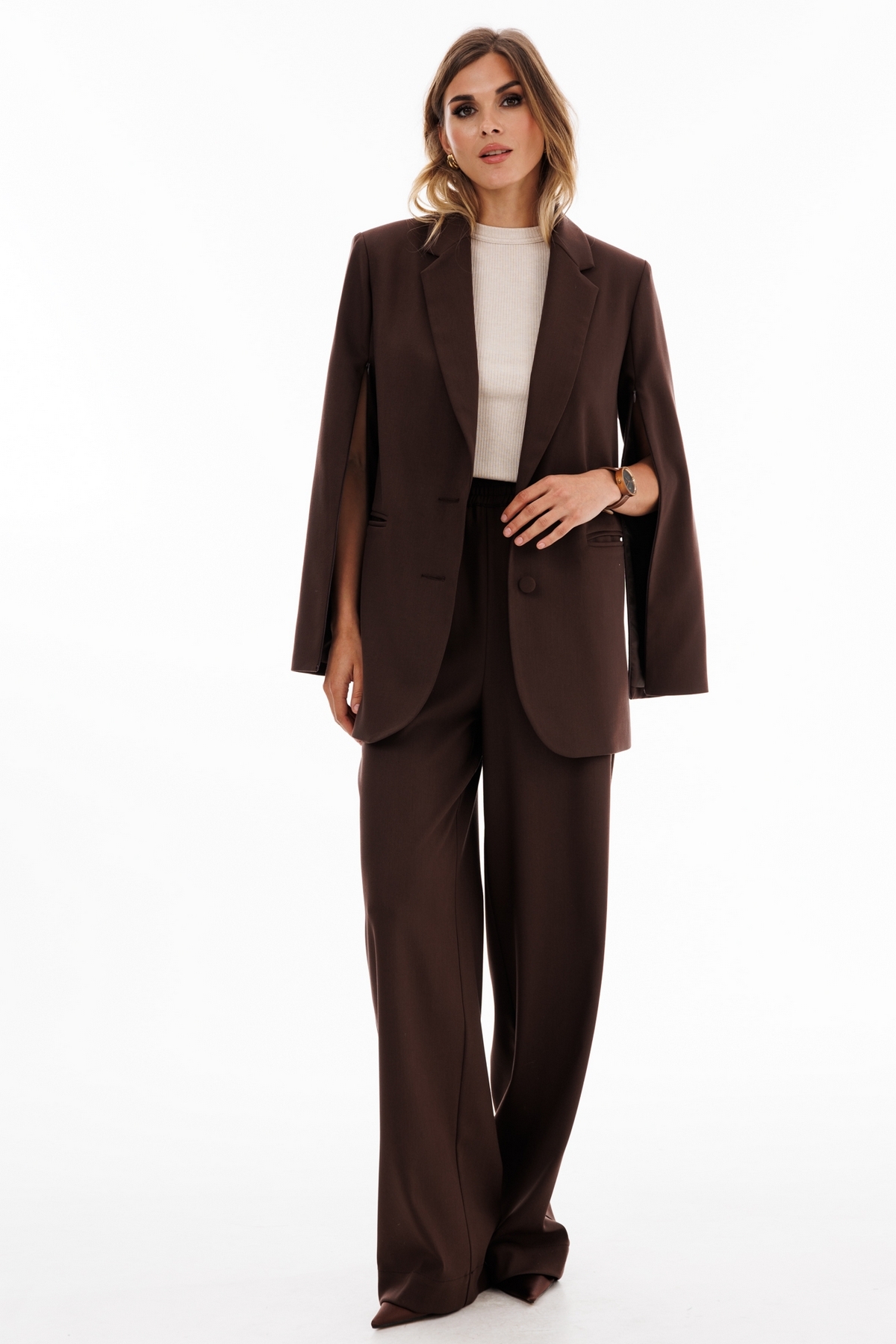 Брюки выполнены из костюмной ткани. Брюки прямого покроя длиной в пол, на притачном поясе с эластичной тесьмой. Спереди боковые карманы с наклонным входом.
