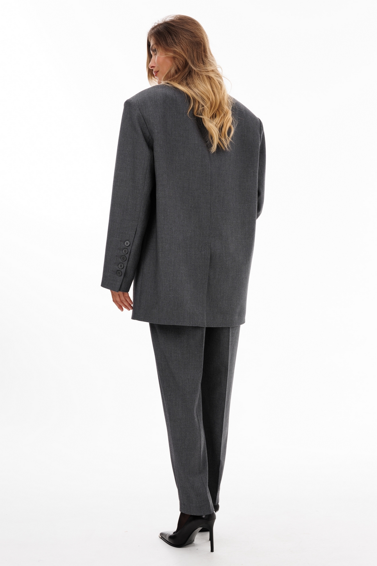 Брюки выполнены из костюмной ткани. Брюки зауженны к низу, длиной 7/8, на притачном поясе. Спереди боковые карманы с наклонным входом и застежка на пуговицу и молнию. Сзади талиевые вытачки и декоративные прорезные карманы. По задней части пояса эластичная тесьма.
