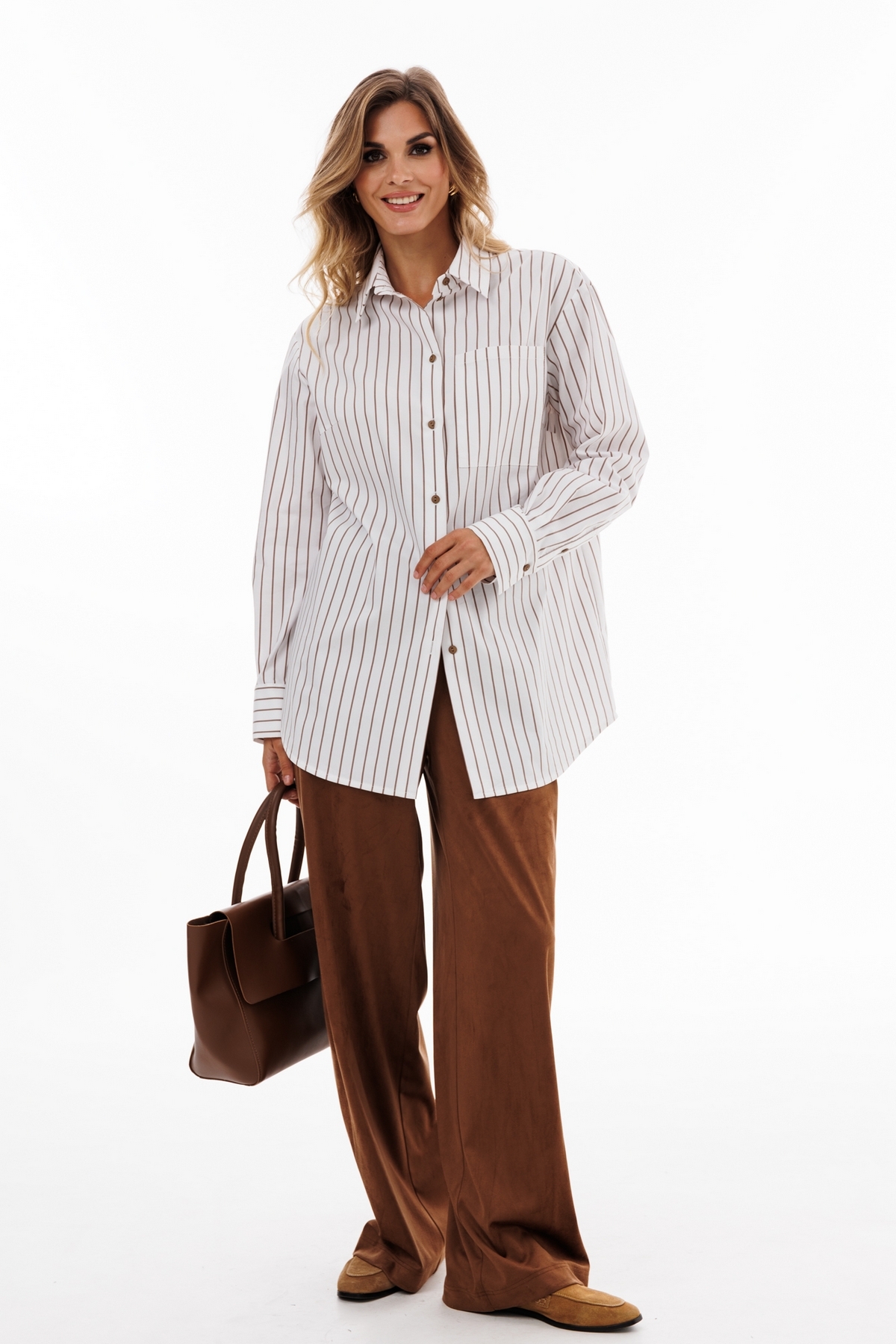 Брюки выполнены из тонкой искусственной замши. Брюки прямого покроя длиной в пол, на притачном поясе с эластичной тесьмой. Спереди боковые карманы с наклонным входом.