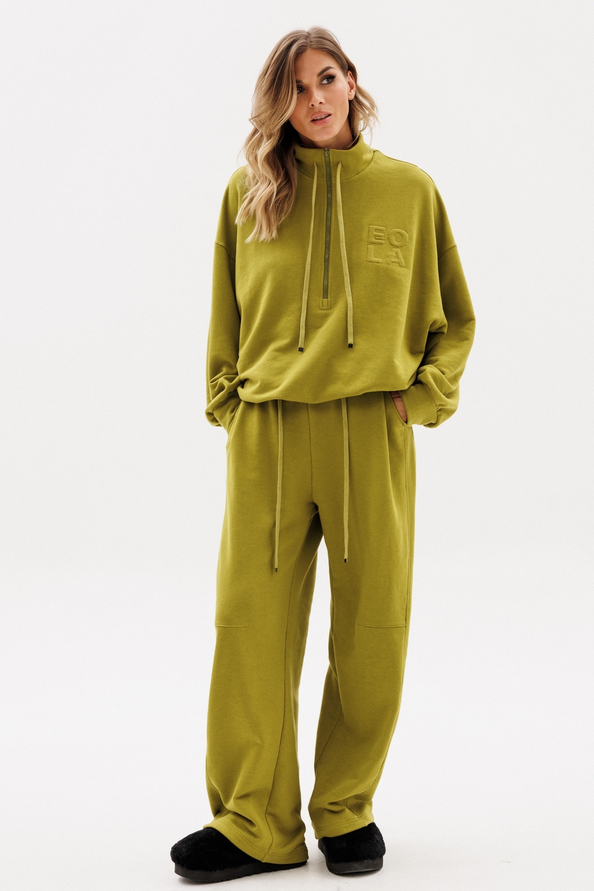 Комплект: джемпер+брюки. Комплект выполнен из трикотажного полотна. Джемпер прямого силуэта, покроя "oversize" длиной до линии бедер. Спереди застежка на молнию. Воротник-стойка. Плечевой шов удлинен. Рукав рубашечного покроя, одношовный, расширенный и присборенный к низу. Низ рукава на притачной манжете. Низ джемпера на эластичной тесьме с фиксаторами. Джемпер декорирован вышивкой по переду. Брюки прямого силуэта, длиной в пол, на притачном поясе с эластичной тесьмой. Спереди боковые карманы с фигурным входом, петли в поясе, в которые втянут шнур из основной ткани, коленные вытачки, складки. Сзади справа накладной карман.