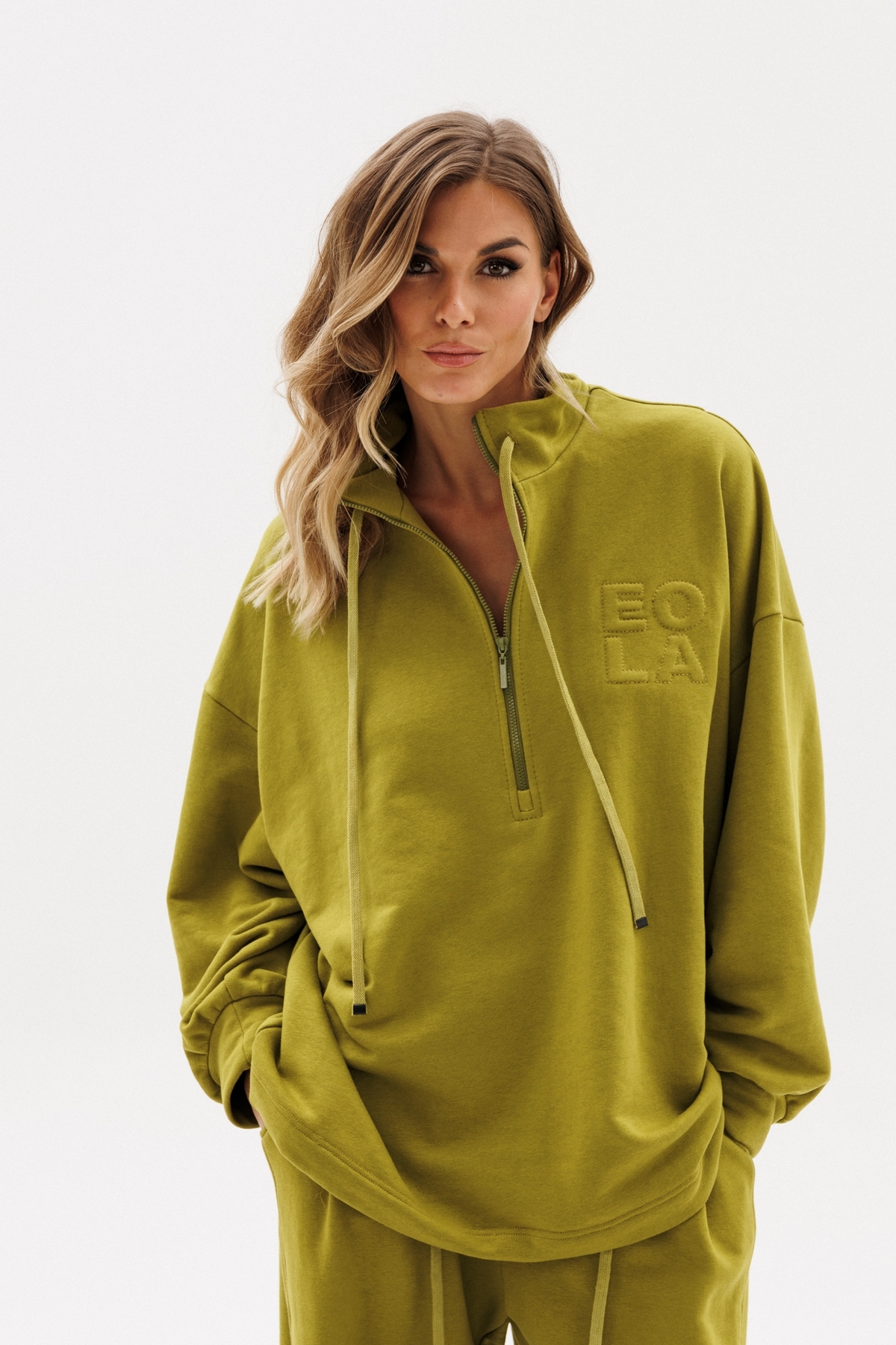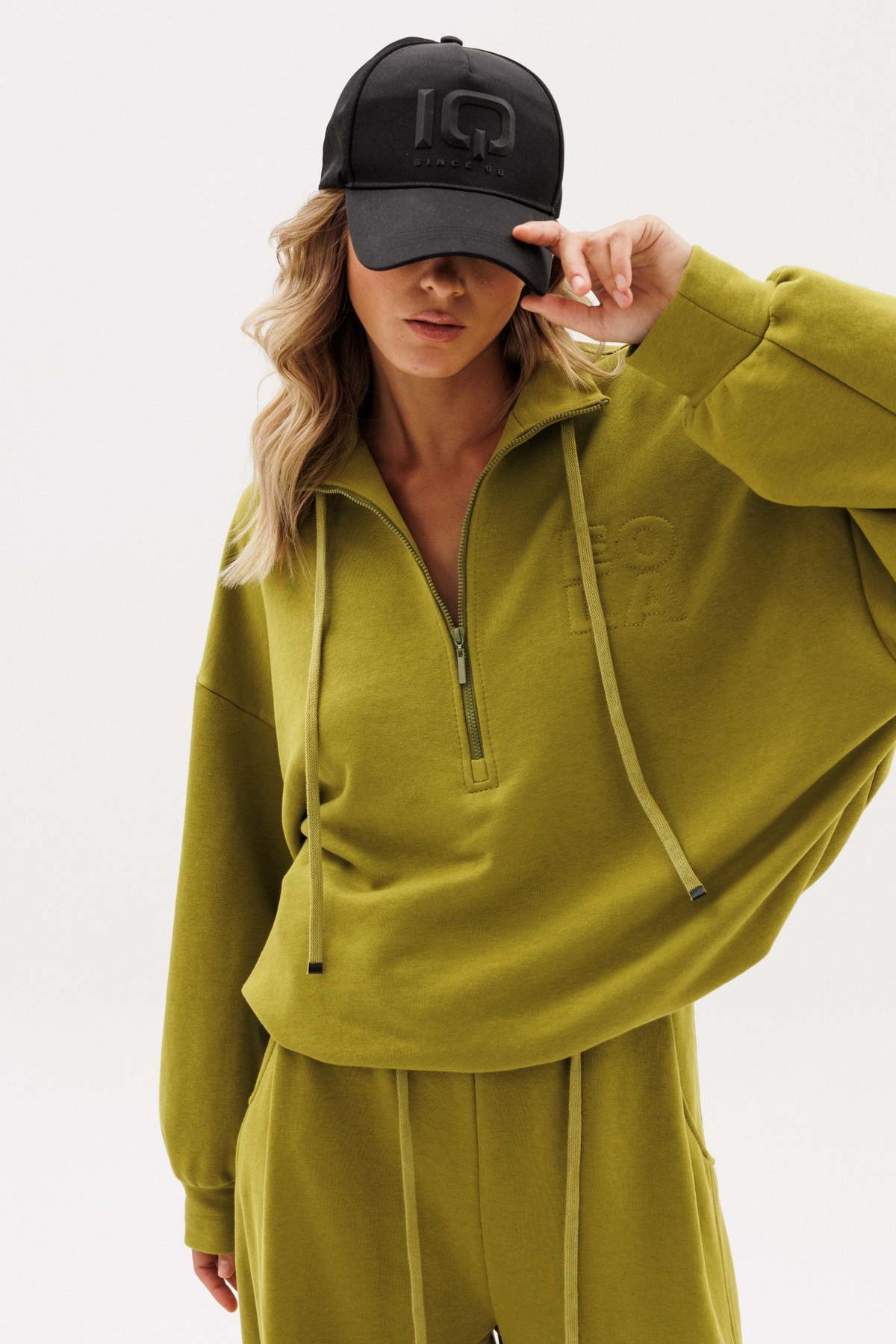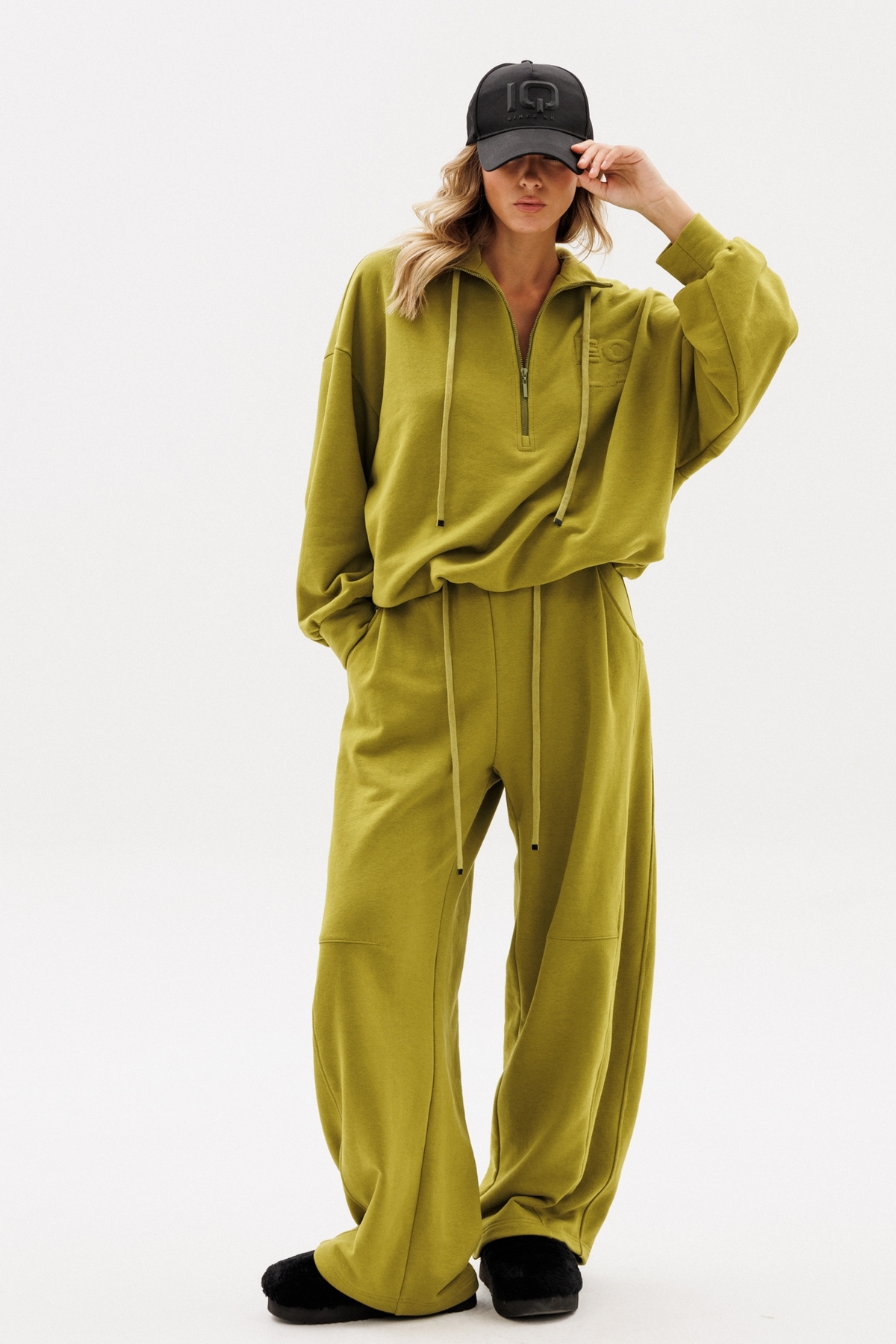 Комплект: джемпер+брюки. Комплект выполнен из трикотажного полотна. Джемпер прямого силуэта, покроя "oversize" длиной до линии бедер. Спереди застежка на молнию. Воротник-стойка. Плечевой шов удлинен. Рукав рубашечного покроя, одношовный, расширенный и присборенный к низу. Низ рукава на притачной манжете. Низ джемпера на эластичной тесьме с фиксаторами. Джемпер декорирован вышивкой по переду. Брюки прямого силуэта, длиной в пол, на притачном поясе с эластичной тесьмой. Спереди боковые карманы с фигурным входом, петли в поясе, в которые втянут шнур из основной ткани, коленные вытачки, складки. Сзади справа накладной карман.