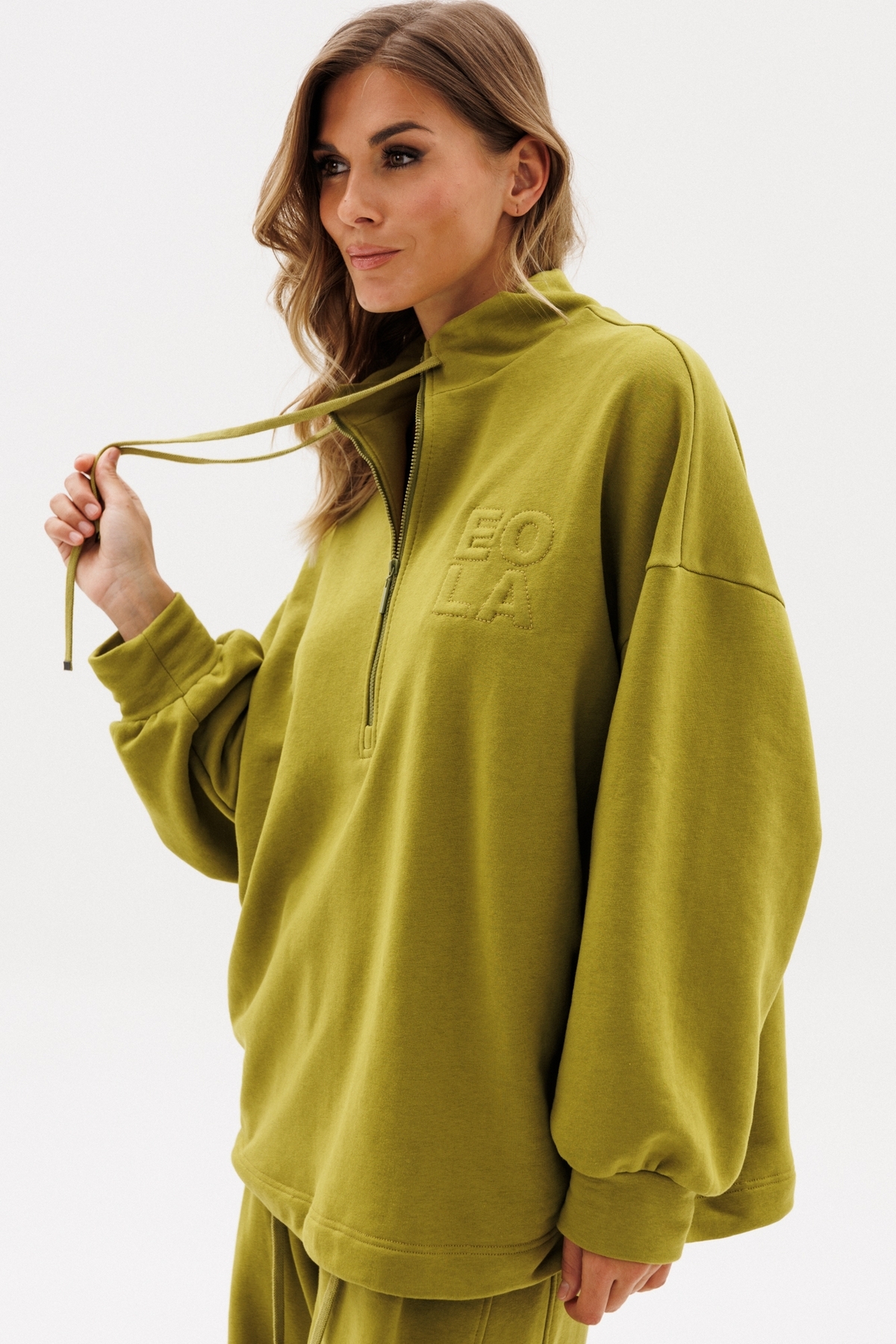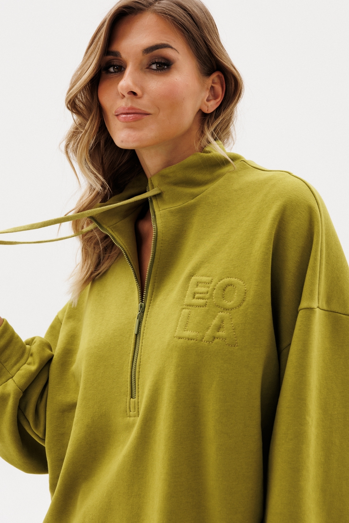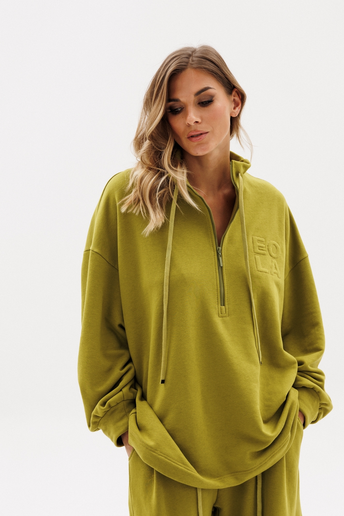 Комплект: джемпер+брюки. Комплект выполнен из трикотажного полотна. Джемпер прямого силуэта, покроя "oversize" длиной до линии бедер. Спереди застежка на молнию. Воротник-стойка. Плечевой шов удлинен. Рукав рубашечного покроя, одношовный, расширенный и присборенный к низу. Низ рукава на притачной манжете. Низ джемпера на эластичной тесьме с фиксаторами. Джемпер декорирован вышивкой по переду. Брюки прямого силуэта, длиной в пол, на притачном поясе с эластичной тесьмой. Спереди боковые карманы с фигурным входом, петли в поясе, в которые втянут шнур из основной ткани, коленные вытачки, складки. Сзади справа накладной карман.