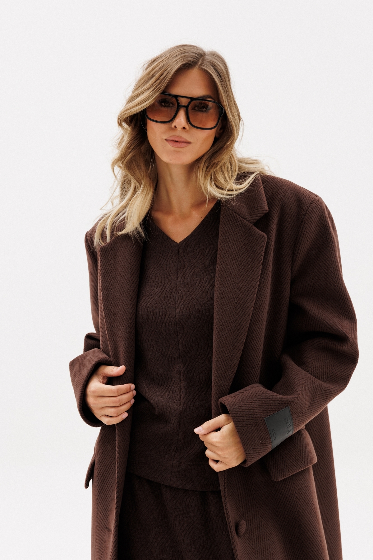 Пальто выполнено из пальтовой ткани в рубчик. Пальто прямого силуэта, длиной до линии щиколотки. Спереди застежка на две пуговицы, горизонтальные прорезные карманы. Спинка со средним швом со шлицей по низу. Воротник пиджачного типа. Плечевой шов удлинен. Рукав втачной, двухшовный. Пальто на притачной по низу подкладке. Пальто декорировано по рукаву нашивкой из натуральной кожи.