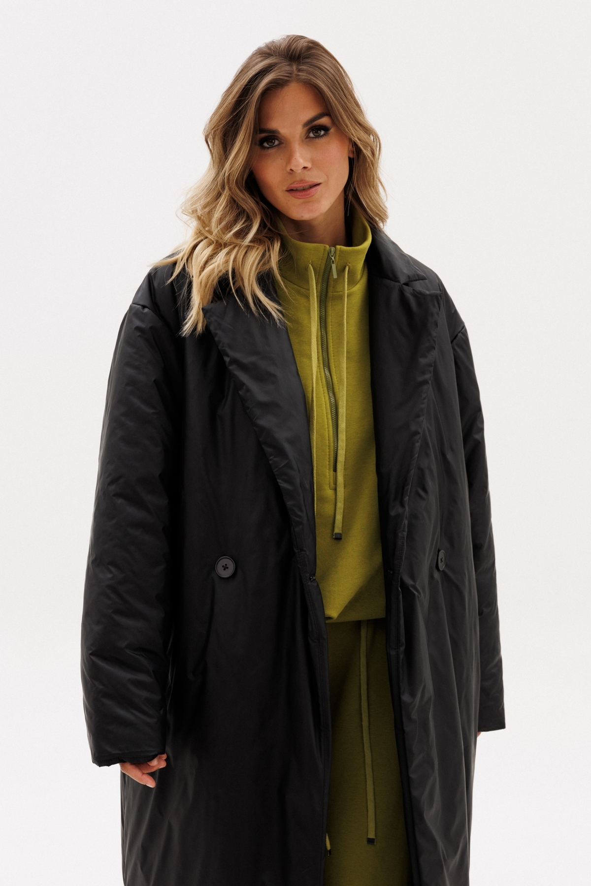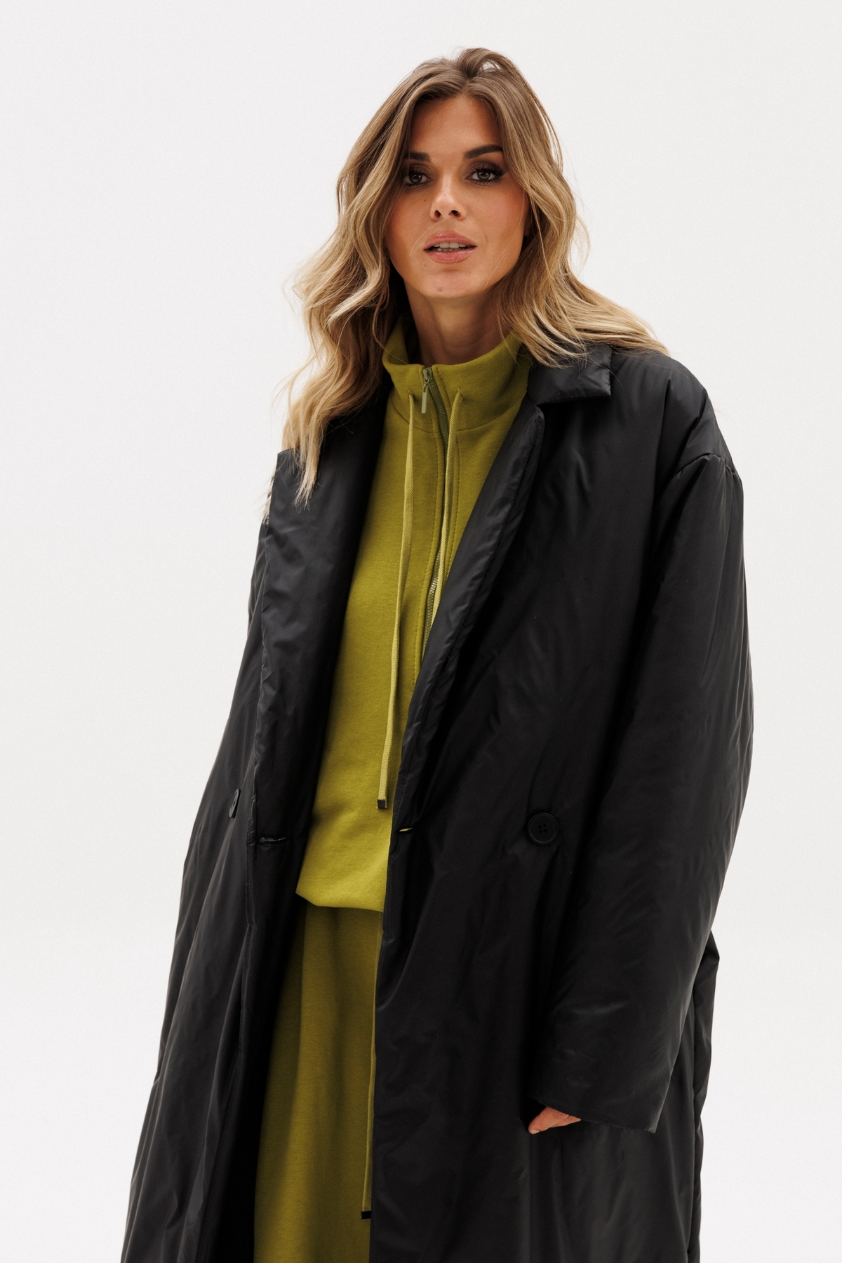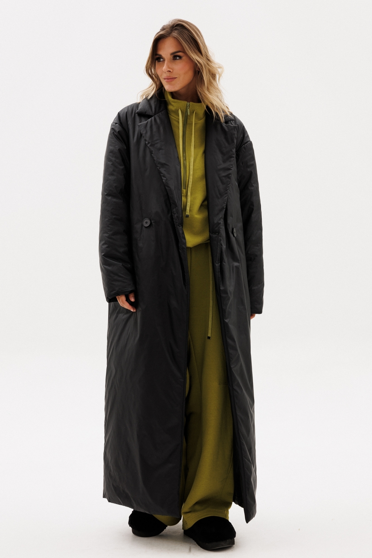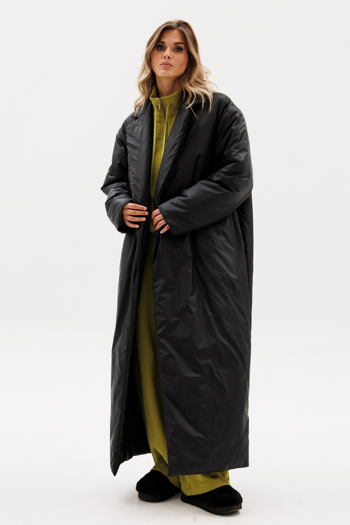 Пальто выполнено из плащевой ткани с утеплителем Isosoft. Пальто прямого силуэта, длиной до линии щиколотки. Спереди двубортная застежка на один ряд пуговиц и прорезные карманы в швах. Спинка со средним швом. Плечевой шов спущен. Воротник пиджачного типа. Рукав рубашечного покроя, двухшовный. Пальто на притачной по низу подкладке. Пояс из основной ткани входит в комплект.