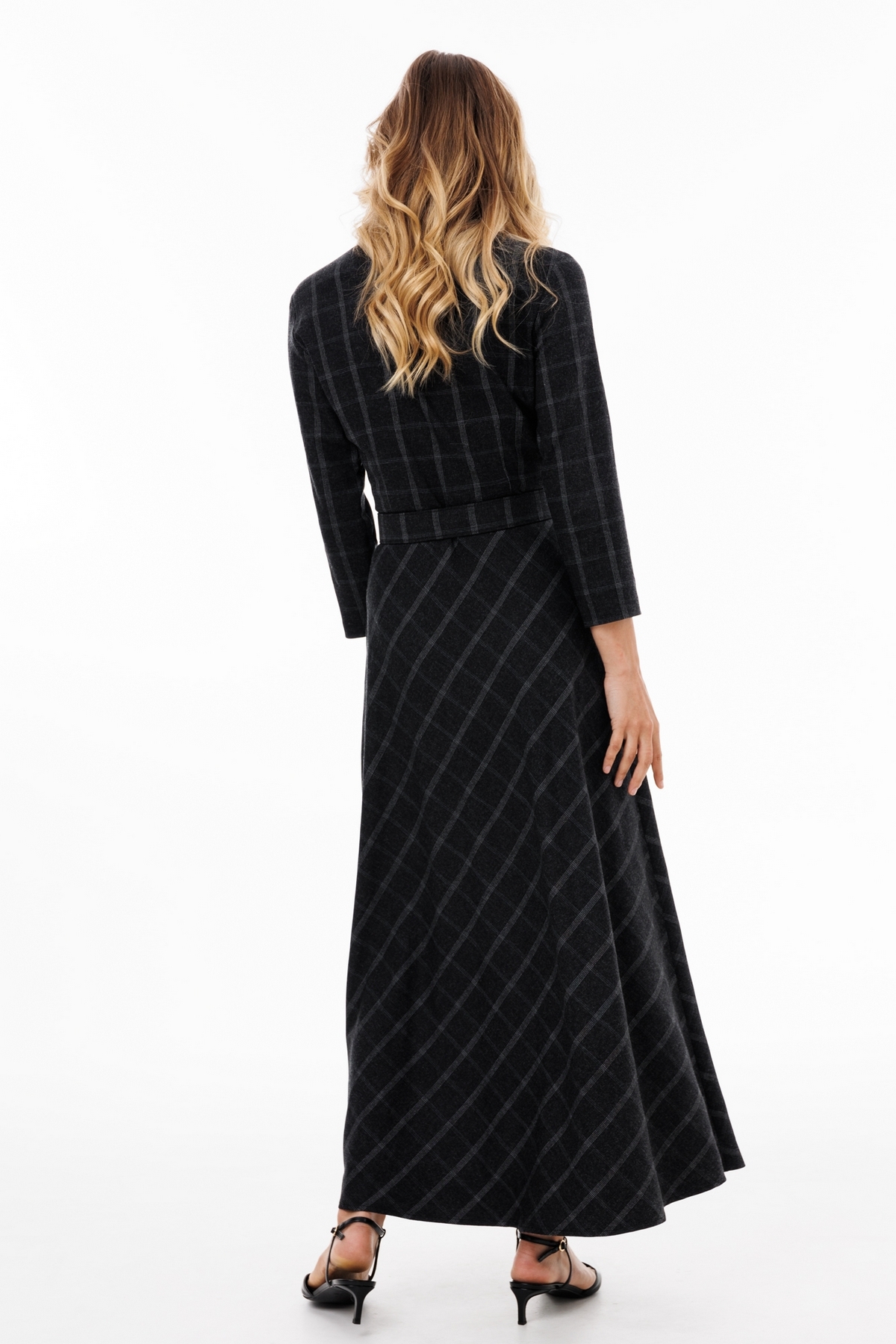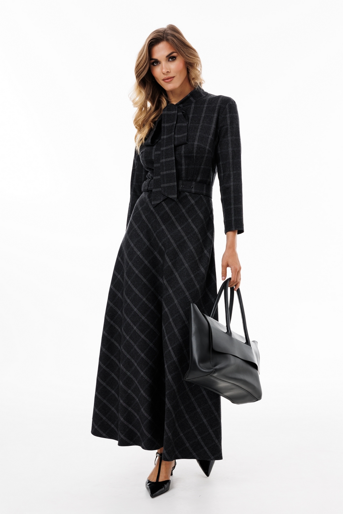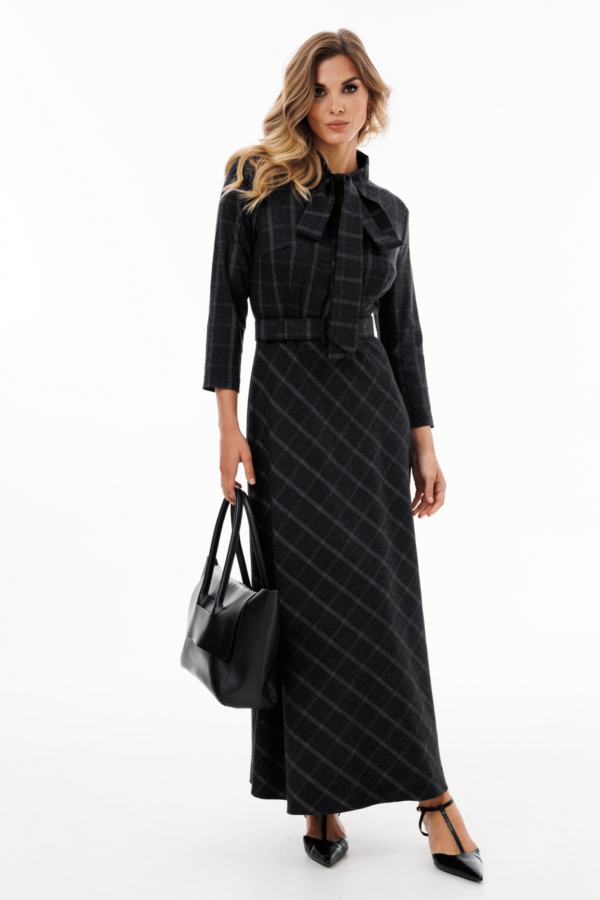 Платье выполнено из костюмной ткани в клетку. Платье Х-образного силуэта, длиной миди. Платье отрезное по линии талии. Спереди горловина V-образной формы, застежка на пуговицы. Воротник стойка, переходящий в бант. Рукав втачной одношовный, длиной 3/4. Юбка покроена по косой. В левом боковом шве застежка на потайную молнию. В комплект входит ремень из основной ткани с обтяжной пряжкой.