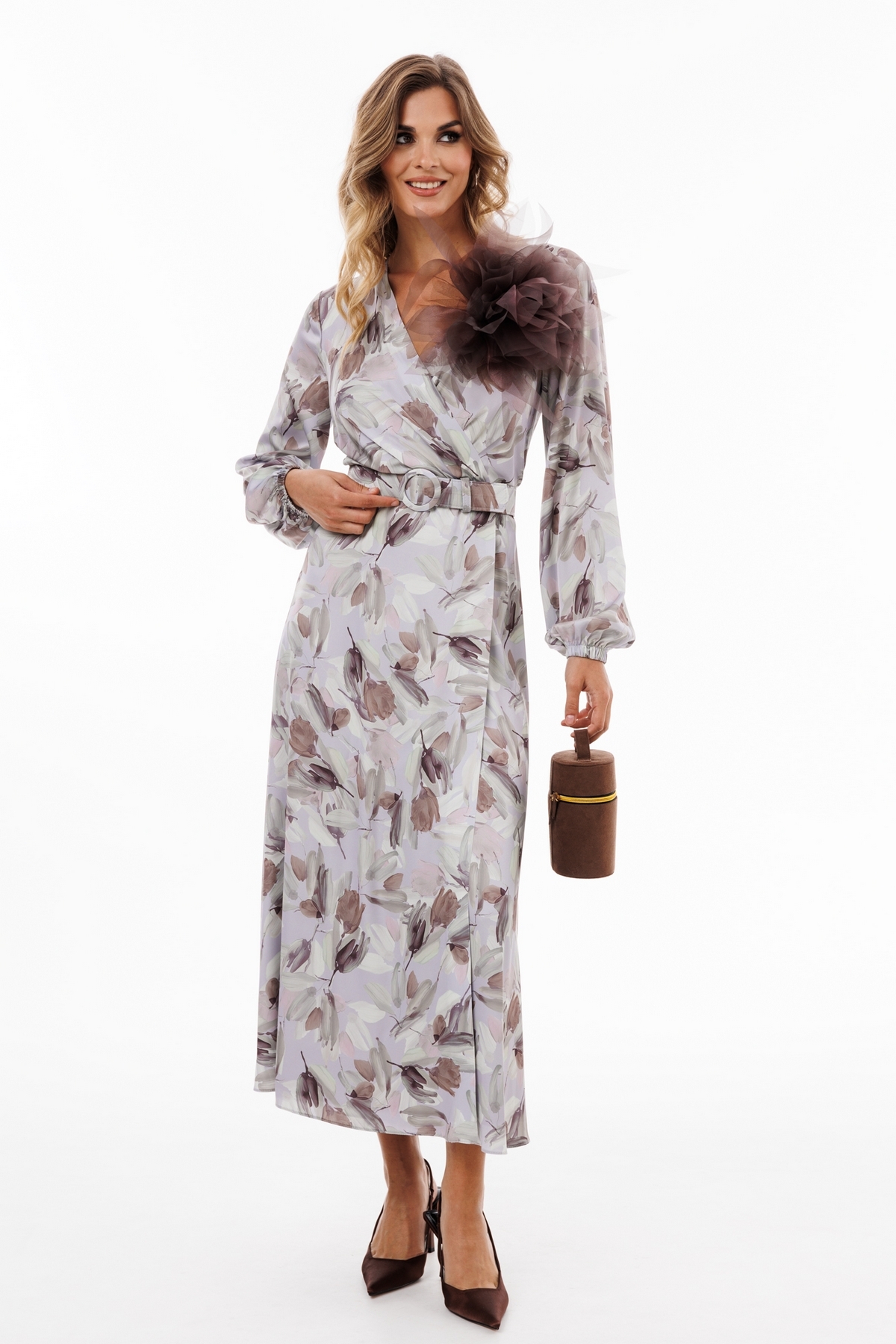 Платье выполнено из креп-атласа с принтом. Платье Х-образного силуэта, отрезное по линии талии, длиной миди. Перед выполнен "на запах" со складками по линии талии. Спинка цельная. Вырез V-образной формы. Рукав втачной, одношовный, с напуском. Низ рукава собран на эластичной тесьме. Юбка расширена к низу. Платье на отлетной по низу атласной подкладке. В комплект входит съемный ремень с обтяжной пряжкой.