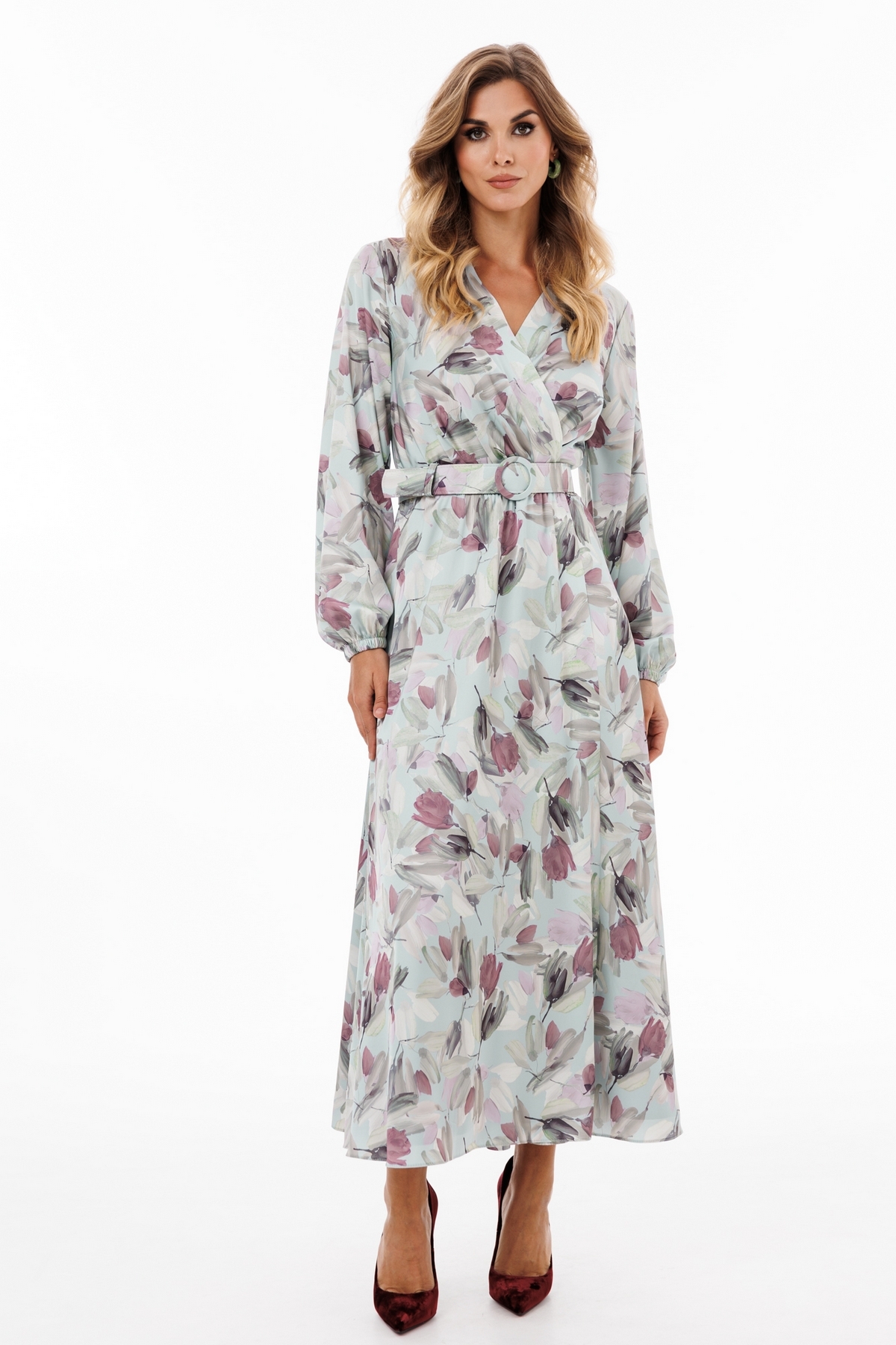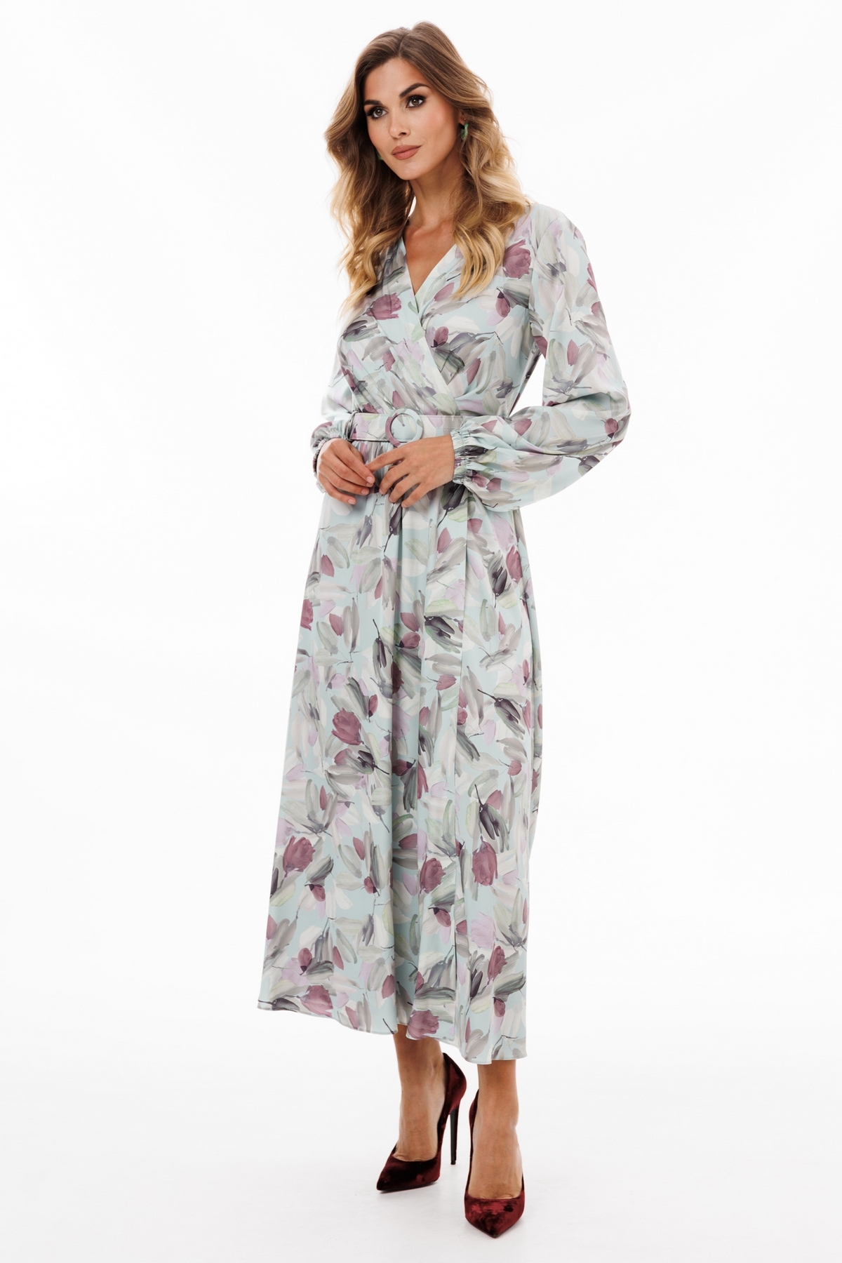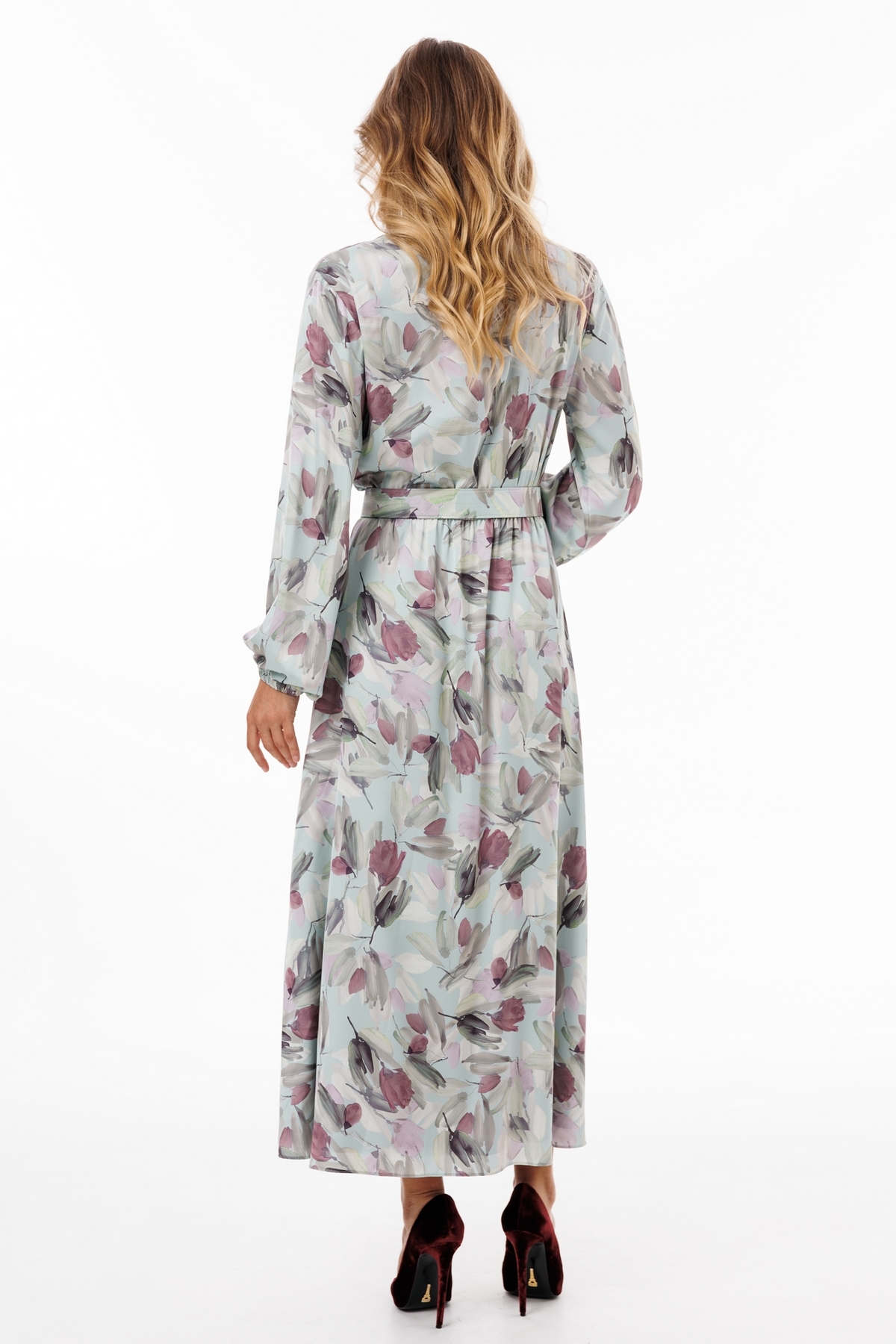 Платье выполнено из креп-атласа с принтом. Платье Х-образного силуэта, отрезное по линии талии, длиной миди. Перед выполнен "на запах" со складками по линии талии. Спинка цельная. Вырез V-образной формы. Рукав втачной, одношовный, с напуском. Низ рукава собран на эластичной тесьме. Юбка расширена к низу. Платье на отлетной по низу атласной подкладке. В комплект входит съемный ремень с обтяжной пряжкой.