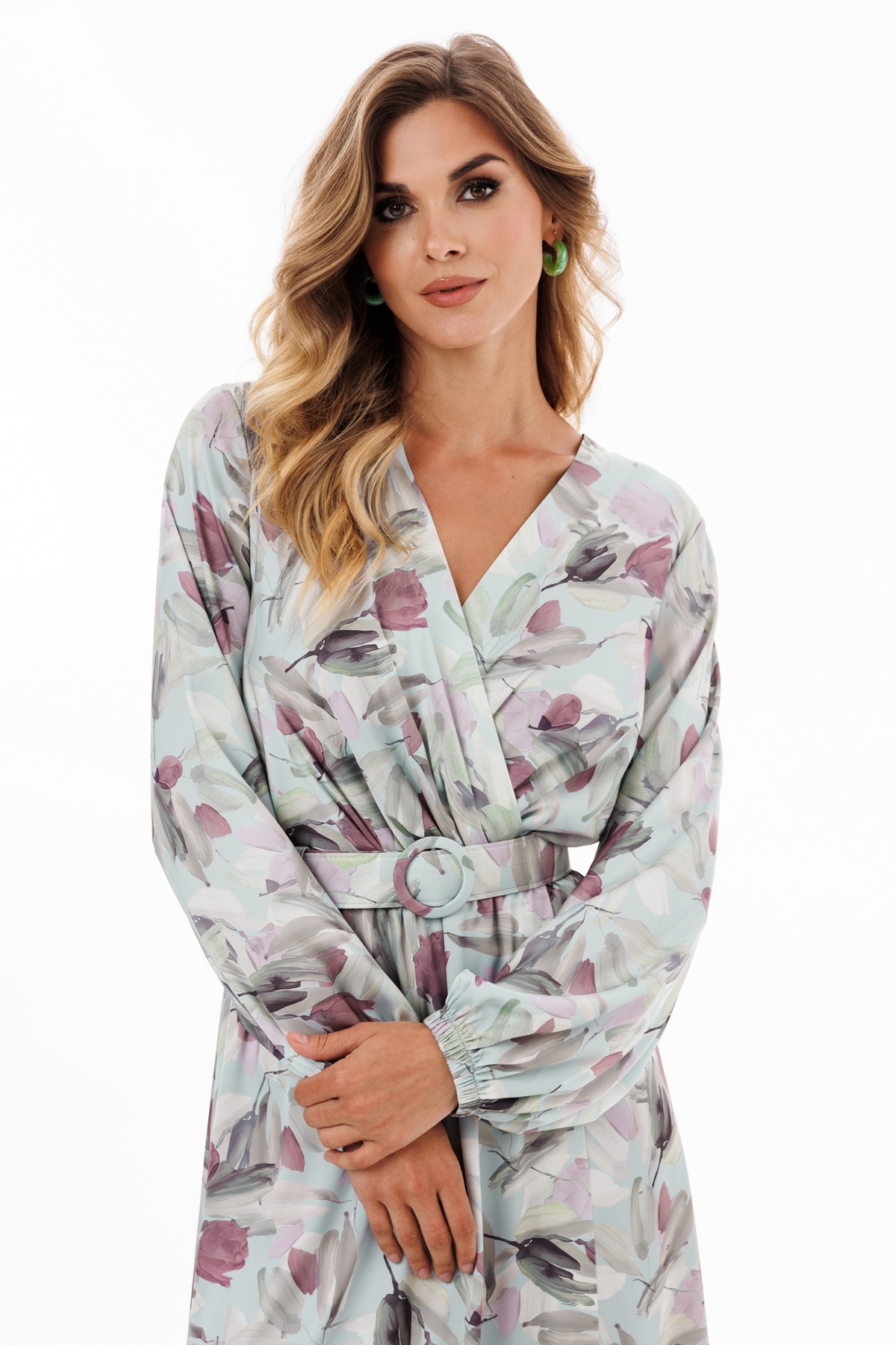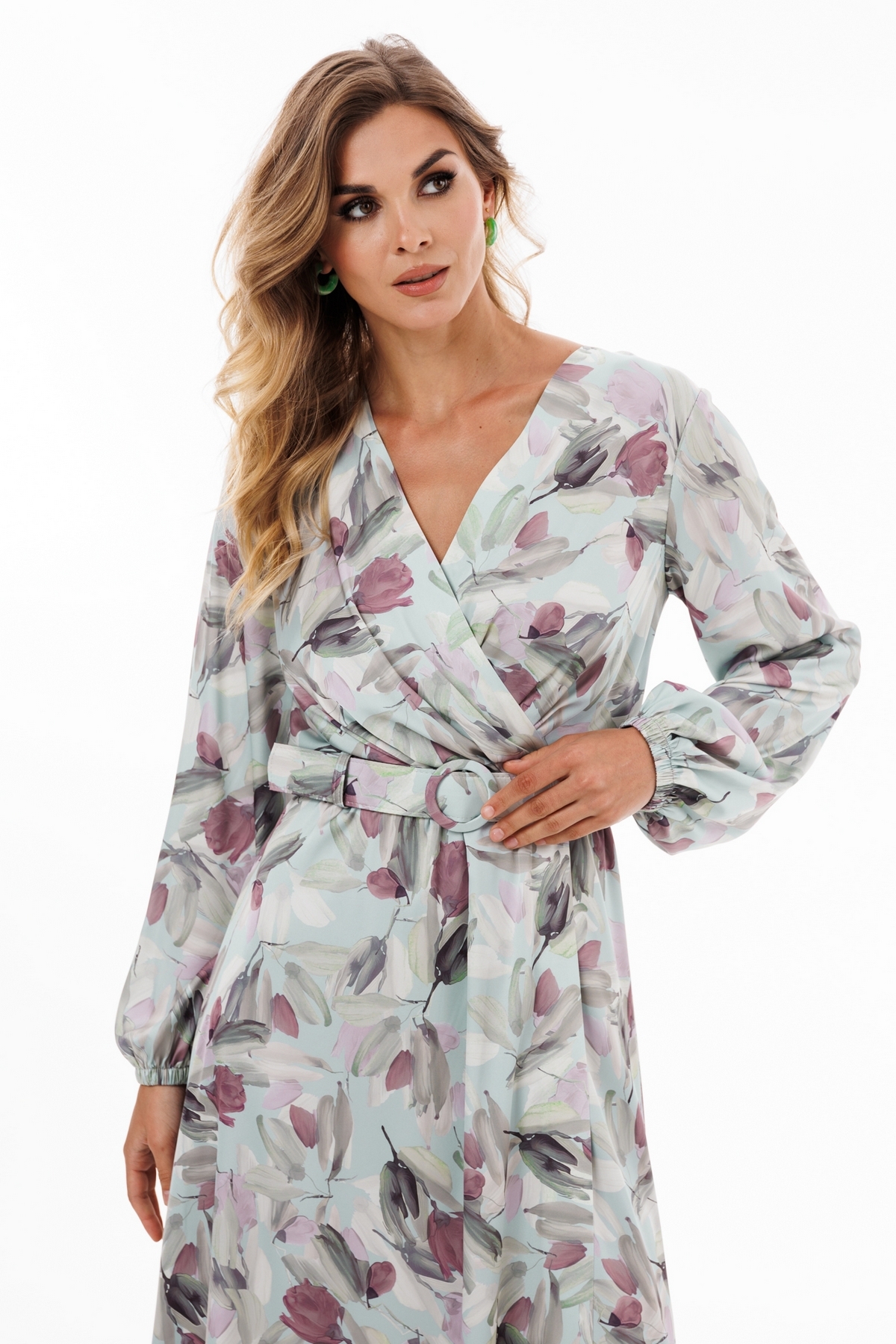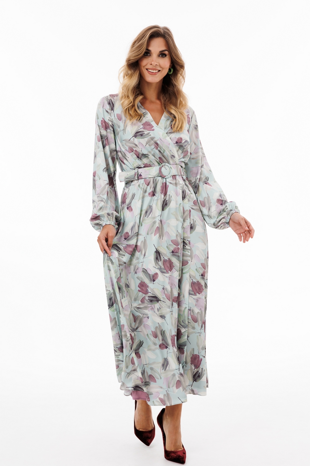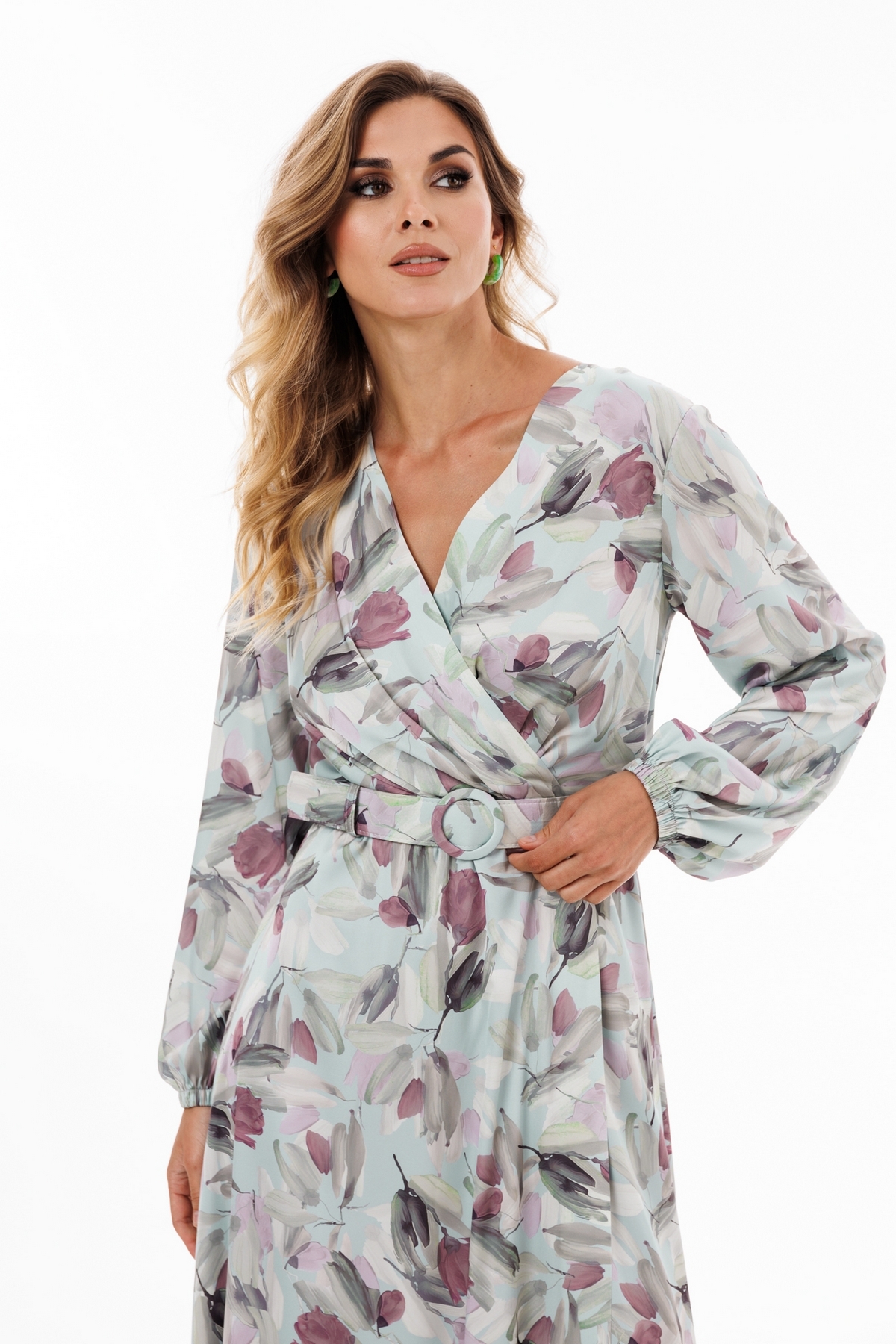 Платье выполнено из креп-атласа с принтом. Платье Х-образного силуэта, отрезное по линии талии, длиной миди. Перед выполнен "на запах" со складками по линии талии. Спинка цельная. Вырез V-образной формы. Рукав втачной, одношовный, с напуском. Низ рукава собран на эластичной тесьме. Юбка расширена к низу. Платье на отлетной по низу атласной подкладке. В комплект входит съемный ремень с обтяжной пряжкой.