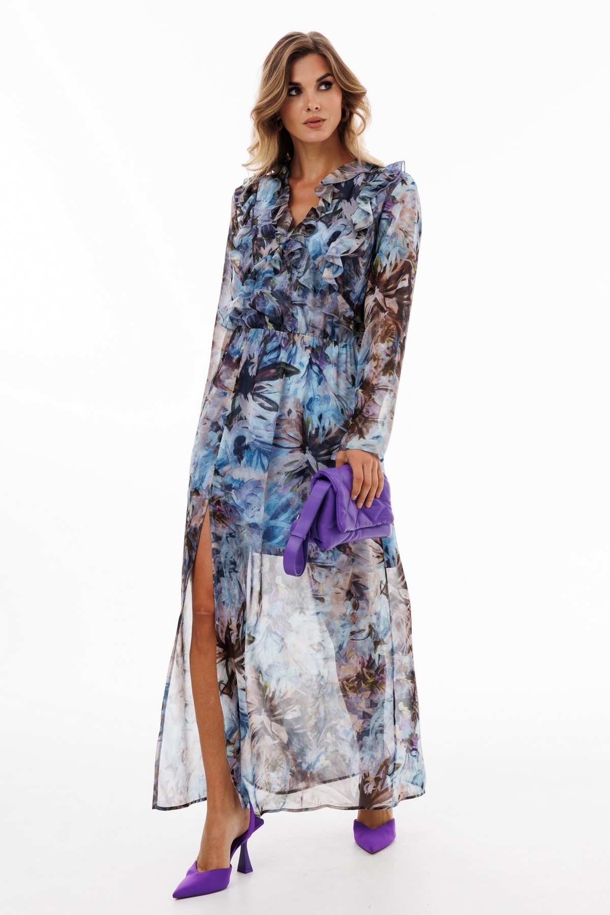 Платье выполнено из шифона с цветочным принтом. Платье Х-образного силуэта, длиной миди. Платье отрезное по линии талии. Спереди рельефы и фигурные подрезы, в которых обработаны волны. Горловина V-образной формы. Горловина обработана волнами. Рукав втачной одношовный. Юбка слегка расширена к низу. Спереди справа разрез. По линии талии эластичная тесьма. Платье на отлетной по низу подкладке.