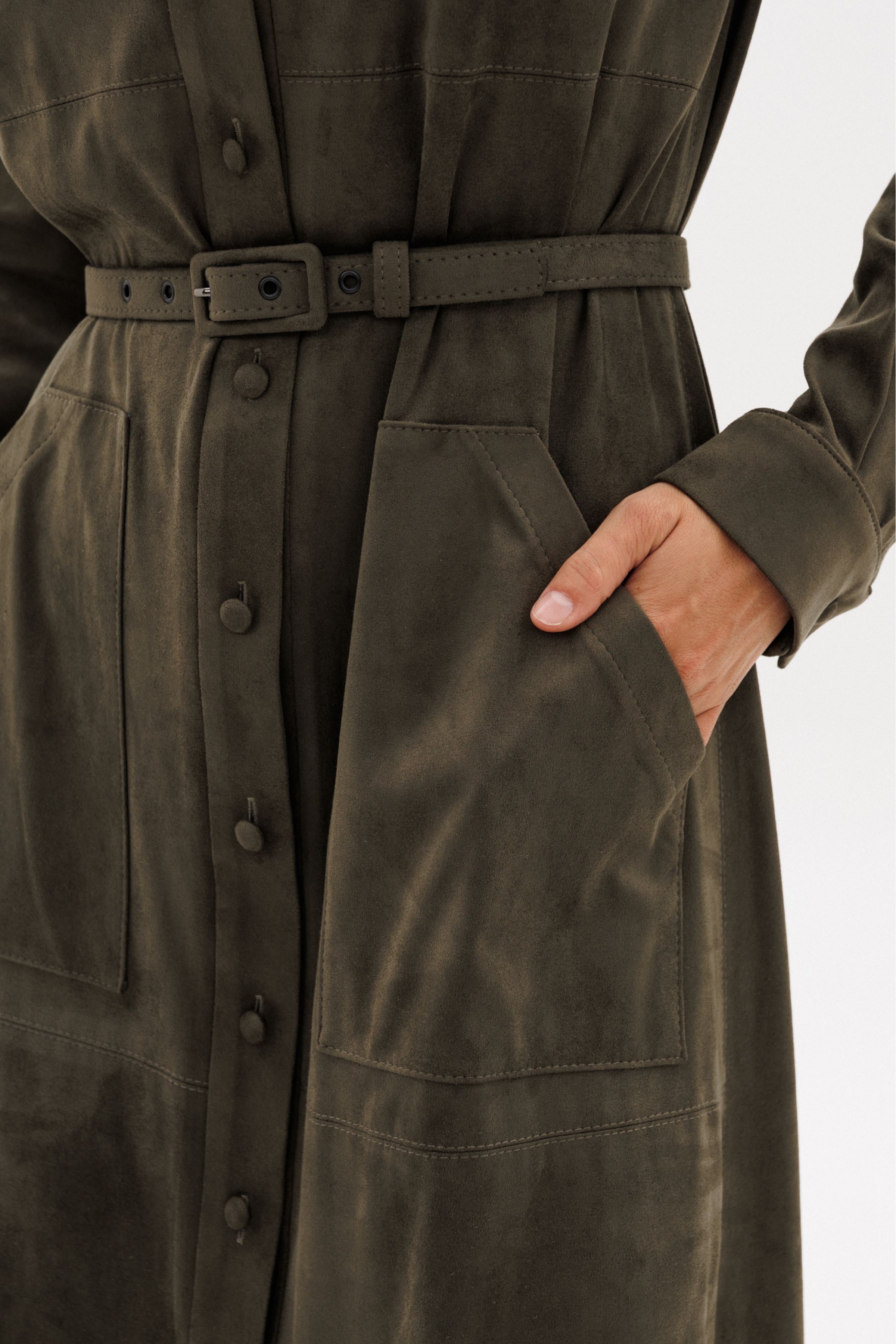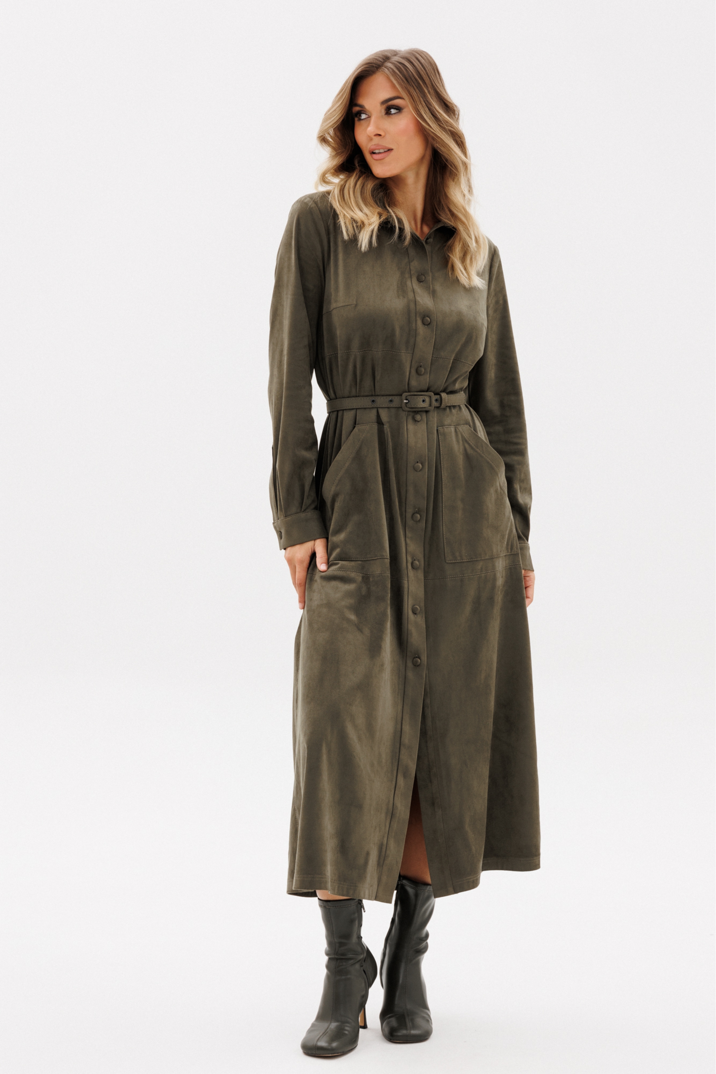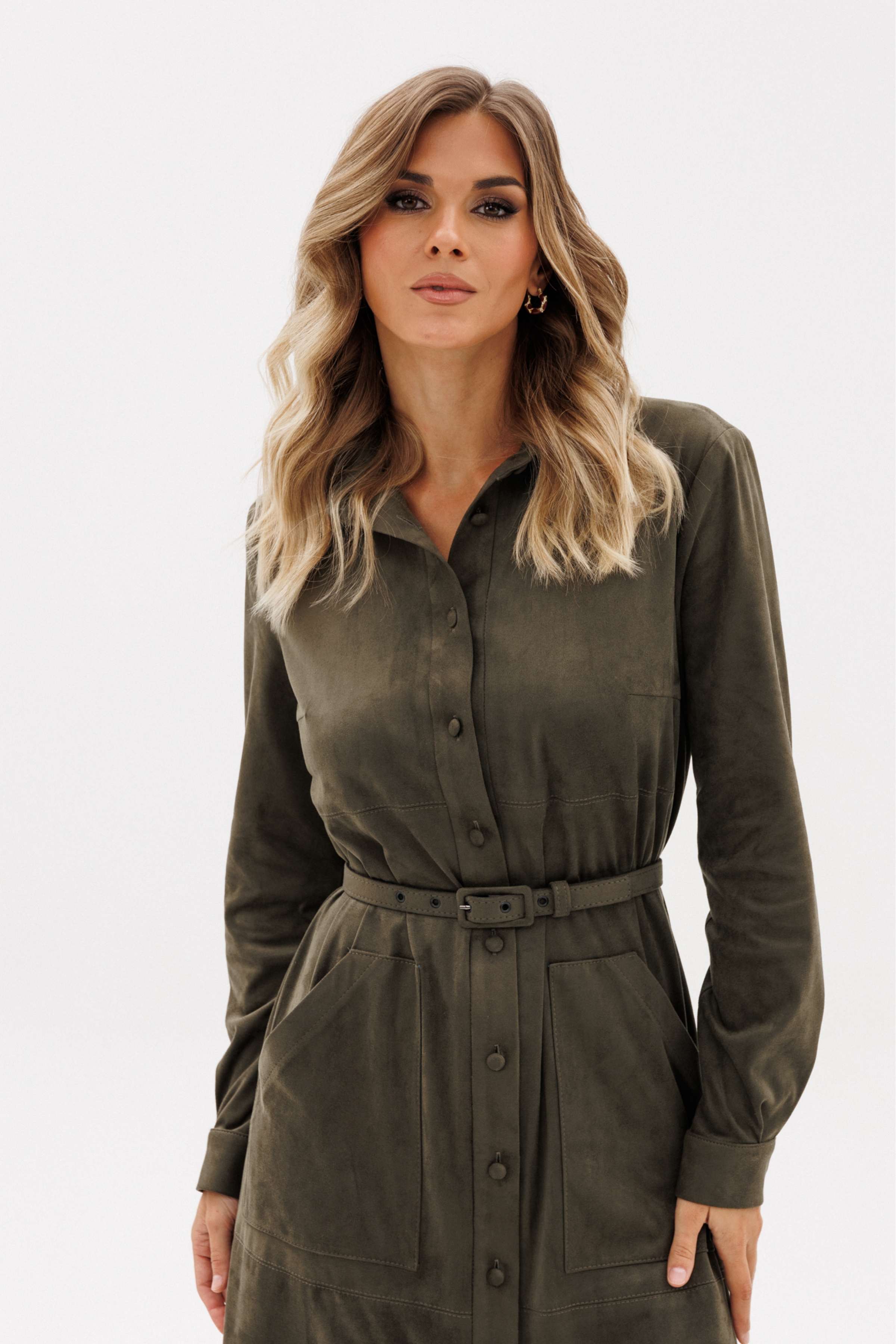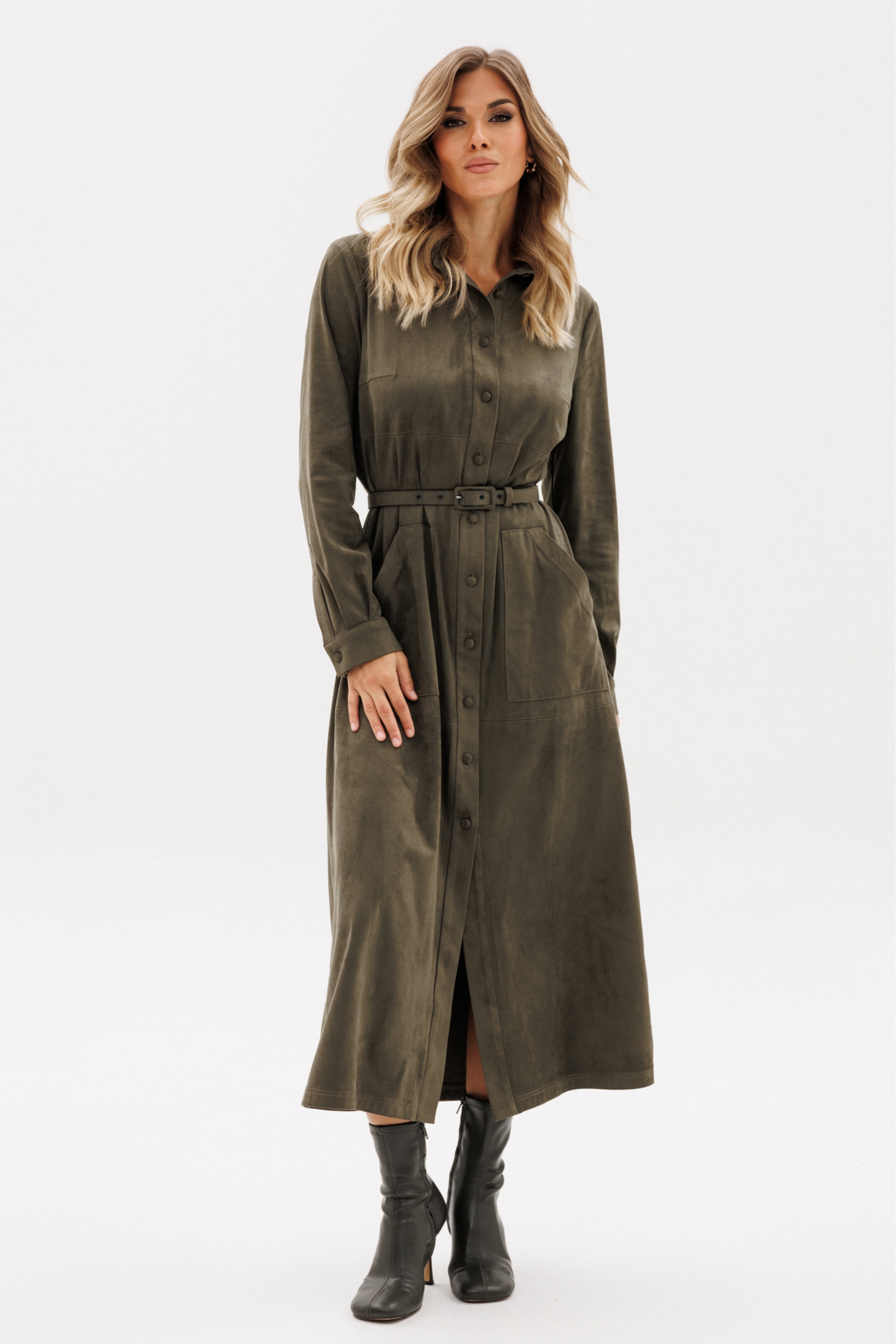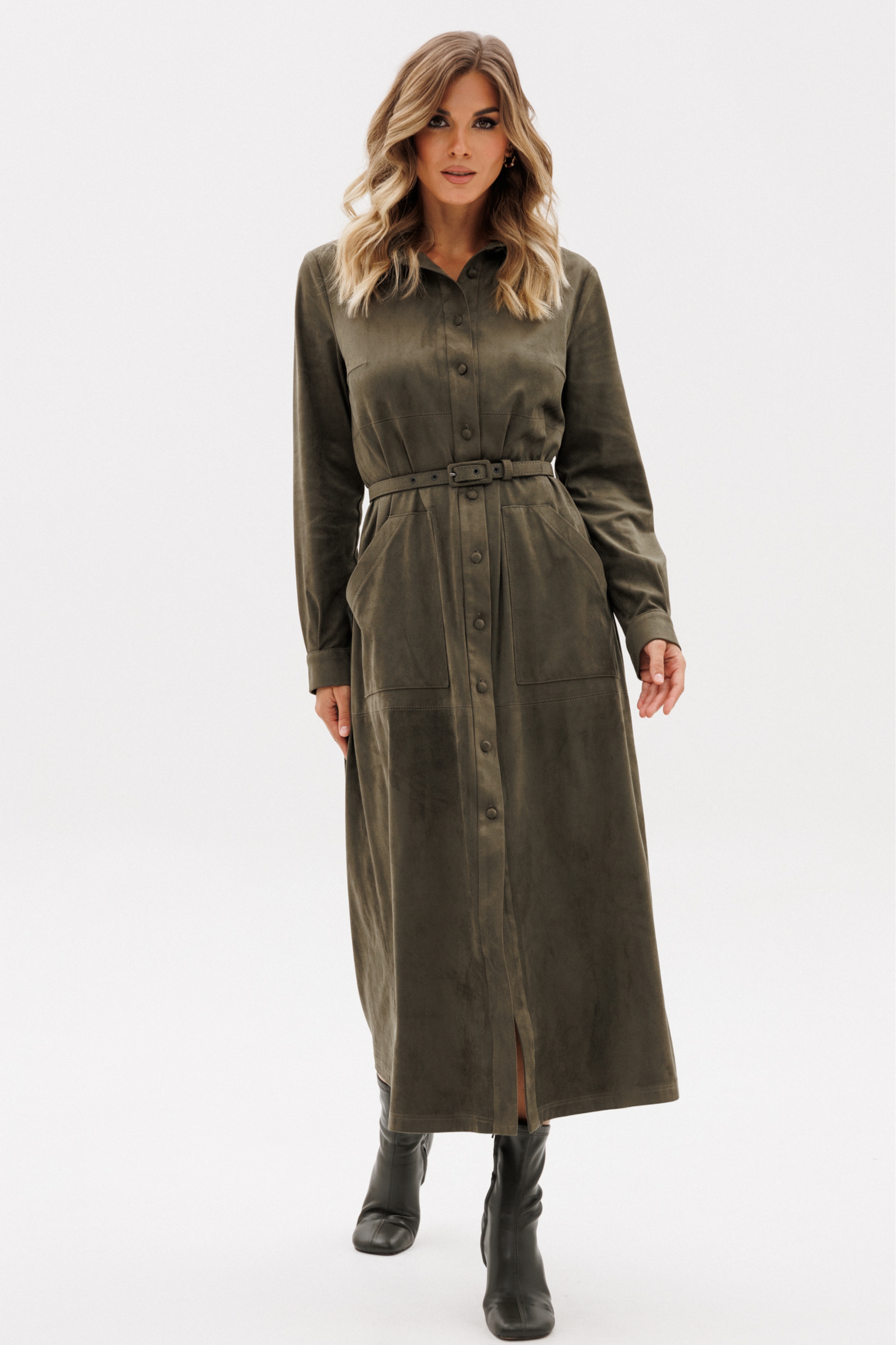 Платье выполнено из тонкой искуственной замши. Платье прямого силуэта, длиной миди. Спереди горизонтальные подрезы, накладные карманы и центральная застежка до верха с планкой на пуговицы. На спинке кокетка и встречная складка. Воротник стояче-отложной с отрезной стойкой и затежкой на пуговицу. Рукав втачной, одношовный. По низу рукава две складки и планка-обтачка. Низ рукава на притачной манжете с застежкой на пуговицу. Платье декорировано нашивкой из натуральной кожи по кокетке спинки. В комплект входит ремень из основной ткани с обтяжной пряжкой.