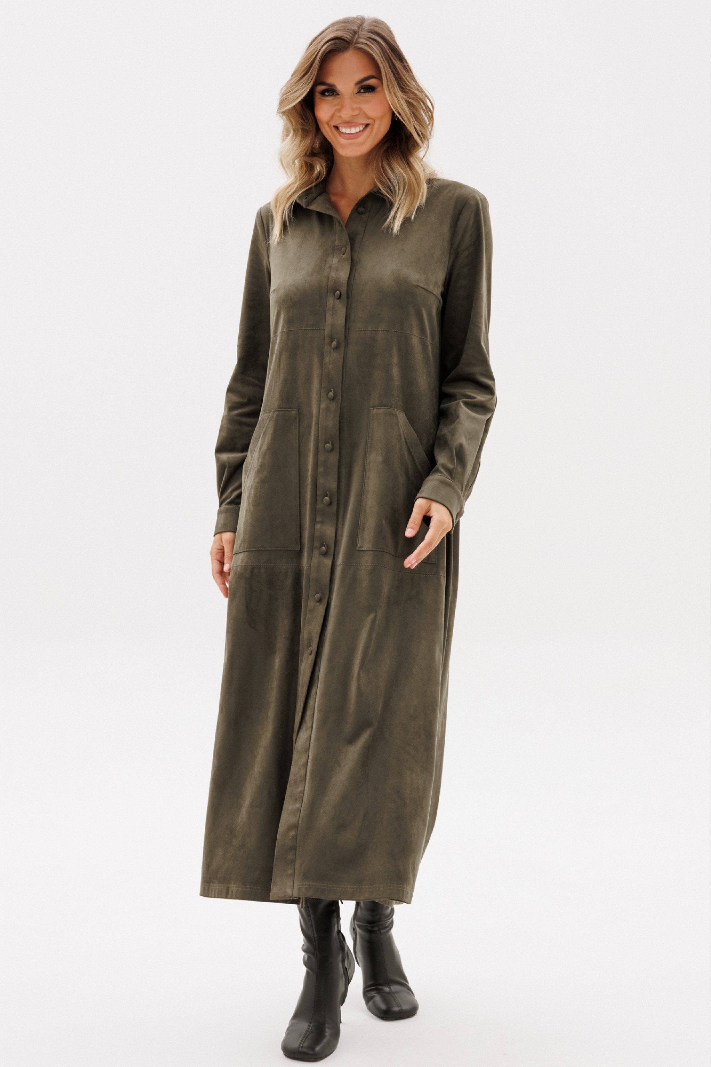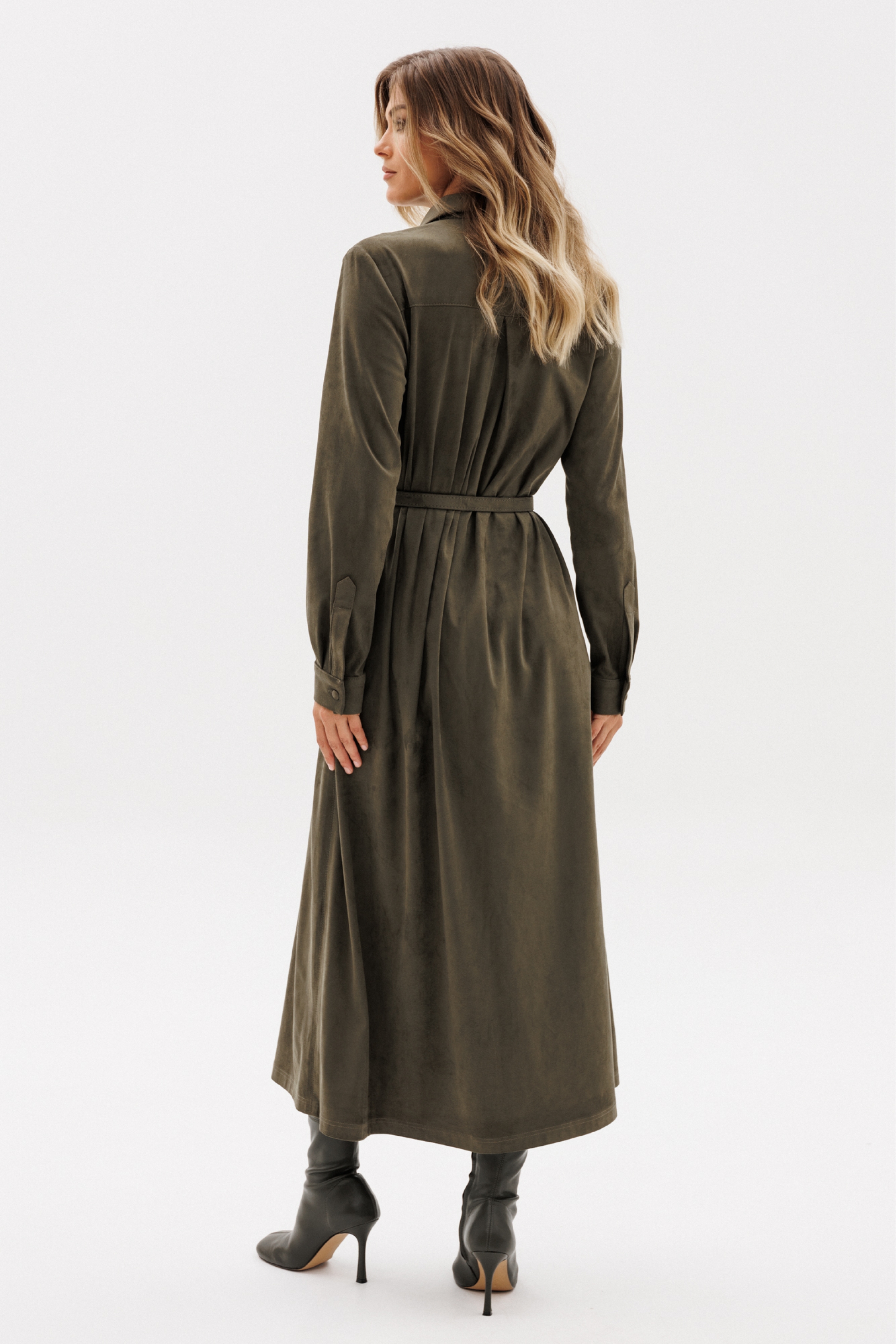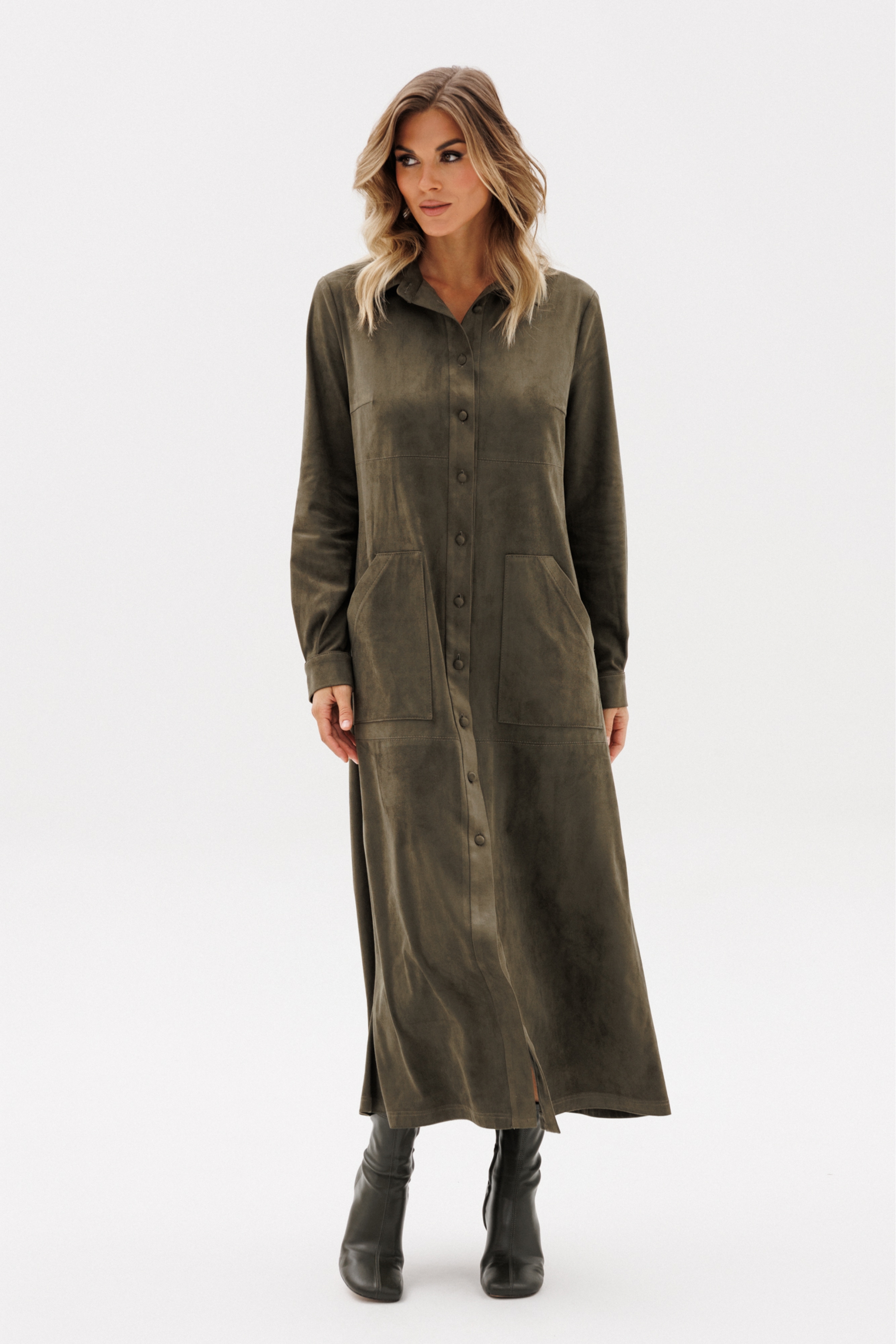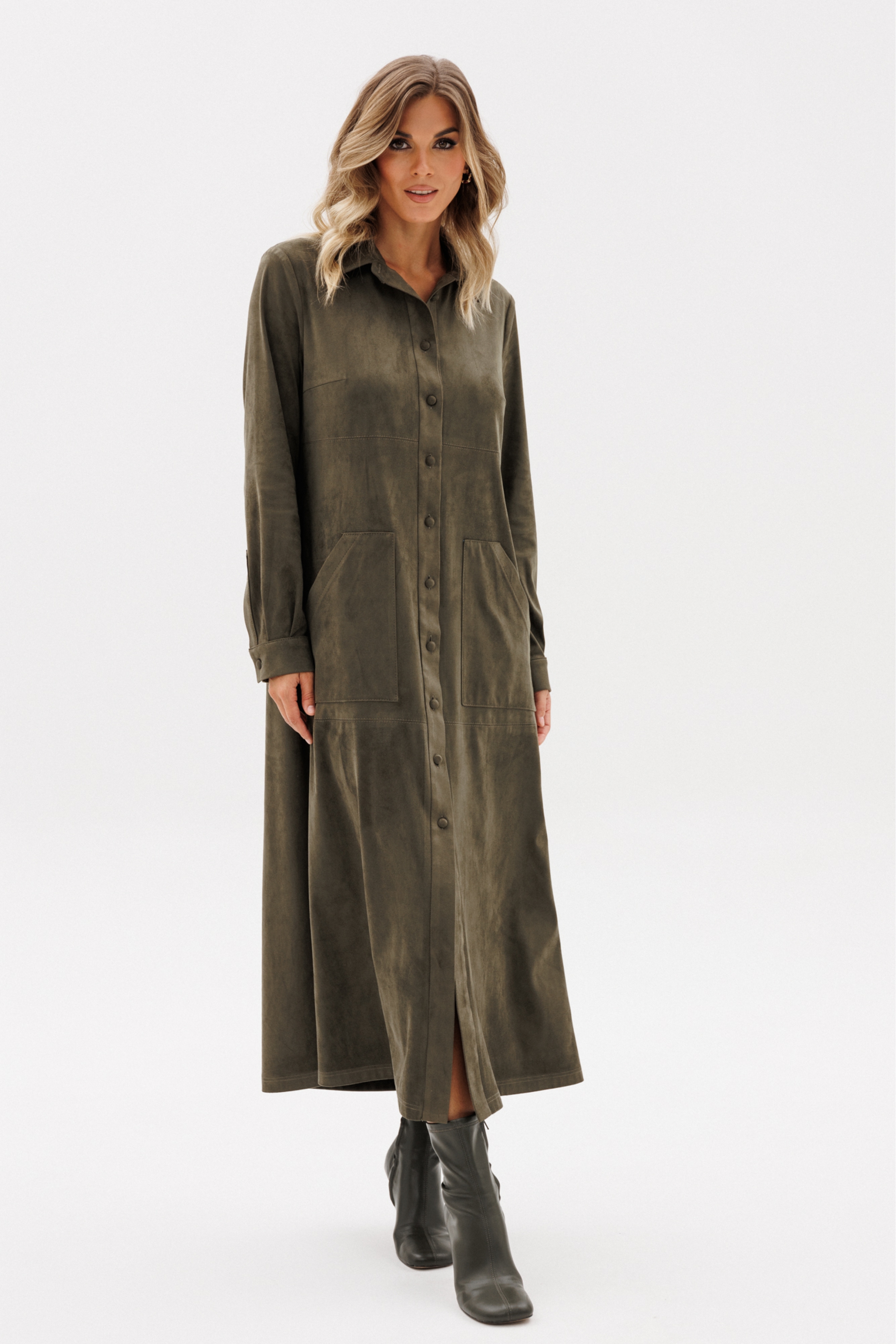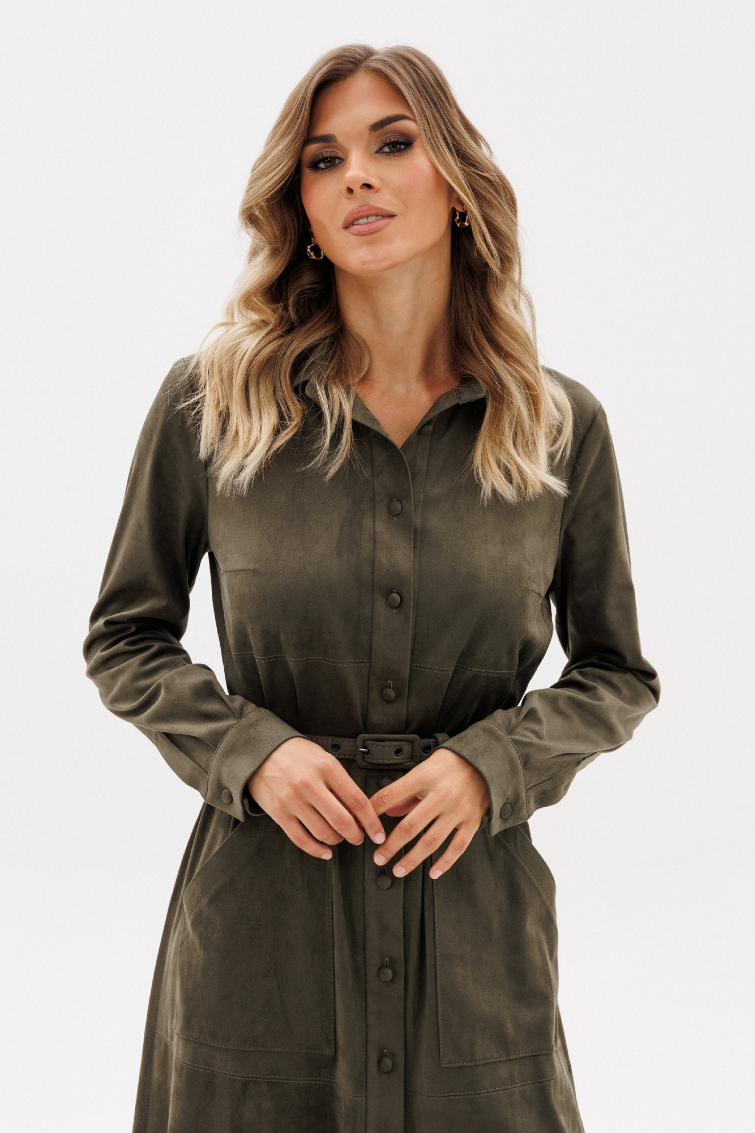 Платье выполнено из тонкой искуственной замши. Платье прямого силуэта, длиной миди. Спереди горизонтальные подрезы, накладные карманы и центральная застежка до верха с планкой на пуговицы. На спинке кокетка и встречная складка. Воротник стояче-отложной с отрезной стойкой и затежкой на пуговицу. Рукав втачной, одношовный. По низу рукава две складки и планка-обтачка. Низ рукава на притачной манжете с застежкой на пуговицу. Платье декорировано нашивкой из натуральной кожи по кокетке спинки. В комплект входит ремень из основной ткани с обтяжной пряжкой.