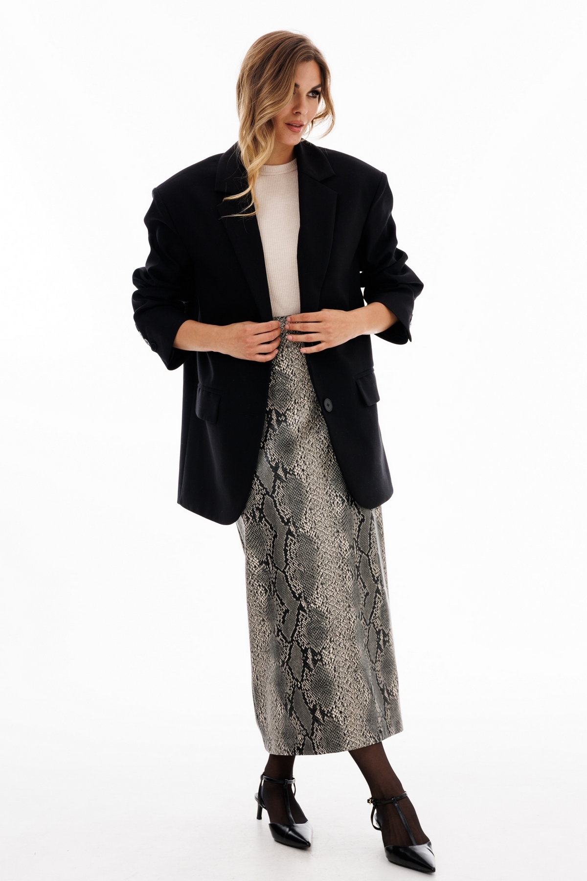 Юбка выполнена из искусственной кожи с анималистичным принтом. Юбка заужена к низу, на притачном поясе, длиной миди. Застежка сзади на потайную молнию и пуговицу. Сзади в среднем шве разрез. Юбка на отлетной по низу подкладке.