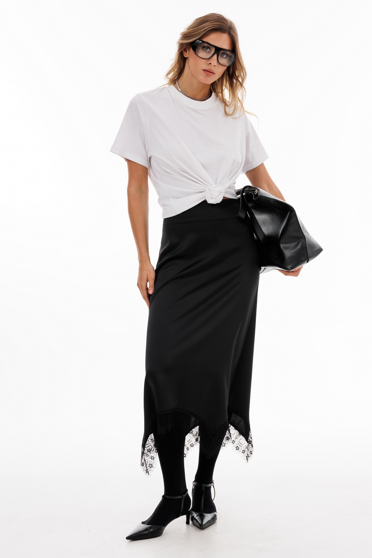 Юбка выполнена из атласа. Юбка А-образного силуэта, длиной миди. Переднее и заднее полотнище цельные и расширены к низу. Низ юбки фигурной формы, обработан кружевом. ВЗастежка в левом боковом шве на потайную молнию и пуговицу. Юбка без подкладки.