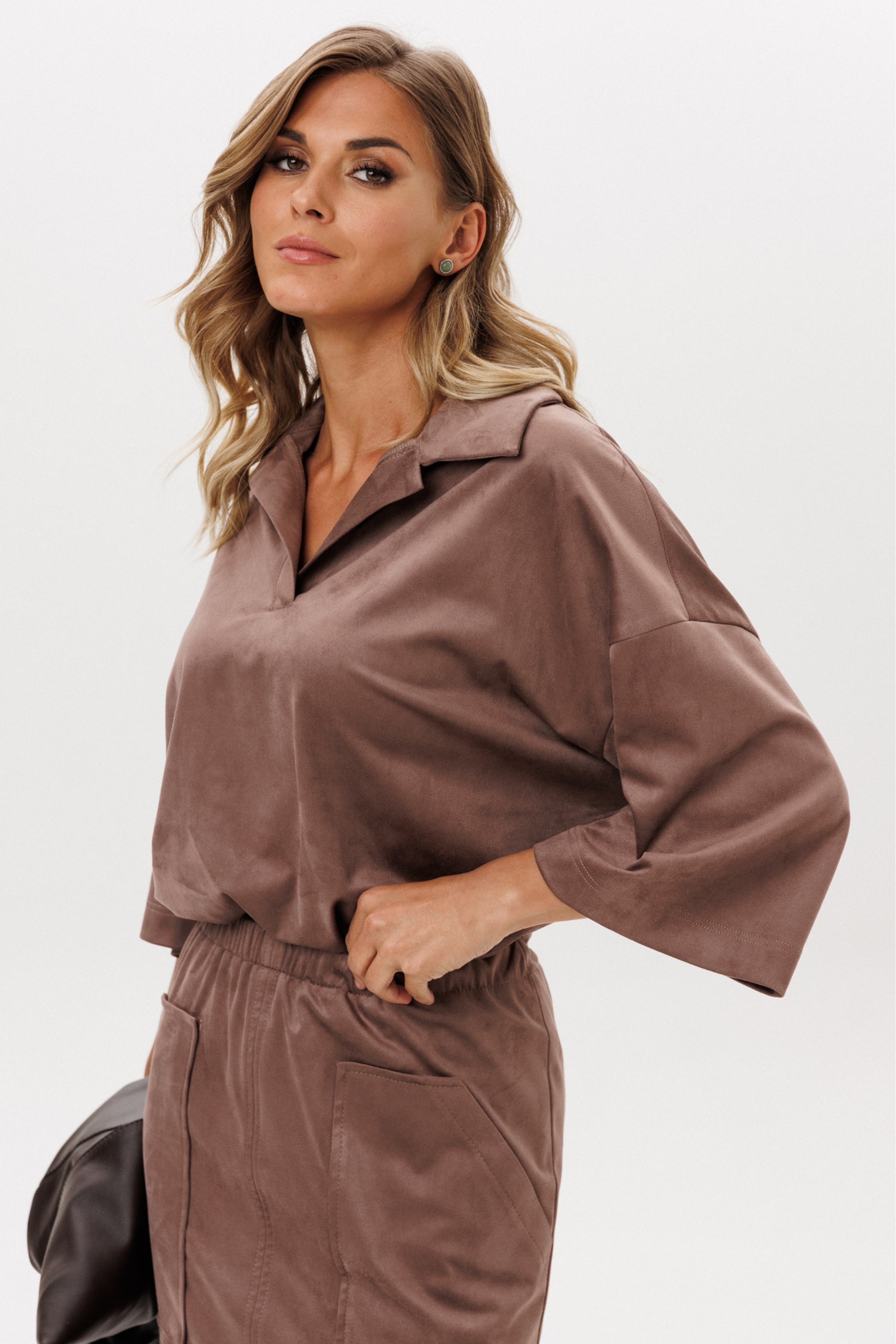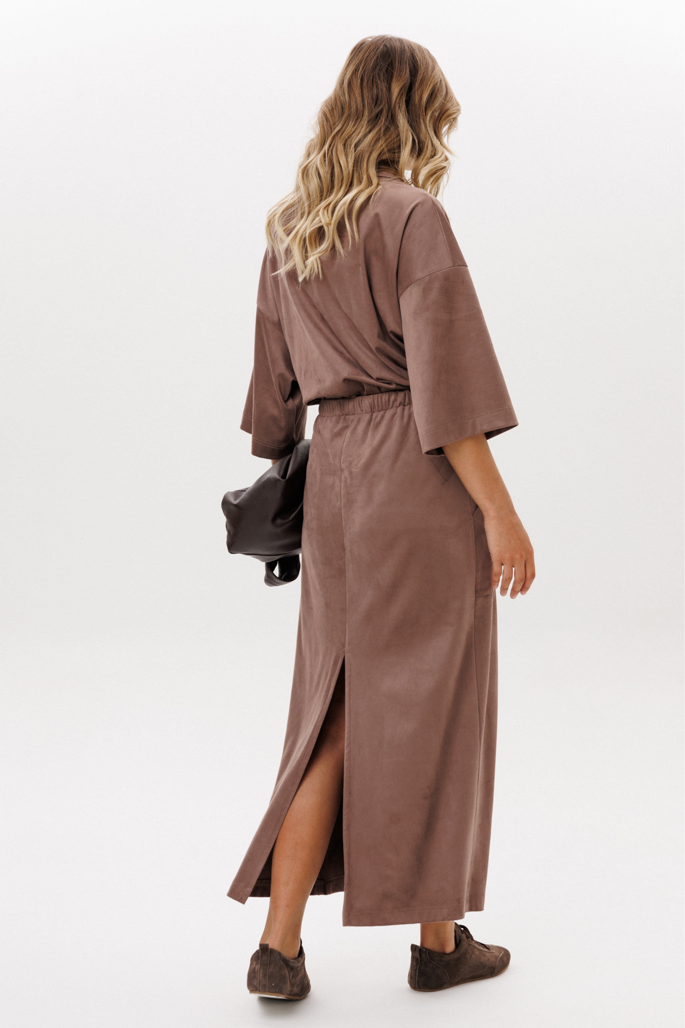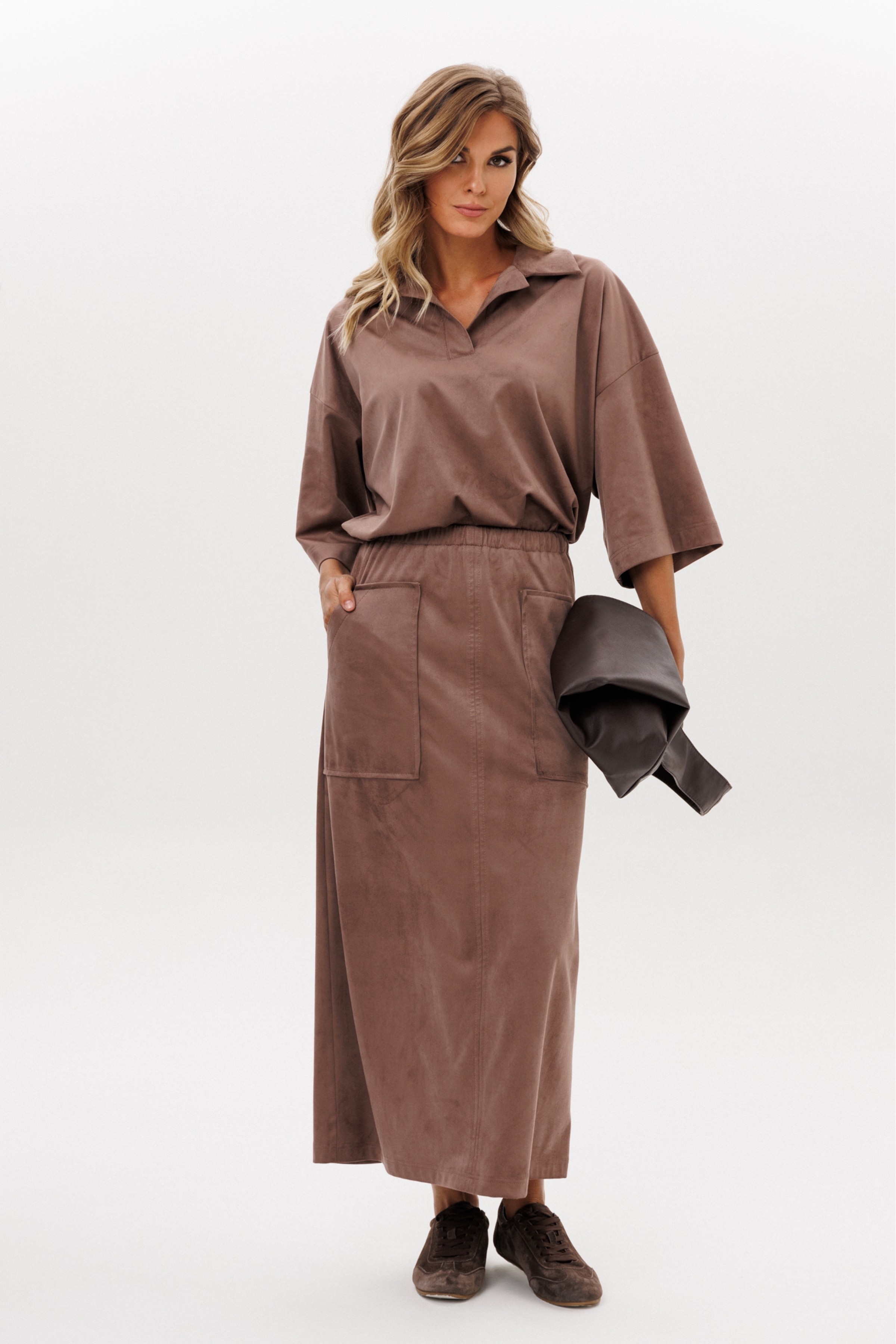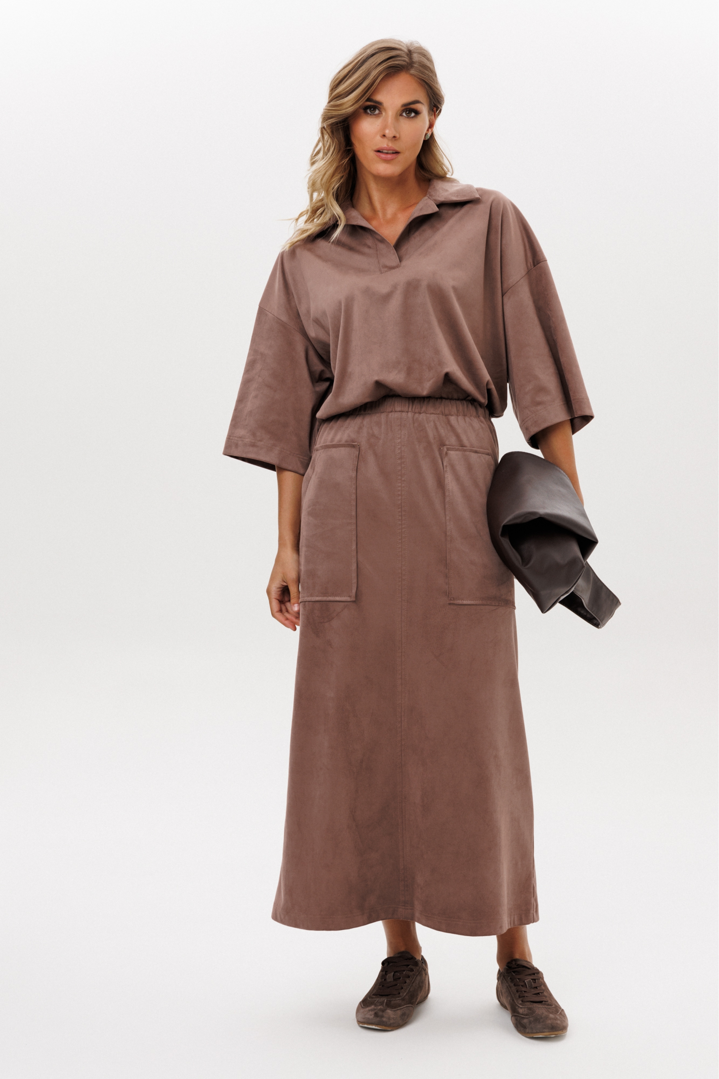 Юбка выполнена из тонкой искуственной замши. Юбка прямого силуэта, длиной миди, на цельнокроенном поясе с эластичной тесьмой. Спереди средний шов и накладные карманы. Сзади разрез в среднем шве. Юбка на трикотажной подкладке.