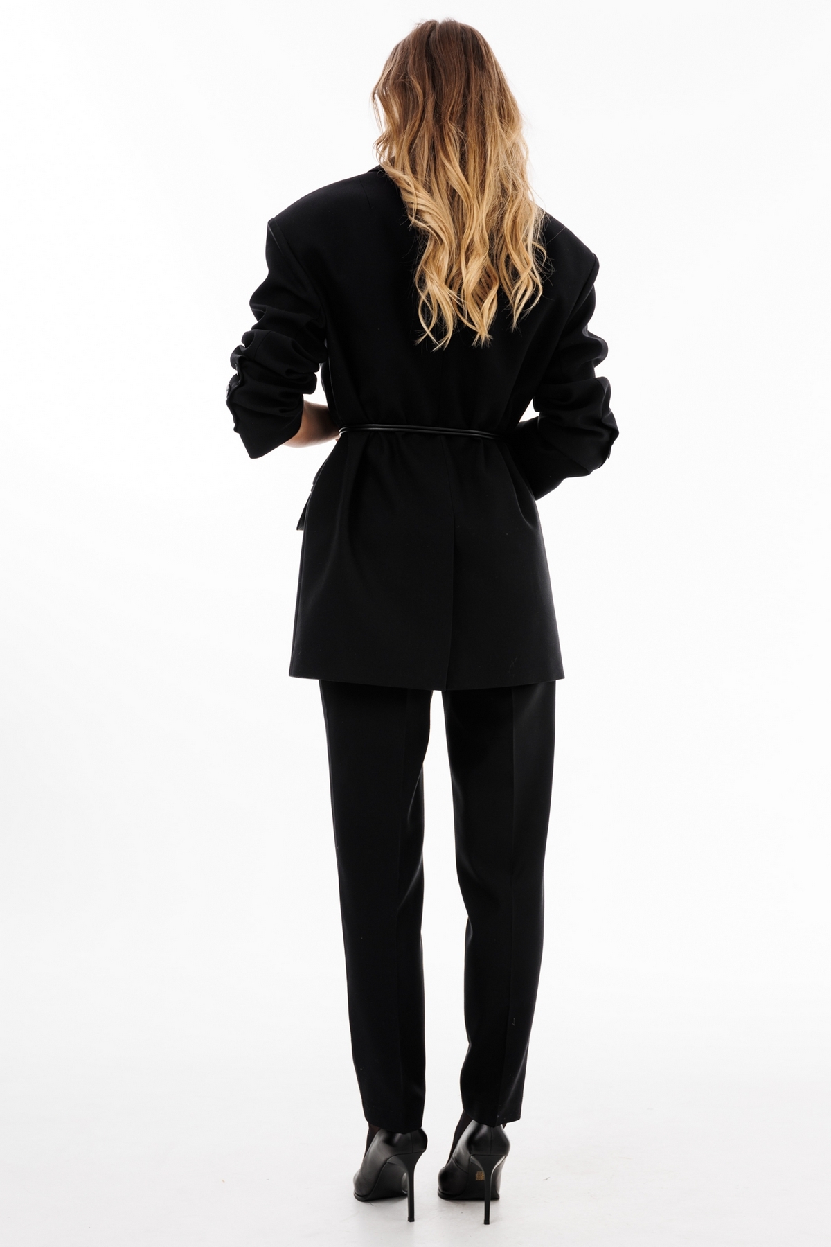 Жакет выполнен из костюмной ткани. Жакет прямого силуэта, длиной ниже линии бедер, покроя "oversize". Спереди прорезные карманы с клапанами. Центральная бортовая застежка на пуговицы. На спинке средний шов и шлица. Воротник пиджачного типа. Плечевой шов удлинен. Рукав втачной, двухшовный, со шлицей по низу, застегивающейся на пуговицы. Жакет на притачной по низу подкладке. Ремень в комплект НЕ ВХОДИТ.
