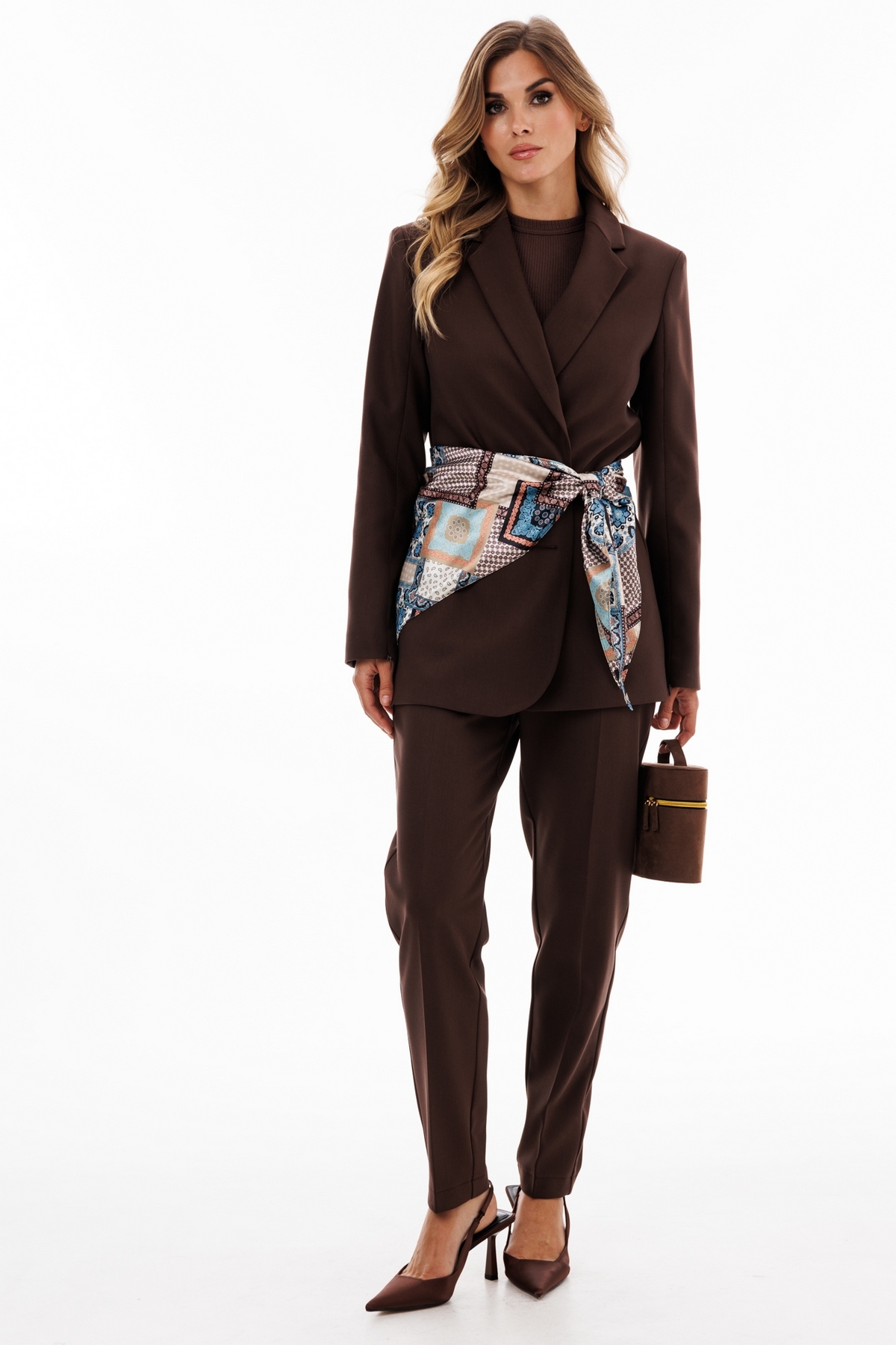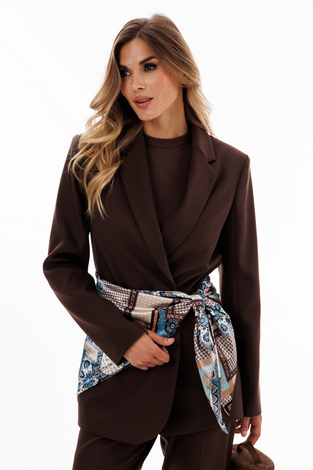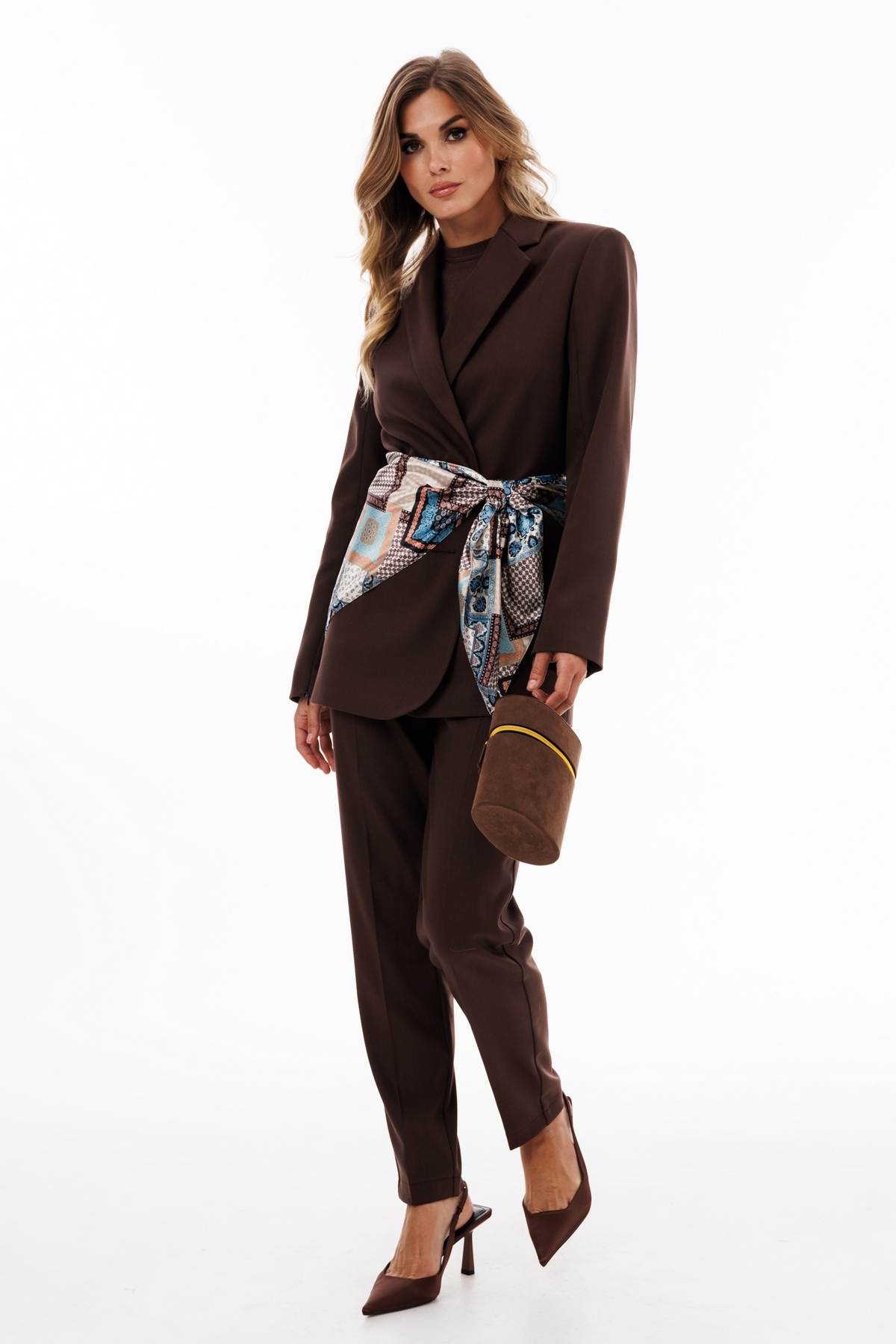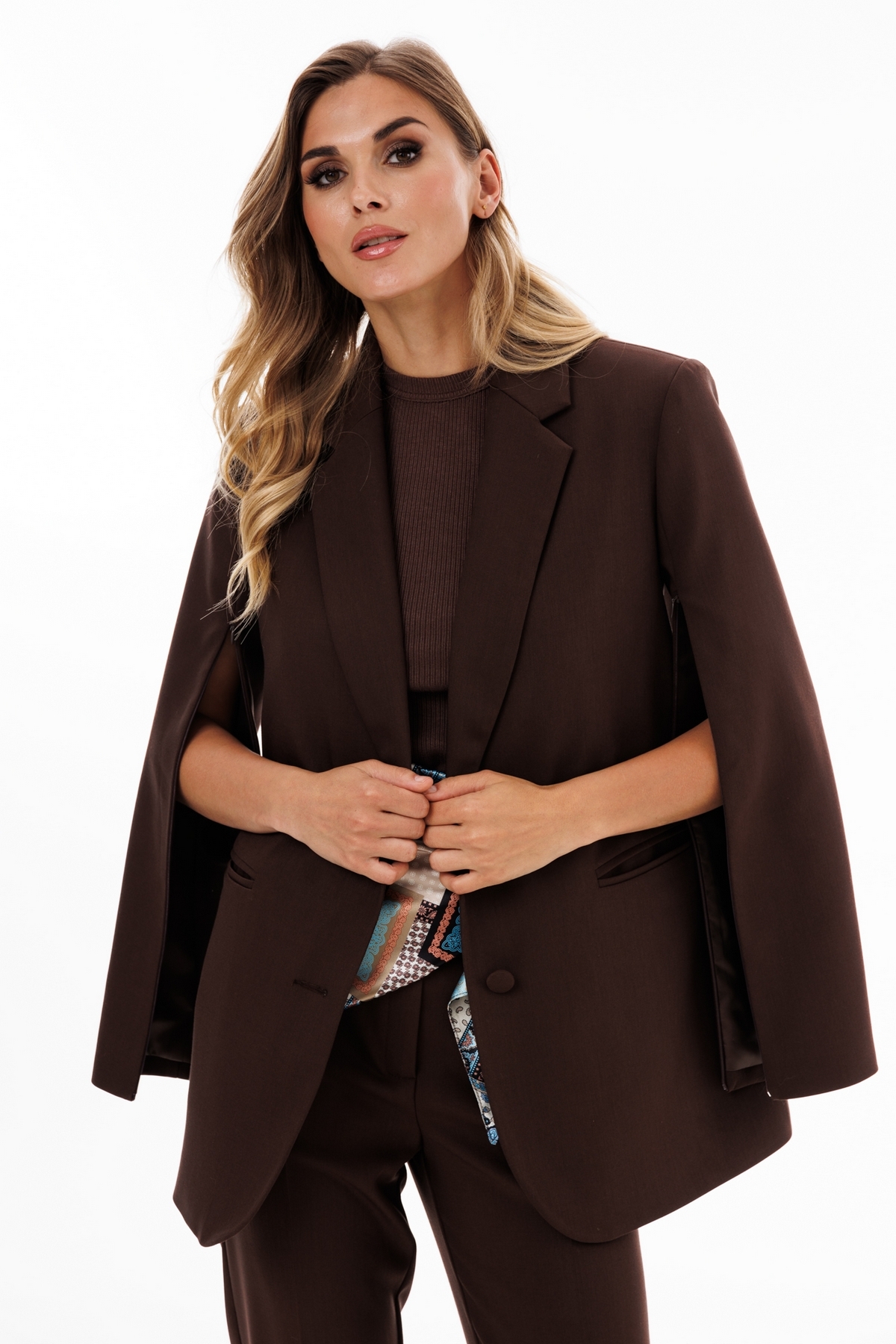 Жакет выполнен из костюмной ткани. Жакет прямого силуэта, длиной до линии бедер. Спереди застежка на пуговицы и прорезные карманы. Жакет по низу закругленной формы. На спинке средний шов. Воротник пиджачного типа. Рукав втачной, двухшовный, декорирован потайной молнией. Жакет на притачной по низу подкладке.
