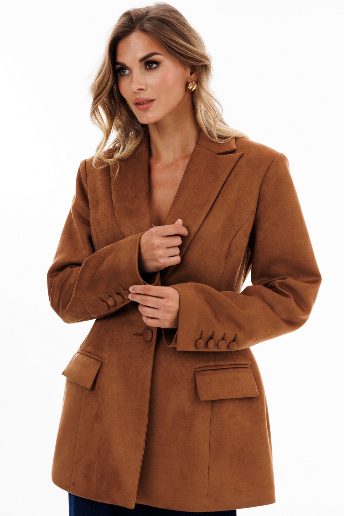 Жакет выполнине из плотной искуственной замши. Жакет Х-обраного силуэта, длиной ниже линии бедер. Спереди рельефы от проймы до низа, прорезные карманы с клапанами и центральная бортовая застежка на пуговицы. Воротник пиджачного типа. На спинке средний шов. Плечевой шов удлинен. Рукав втачной, двухшовный, по низу заднего шва шлица с застежкой на пуговицы. Жакет на притачной по низу подкладке.