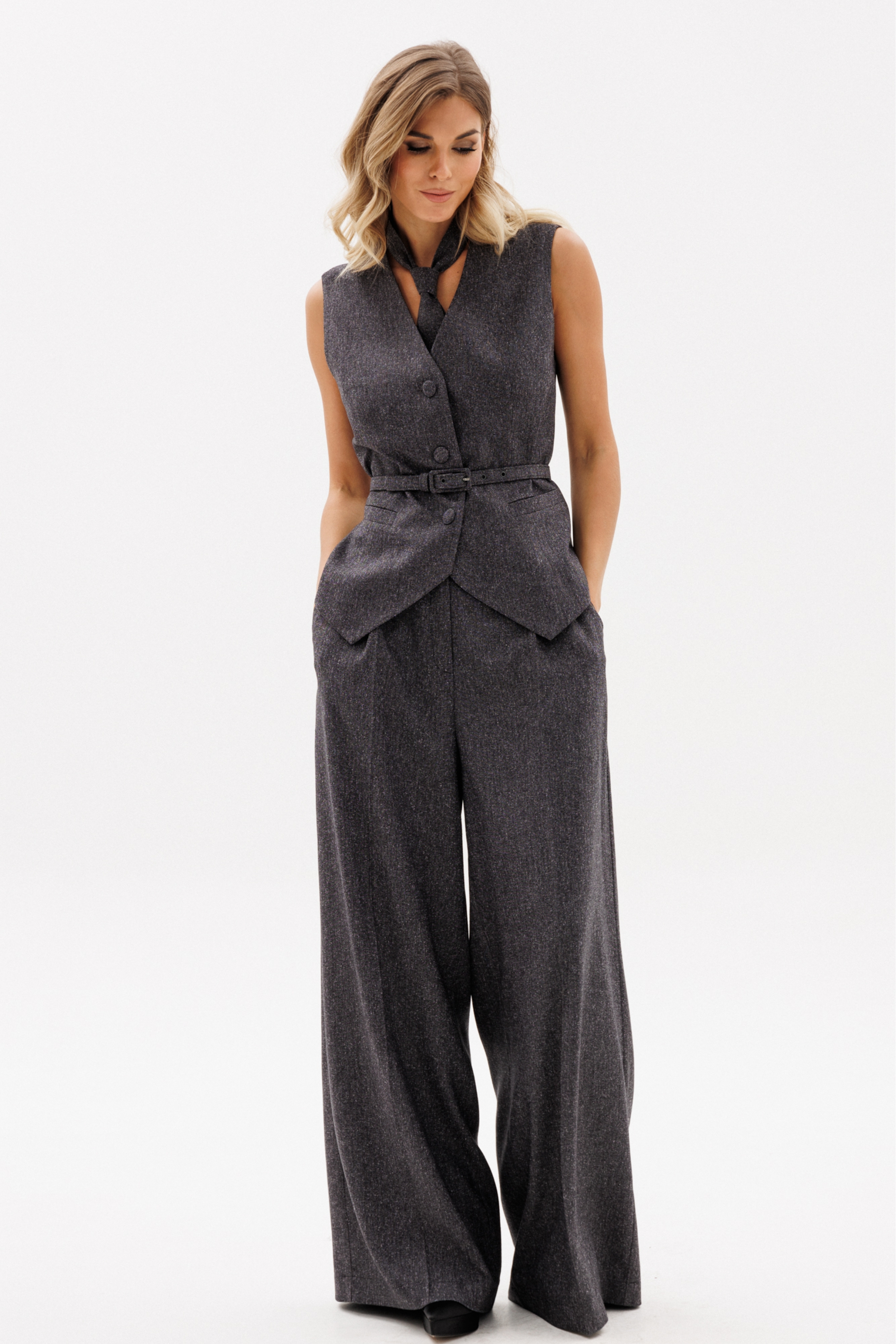 Жилет выполнен из костюмной ткани меланж. Жилет полуприлегающего силуэта, длиной до линии бедер. Низ жилета фигурной формы. Спереди декоративные карманы и центральная застежка на пуговицы. Горловина переда V-образной формы. Жилет на притачной по низу подкладке. В комплект входит ремень из основной ткани с обтяжной пряжкой.