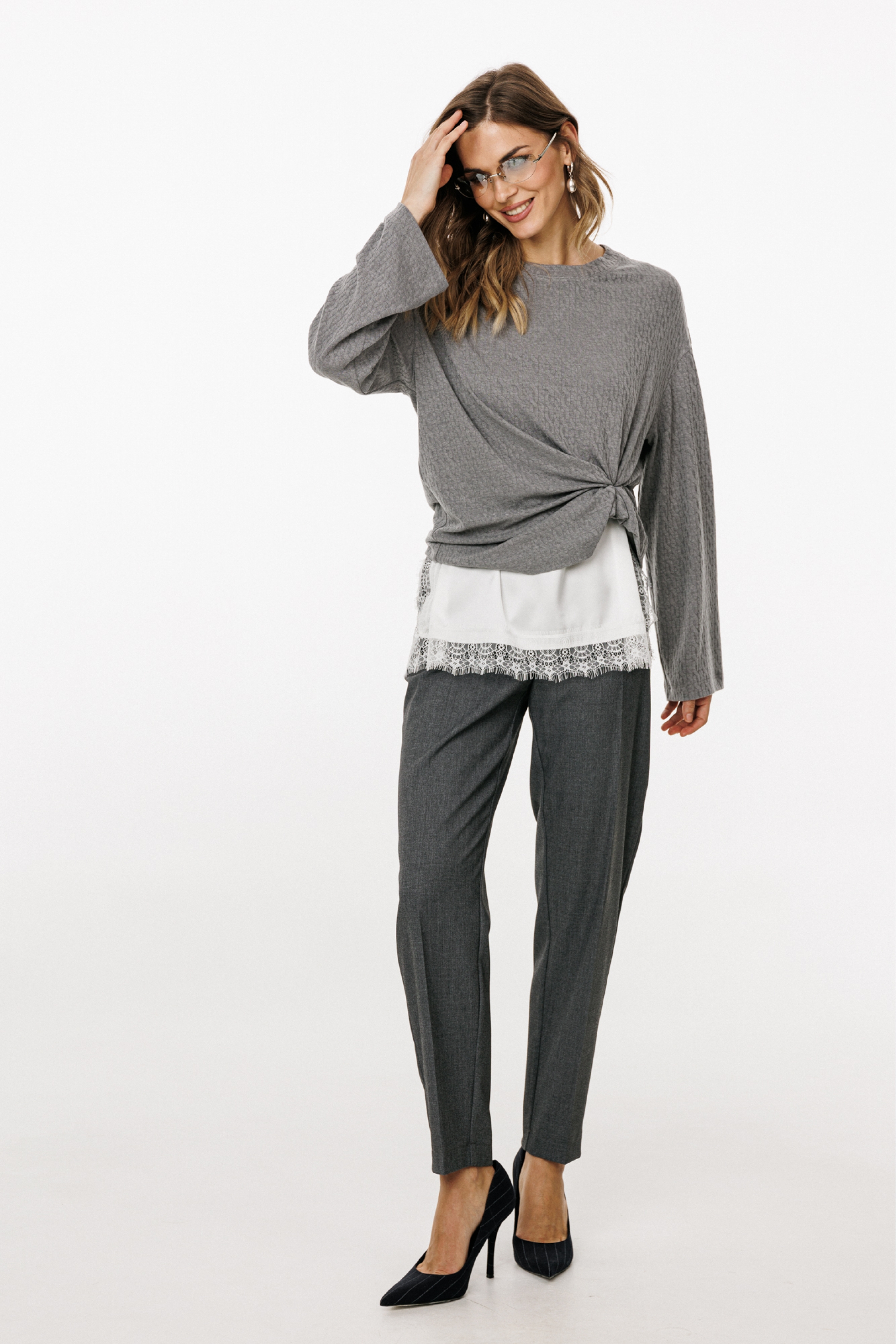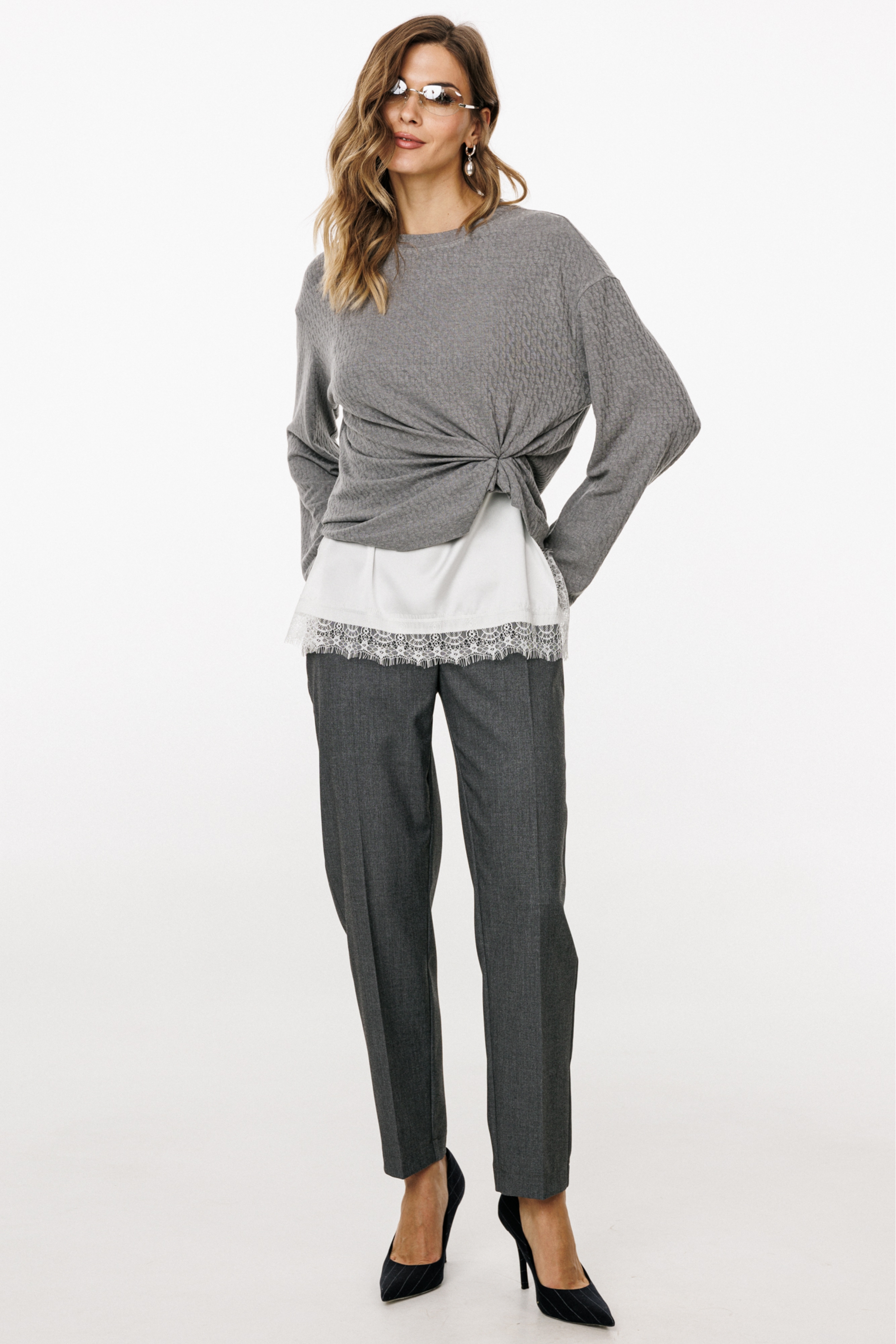 Брюки выполнены из костюмной ткани. Брюки заужены к низу, длиной 7/8, на притачном поясе. Спереди боковые карманы с наклонным входом и застежка на пуговицу и молнию. Сзади таллиевые вытачки и декоративные прорезные карманы. По задней части пояса эластичная тесьма.
