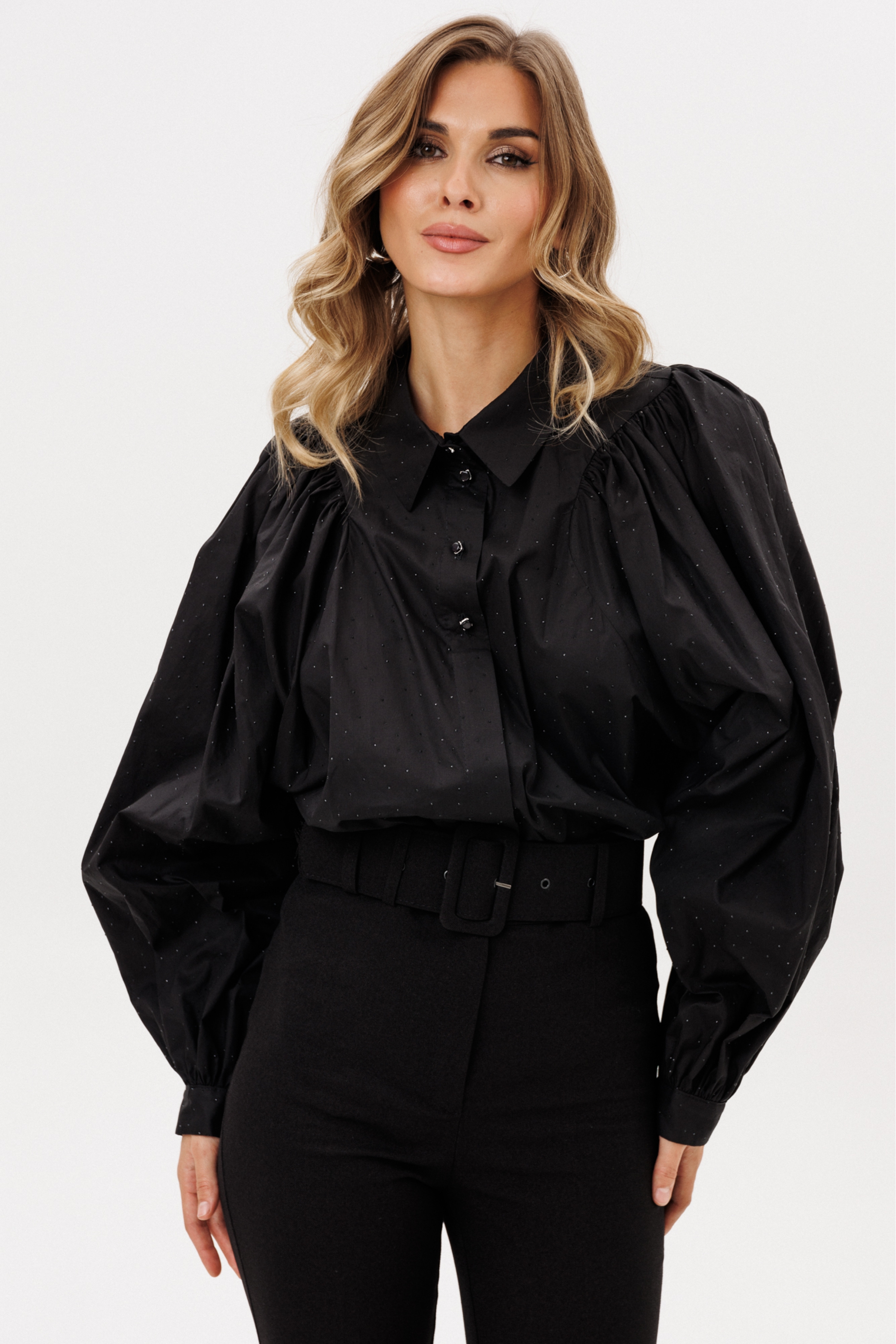 Блузка выполнена из блузочной ткани со стразами. Блузка О-образного силуэта, длиной до линии бедер. Спереди застежка на пришивные пуговицы, частично на потайной планке. Спинка цельная. Воротник стояче-отложной с отрезной стойкой. Плечевой шов заужен. Рукав цельнокроеный, с углубленной проймой. По окату и низу рукава сборка. Низ рукава на манжете, застегивающейся на пуговицу. В боковых швах разрезы.