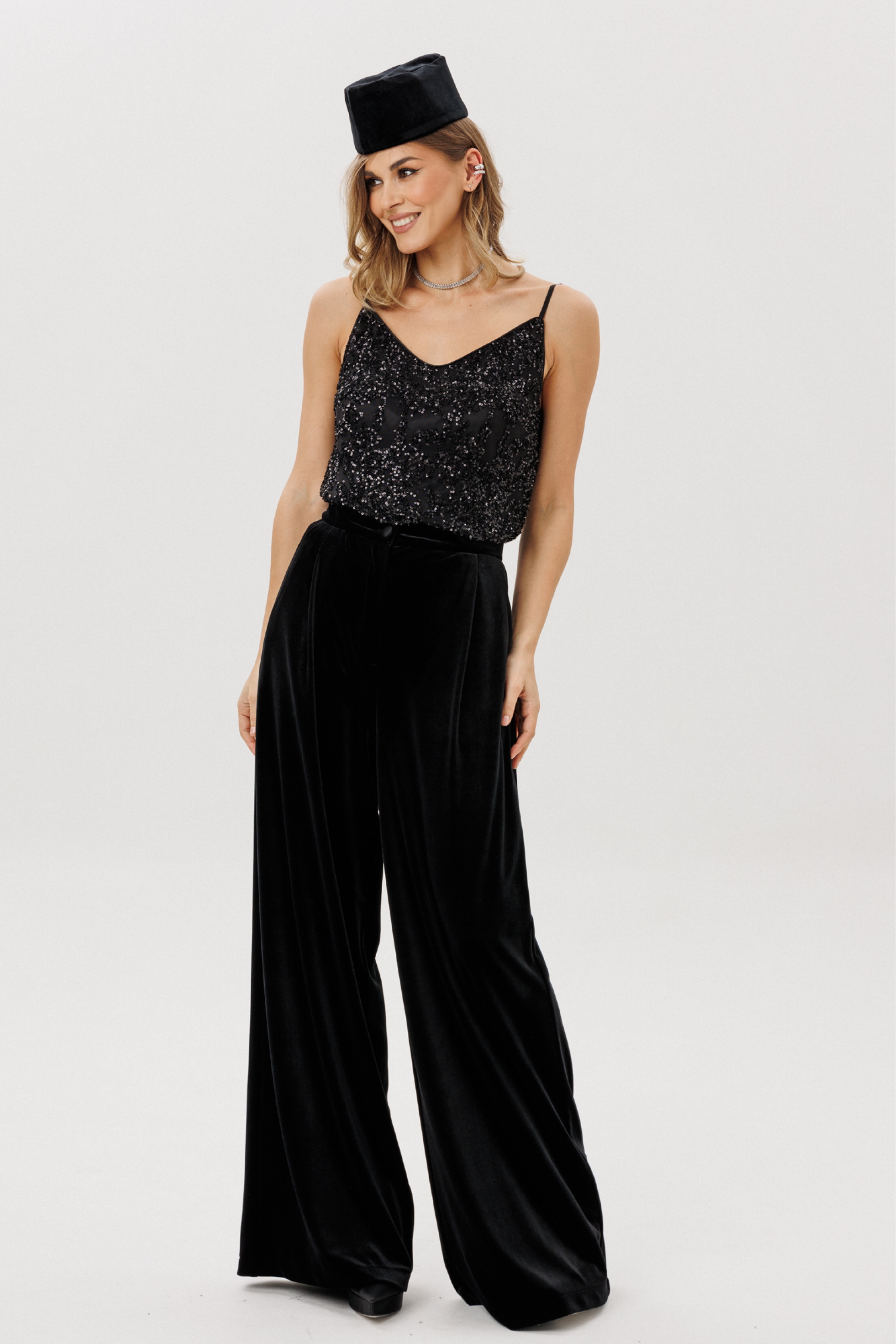 Брюки-палаццо выполнены из бархата. Брюки на притачном поясе, длиной в пол, расширенные к низу. Спереди складки и боковые карманы с наклонным входом. Застежка спереди на молнию с гульфиком и пуговицу. На задних частях обработаны талиевые вытачки.