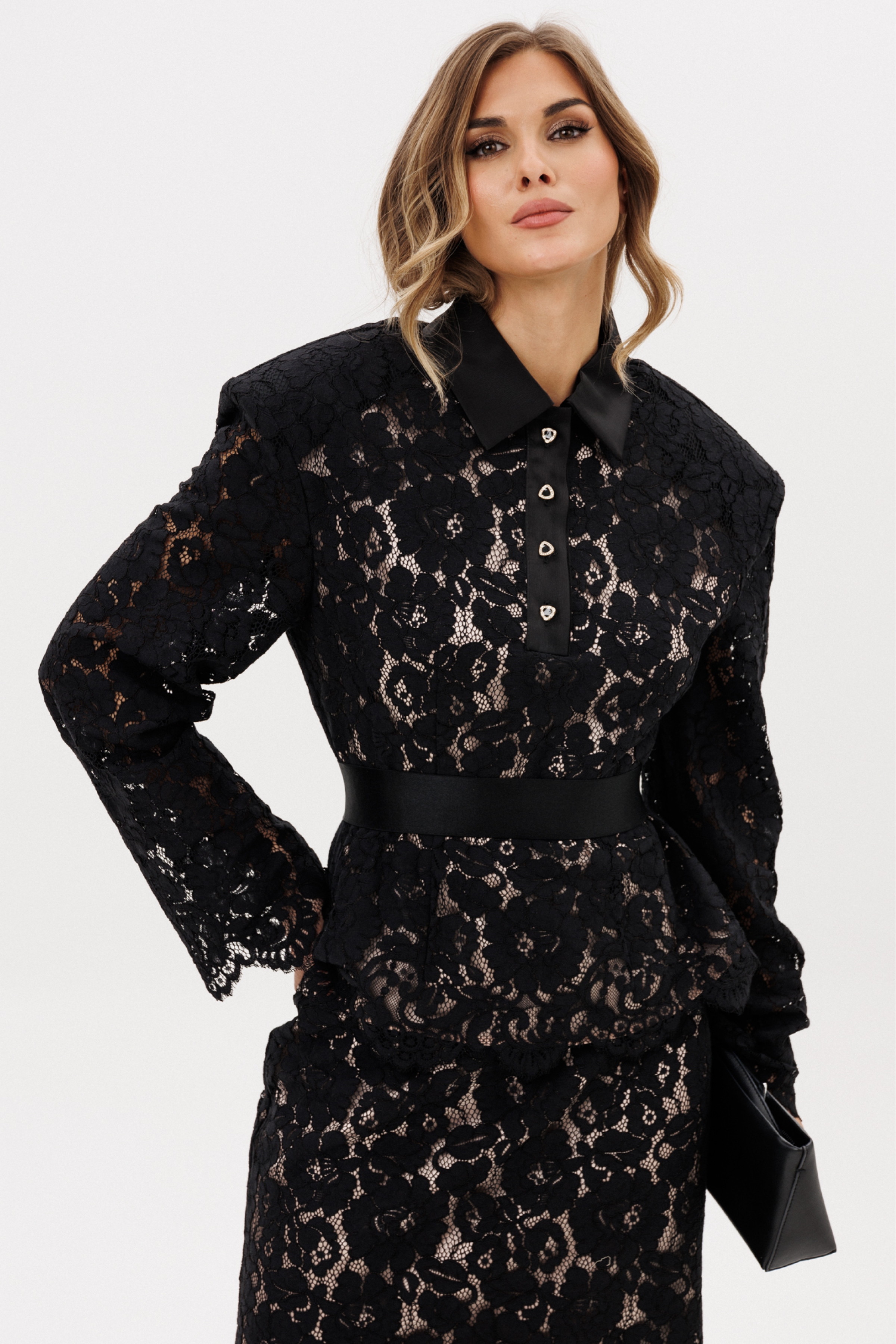 Комплект: блузка +юбка. Комплект выполнен из гипюра. Блузка прилегающего силуэта до линии бедер. Застежка спереди на пуговицы и на потайную молнию в боковом шве. Воротник стояче-отложной. Плечевой шов удлинен. Рукав втачной одношовный. По низу блузки и рукава фестоны. Блузка на отлетной по низу подкладке телесного цвета. Блузка с плечевыми накладками.