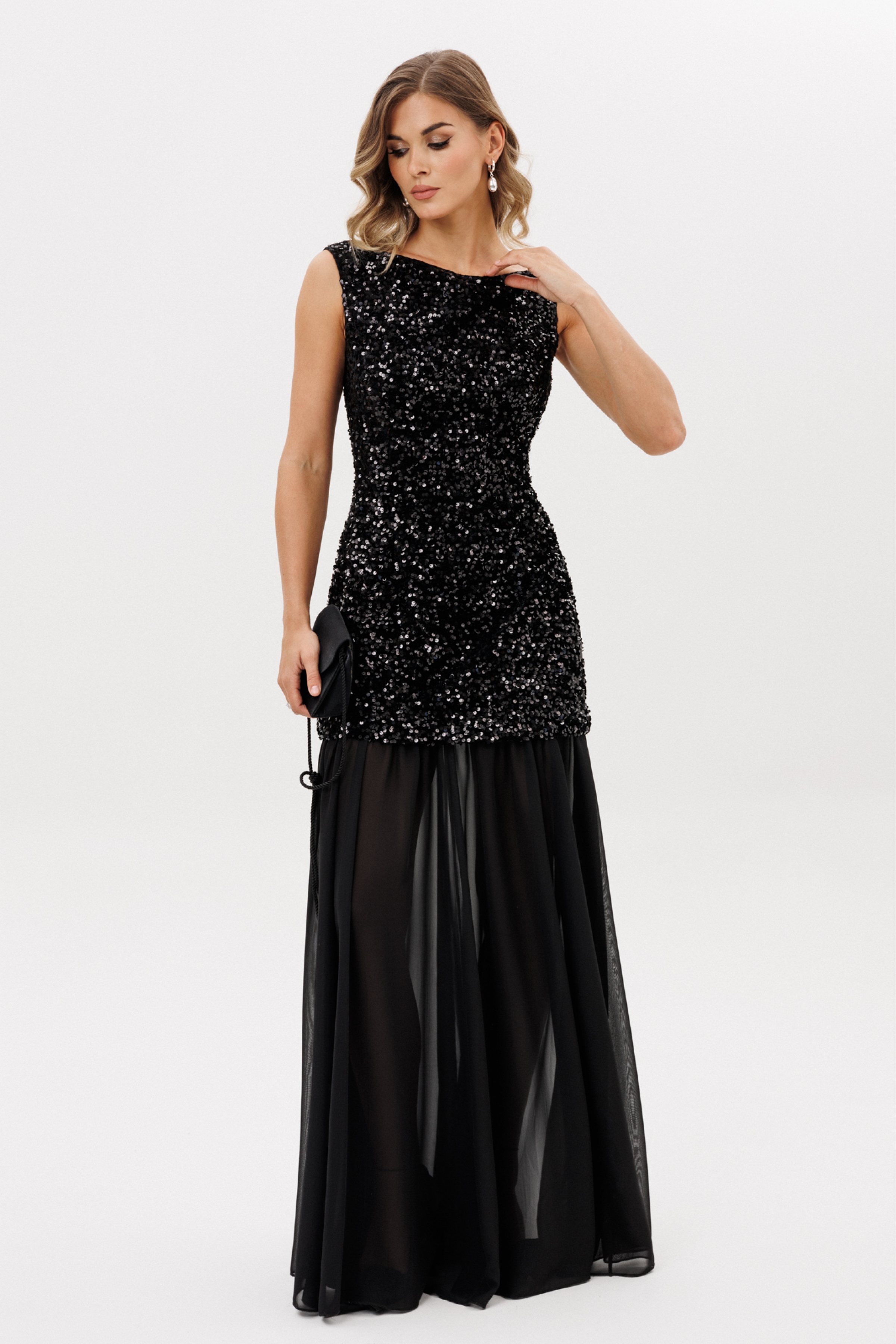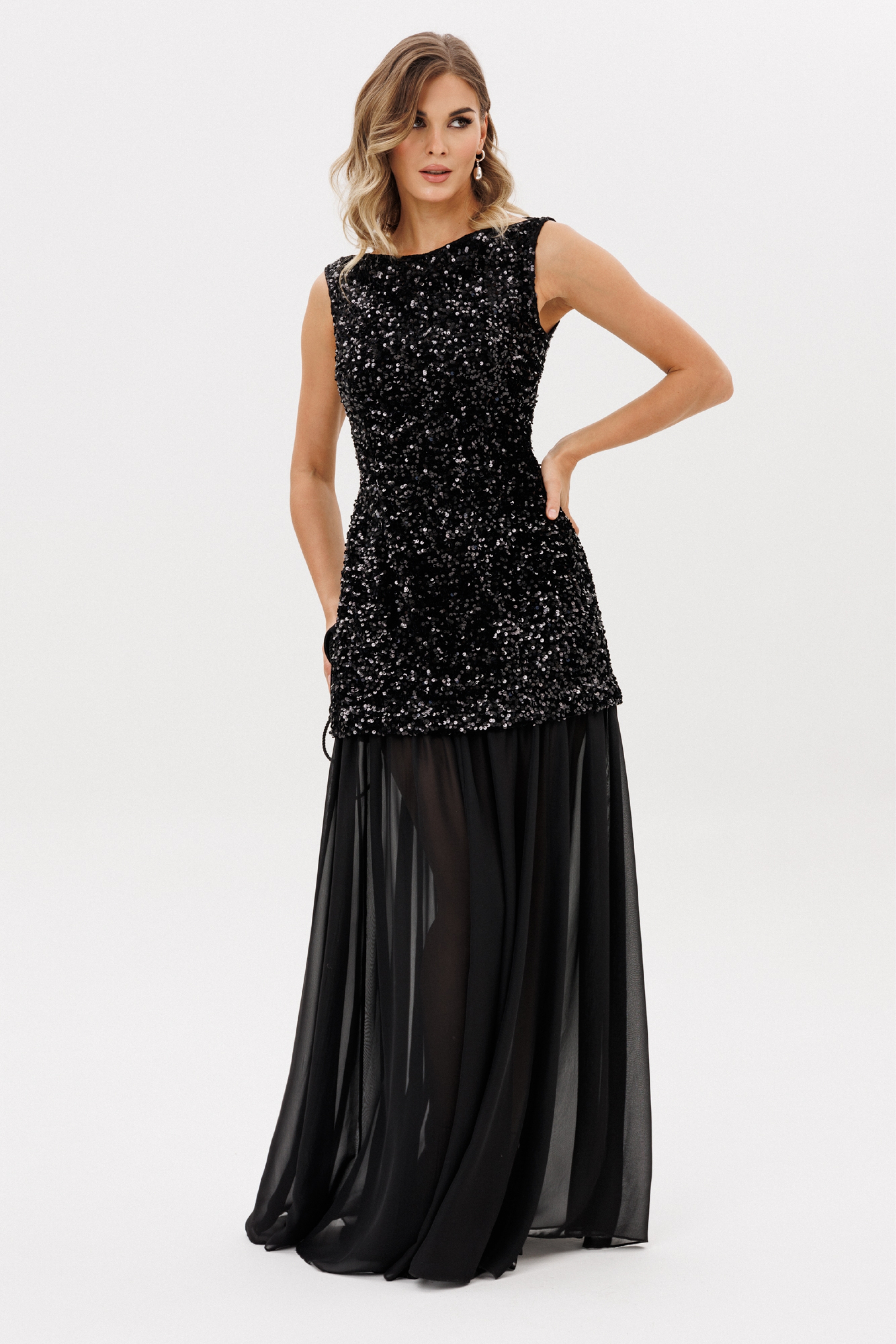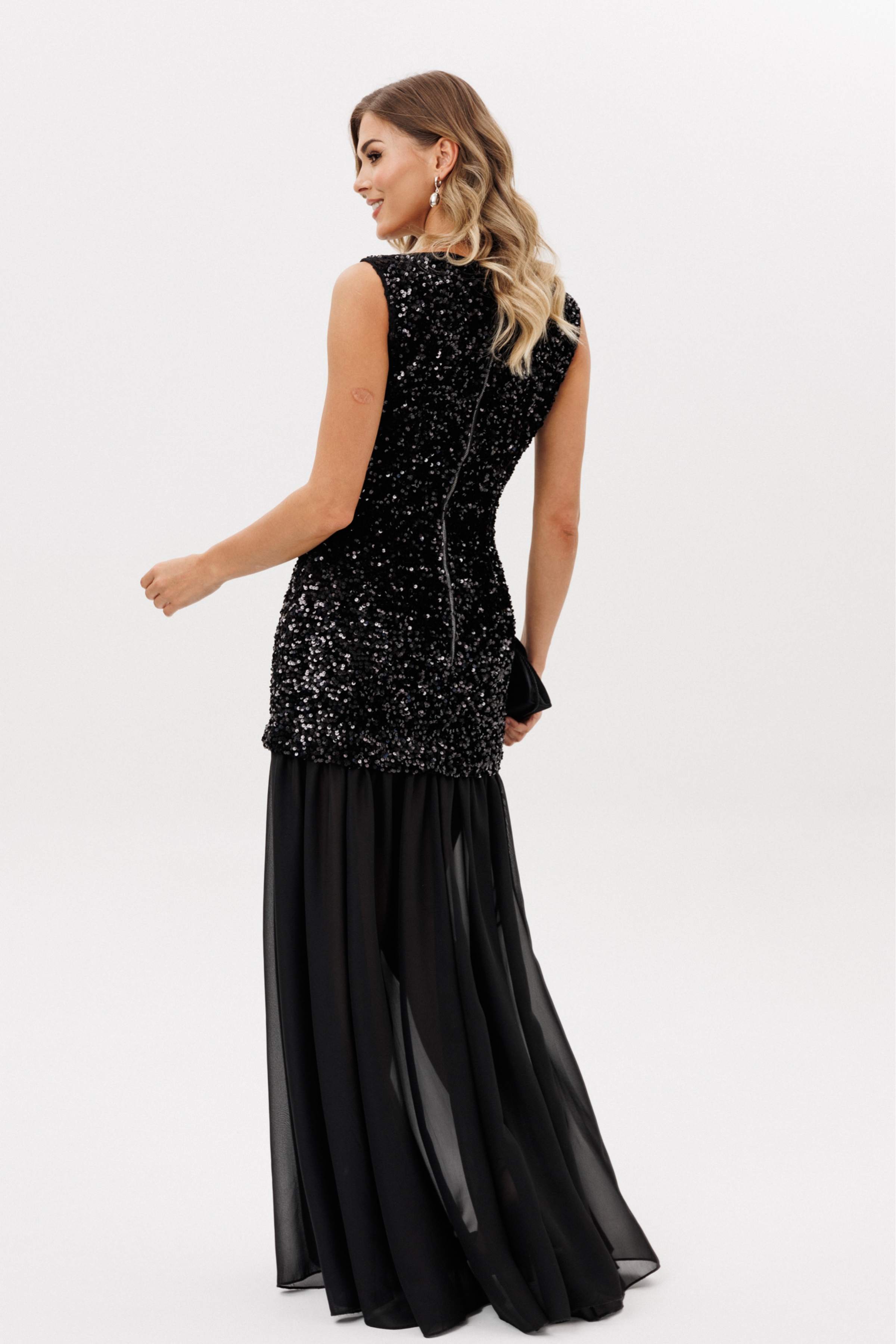 Платье выполнено из барахата с пайетками. Платье Х-образного силуэта, длиной в пол. Верх платья выполнен в виде приталенного платья длиной ниже линии бедер. Застежка на молнию с металлическими звеньями сзади в среднем шве спинки. Плечевой шов заужен. Горловина формы "лодочка". Нижняя часть платья выполнена из шифона и состоит из 8 клиньев. Верх платья на притачной по низу подкладке.