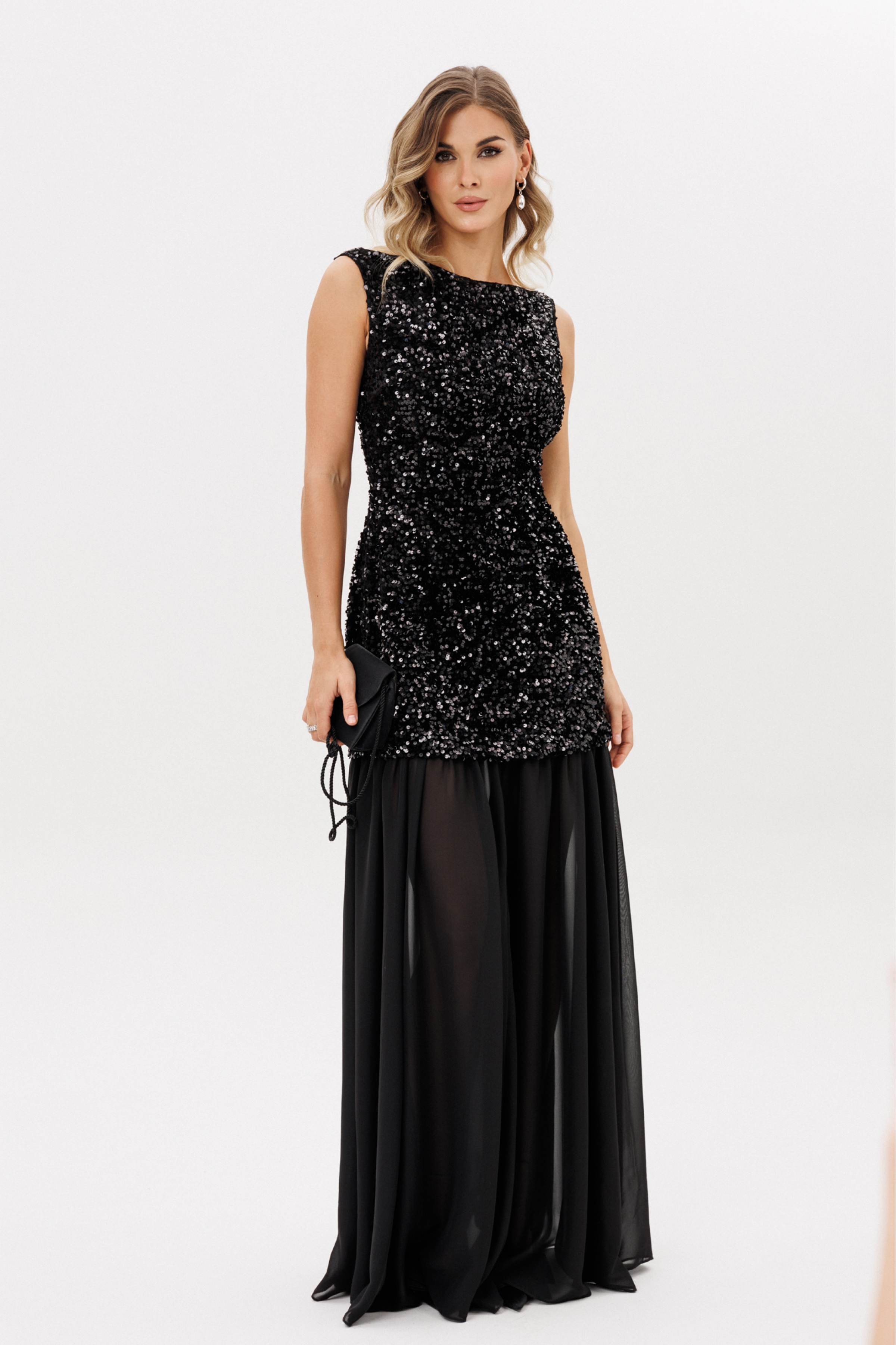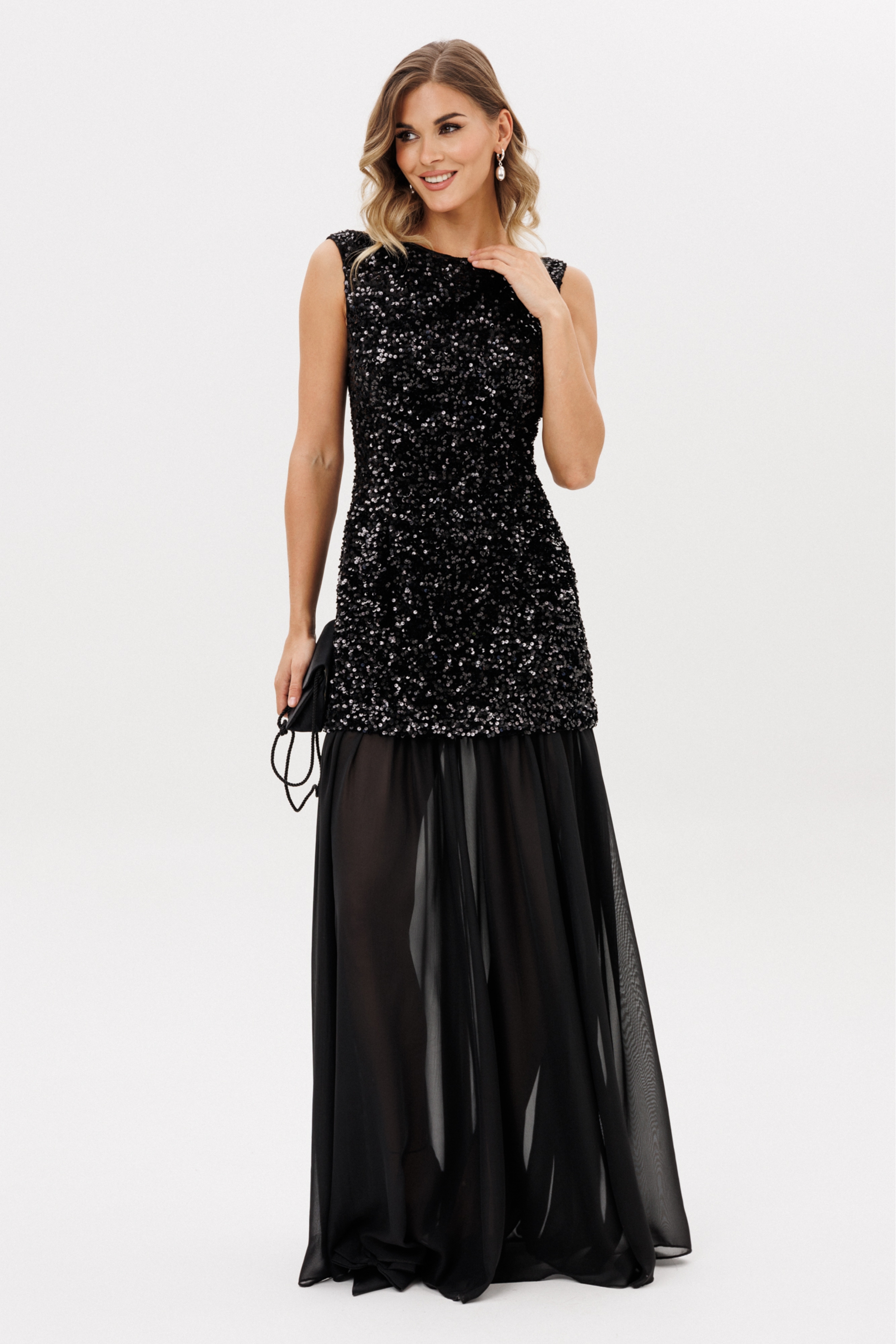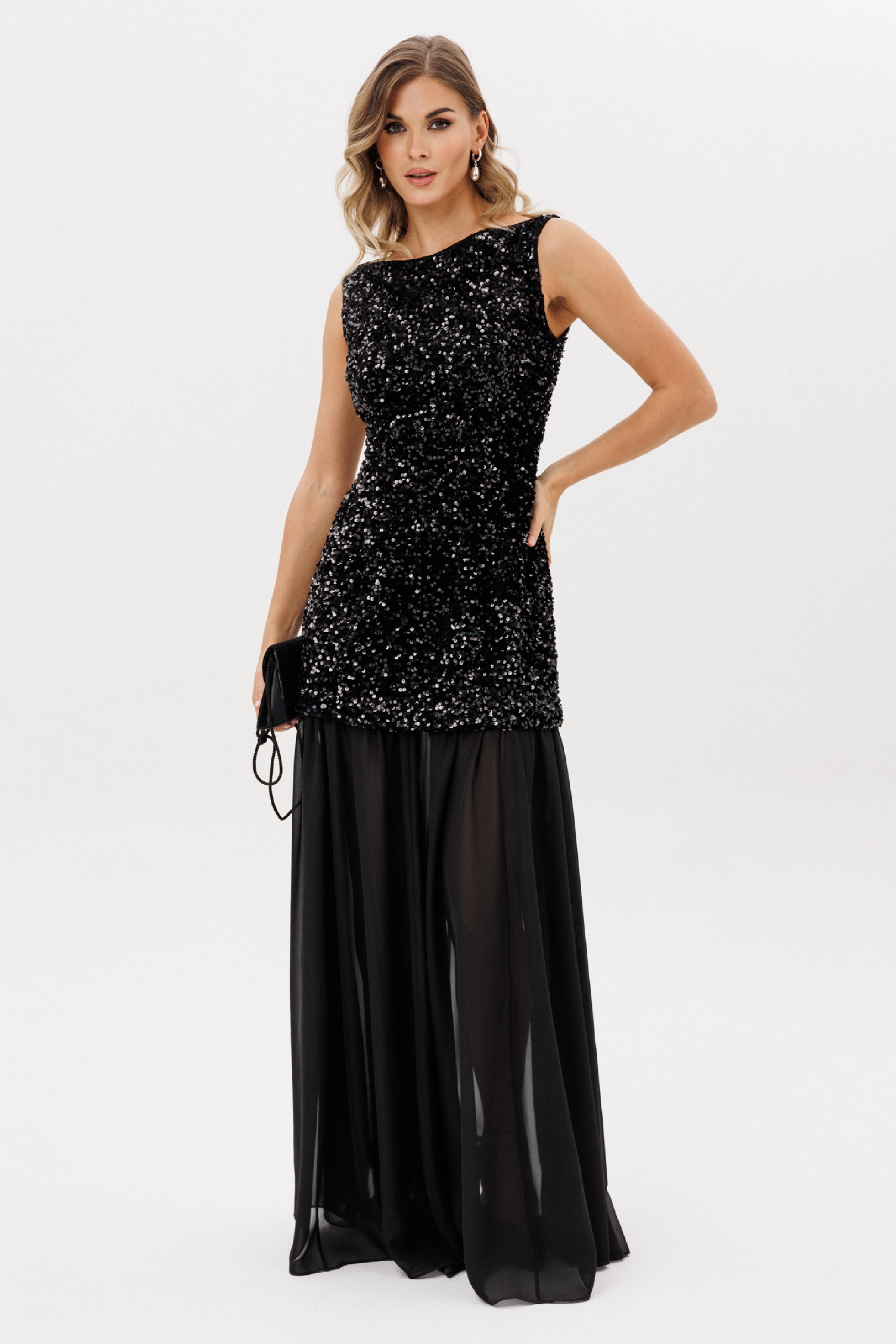 Платье выполнено из барахата с пайетками. Платье Х-образного силуэта, длиной в пол. Верх платья выполнен в виде приталенного платья длиной ниже линии бедер. Застежка на молнию с металлическими звеньями сзади в среднем шве спинки. Плечевой шов заужен. Горловина формы "лодочка". Нижняя часть платья выполнена из шифона и состоит из 8 клиньев. Верх платья на притачной по низу подкладке.