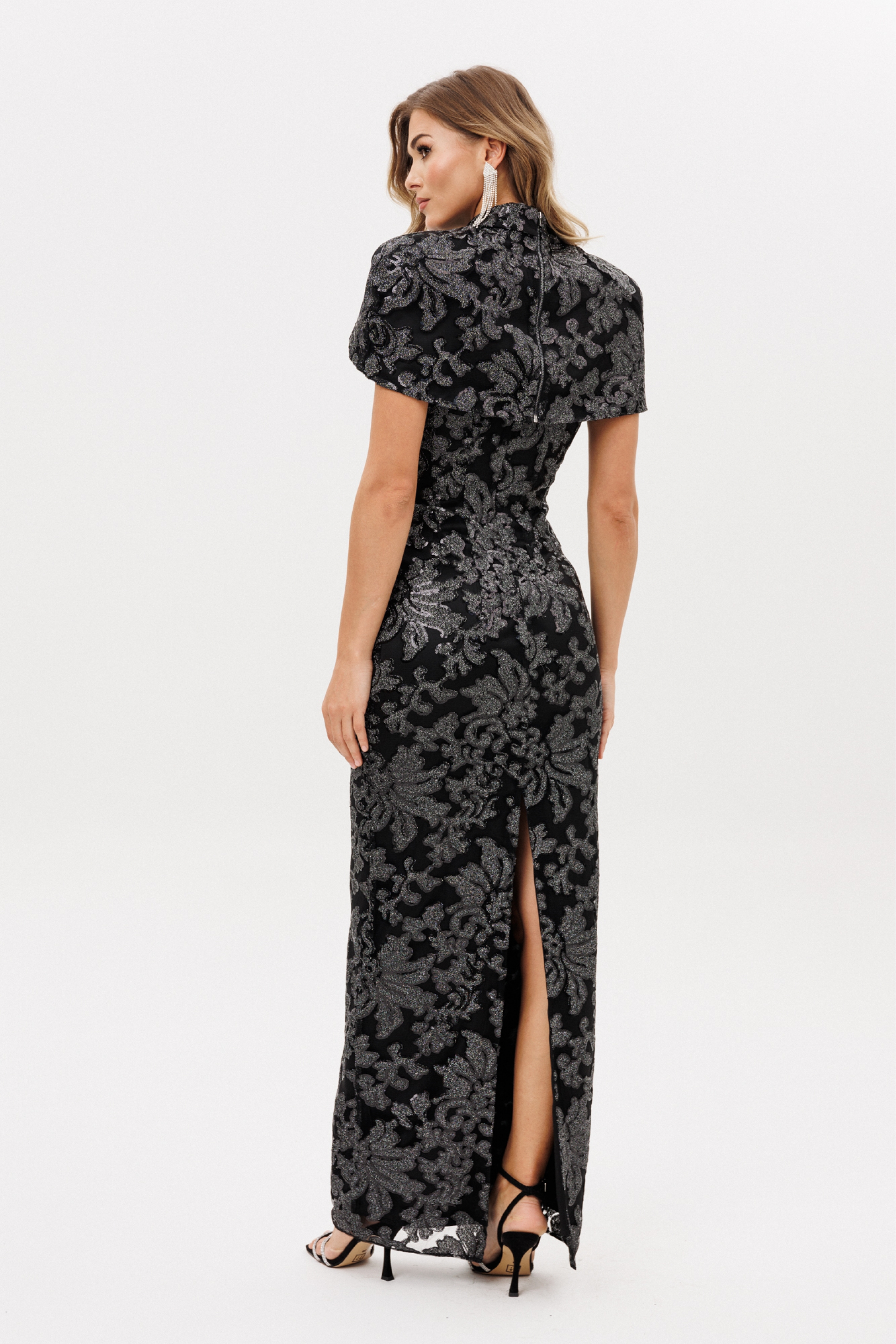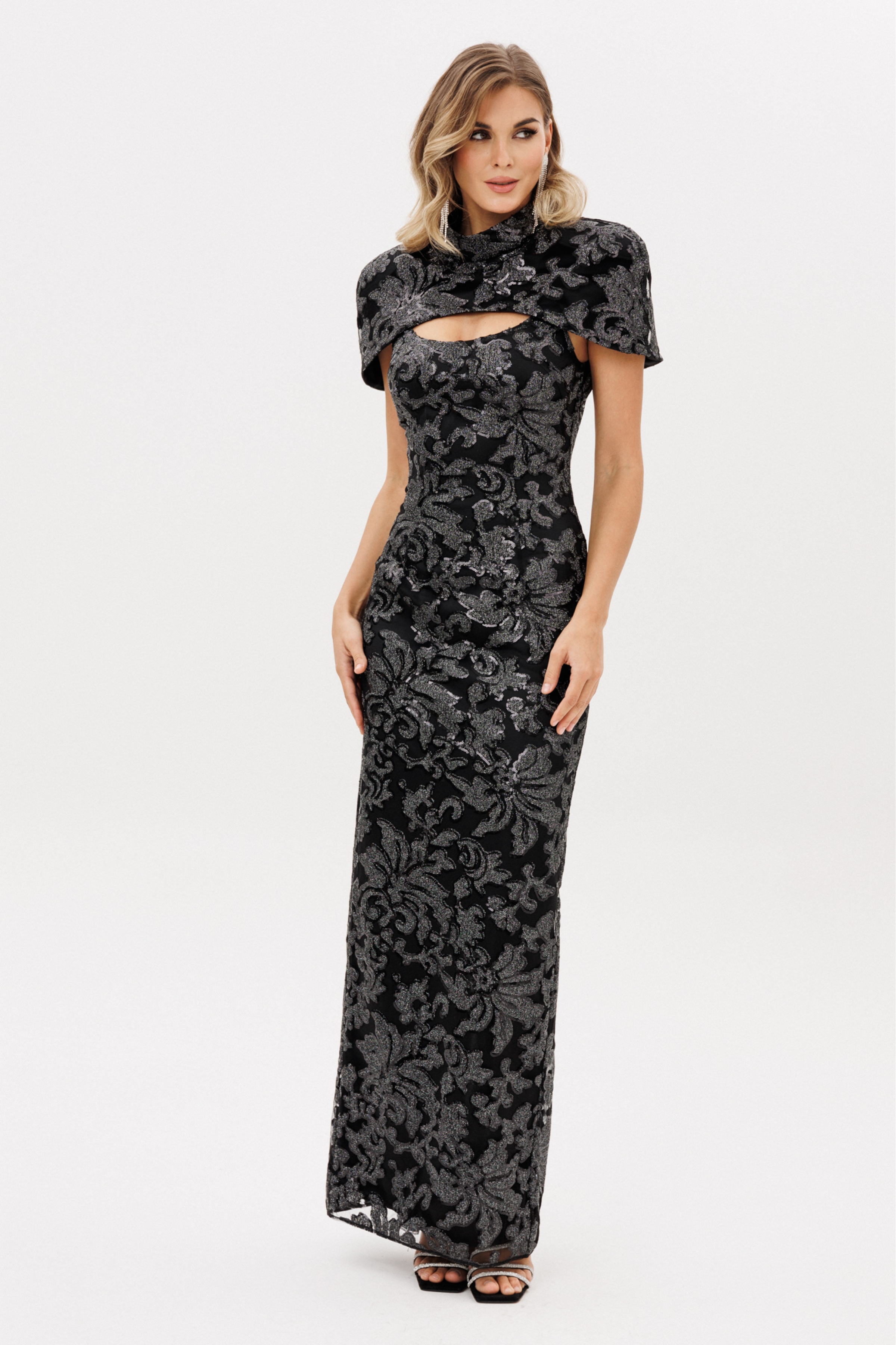 Платье выполнено из костюмно-плательной ткани вышивка на сетке с пайетками. Платье приталенного силуэта длиной миди. Застежка на потайную молнию сзади в среднем шве спинки. Горловина округлой формы, углубленная. Сзади в среднем шве разрез. Платье на отлетной по низу подкладке.