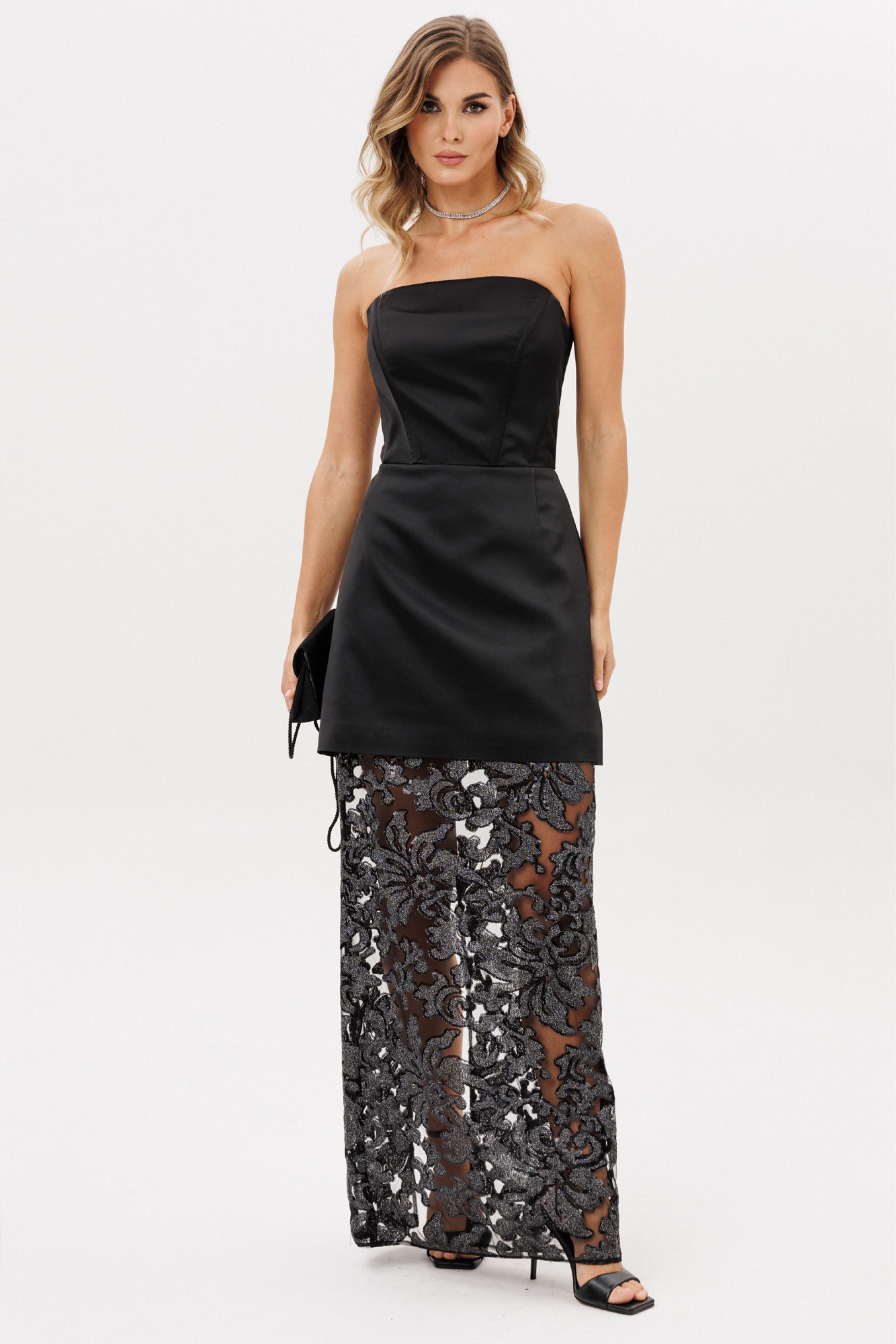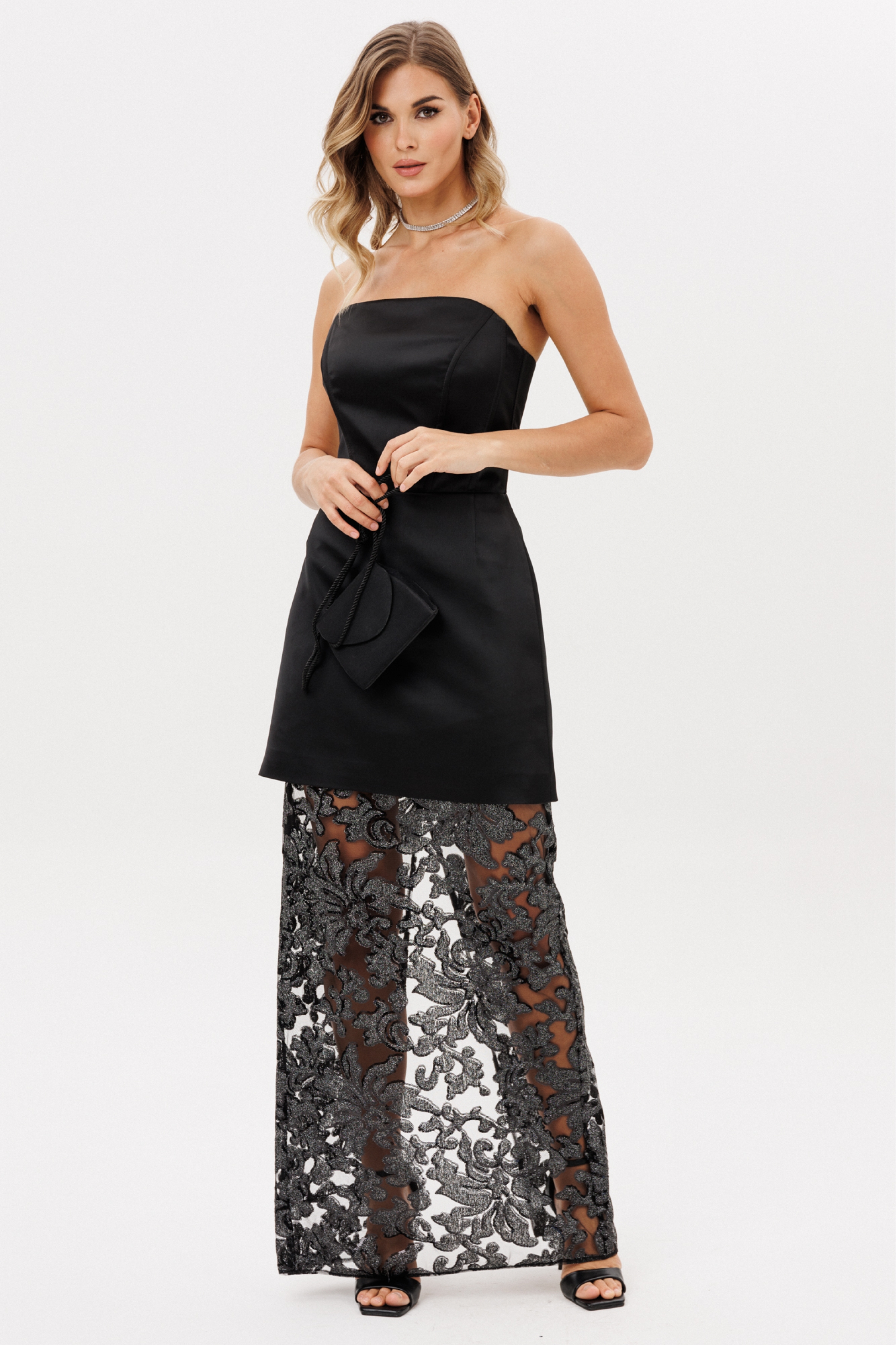Юбка выполнена из сетки с вышивкой с пайетками. Юбка прямого силуэта, длиной миди. Юбка на притачном поясе, застегивающимя на петлю и пуговицу и на потайную молнию сзади в среднем шве. Юбка без подкладки.