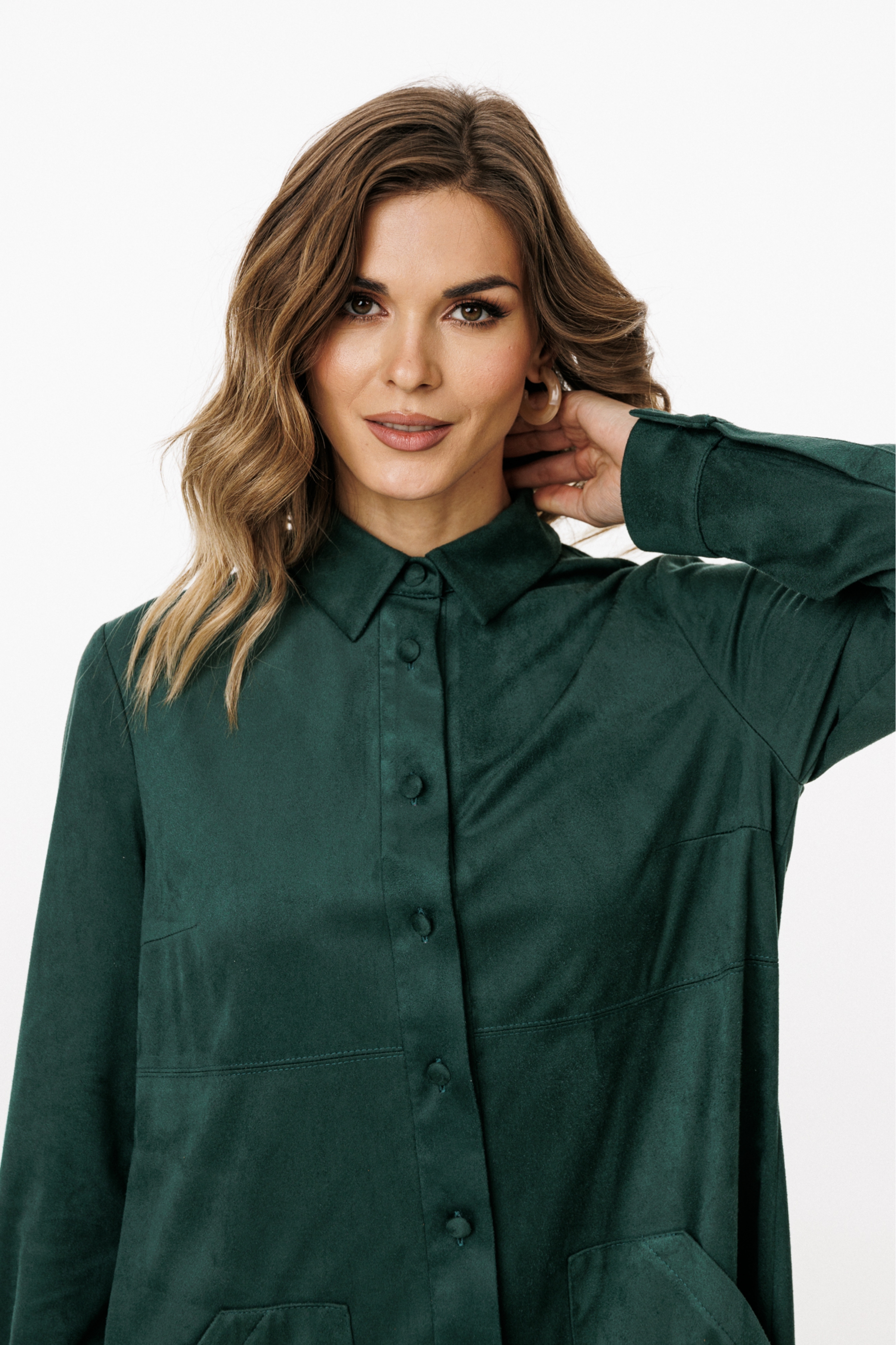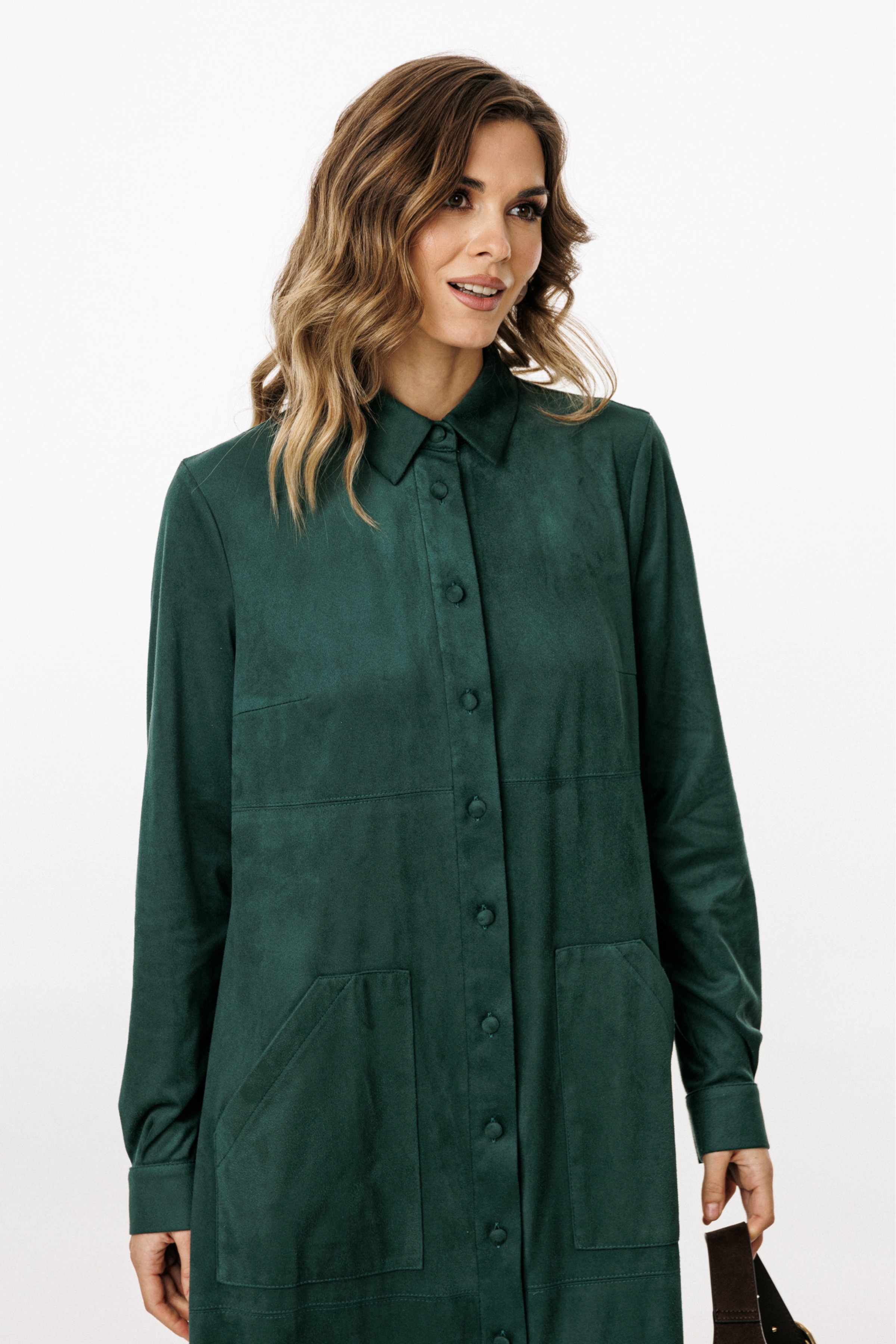 Платье выполнено из тонкой искусственной замши. Платье прямого силуэта, длиной миди. Спереди горизонтальные подрезы, накладные карманы и центральная застежка до верха с планкой на пуговицы. На спинке кокетка и встречная складка. Воротник стояче-отложной с отрезной стойкой и застежкой на пуговицу. Рукав втачной, одношовный. По низу рукава две складки и планка-обтачка. Низ рукава на притачной манжете с застежкой на пуговицу.