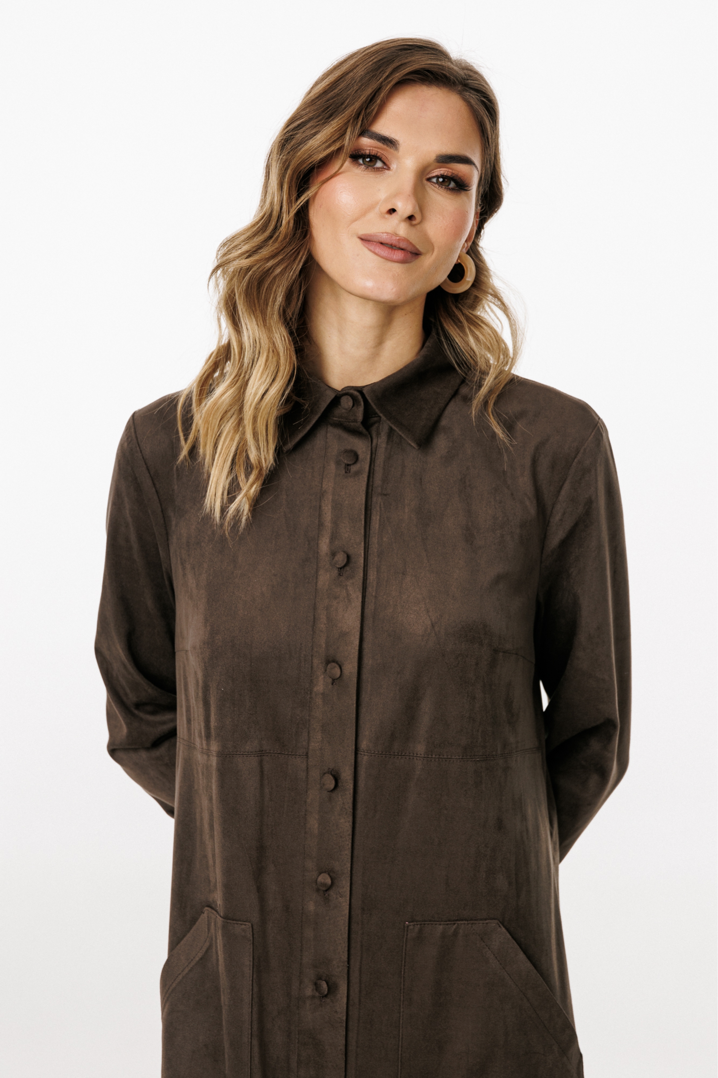 Платье выполнено из тонкой искусственной замши. Платье прямого силуэта, длиной миди. Спереди горизонтальные подрезы, накладные карманы и центральная застежка до верха с планкой на пуговицы. На спинке кокетка и встречная складка. Воротник стояче-отложной с отрезной стойкой и застежкой на пуговицу. Рукав втачной, одношовный. По низу рукава две складки и планка-обтачка. Низ рукава на притачной манжете с застежкой на пуговицу.