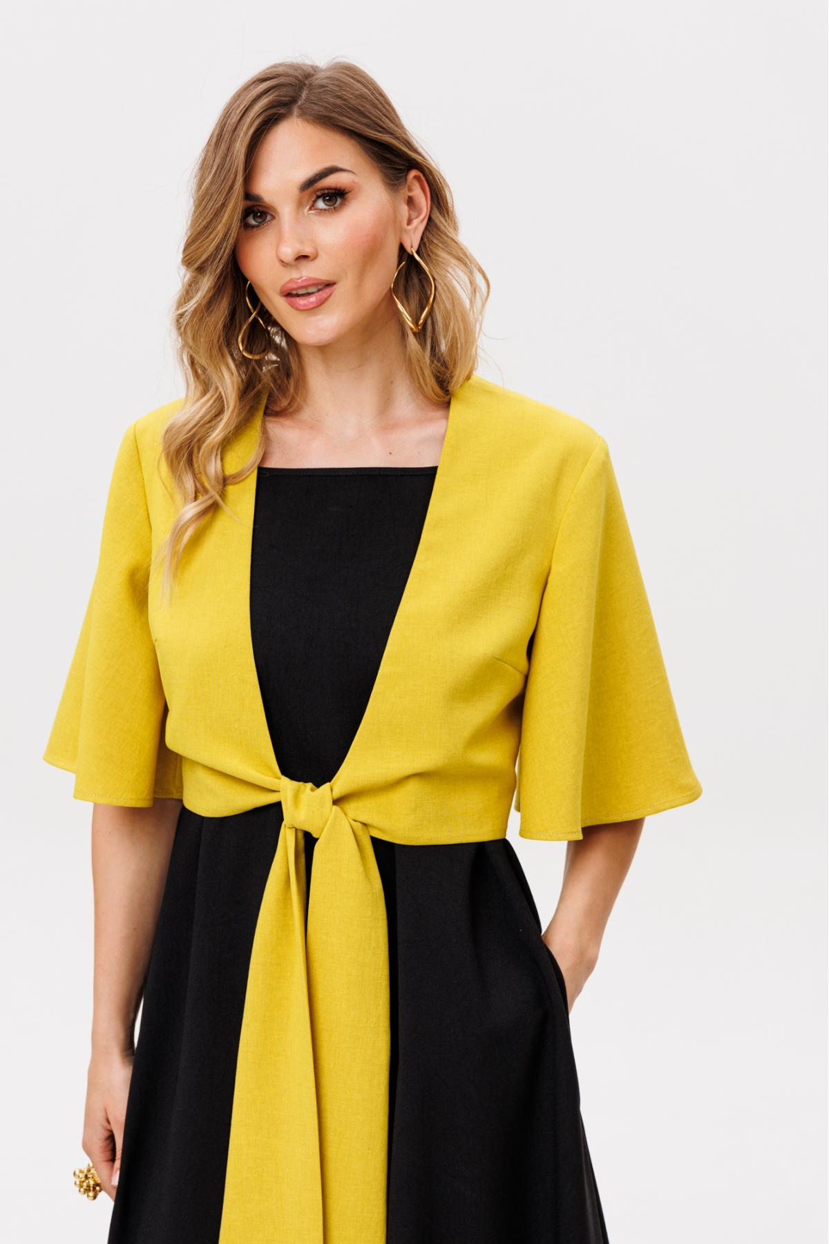 Блузка выполнена из костюмно-плательной ткани. Спинка цельная. Горловина спинки округлой формы, перед - V-образной формы. Рукав втачной, одношовный, длиной чуть ниже линии локтя, расширенный к низу. Спереди широкие завязки.