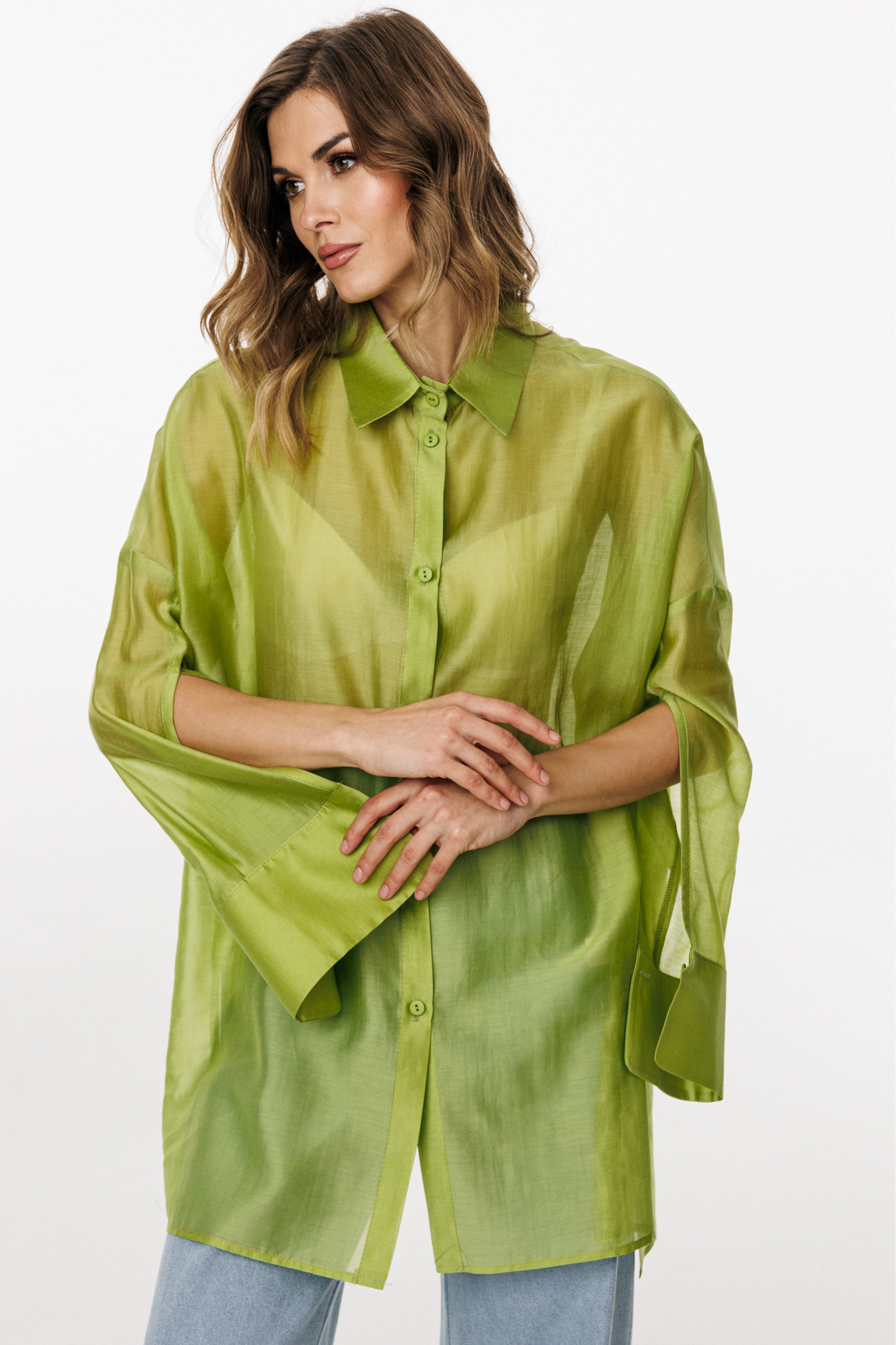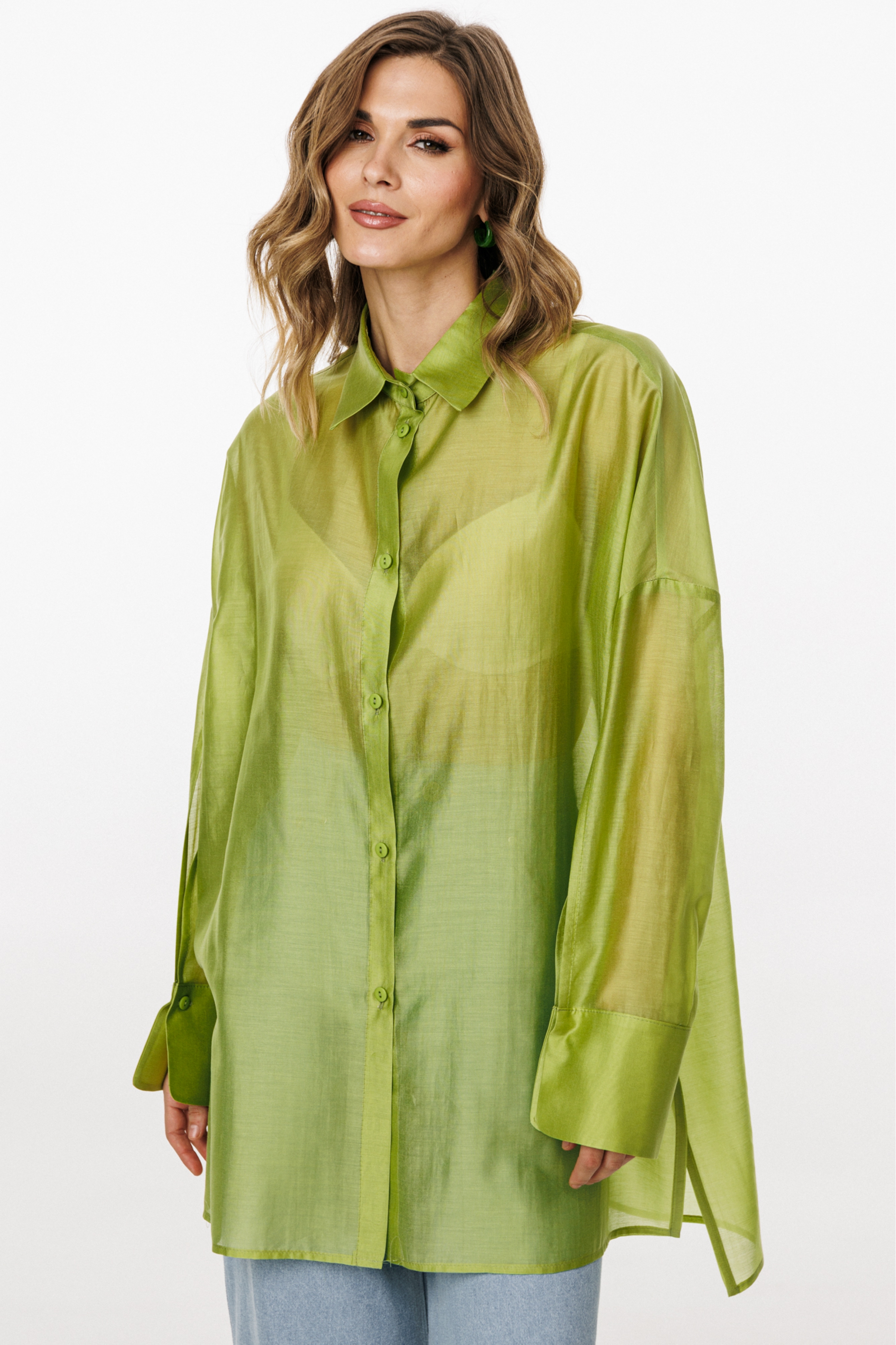Блузка выполнена из плательно-блузочной ткани. Блузка прямого силуэта, покроя оверсайз, длиной ниже линии бедер. Спереди центральная застежка на пуговицы. Спинка цельная, длиннее переда. Воротник стояче-отложной. Плечевой шов спущен. Рукав рубашечного покроя, двухшовный, с прорезью по переду. Низ рукава на притачной манжете, застегивающейся на пуговицу. В боковых швах разрезы.