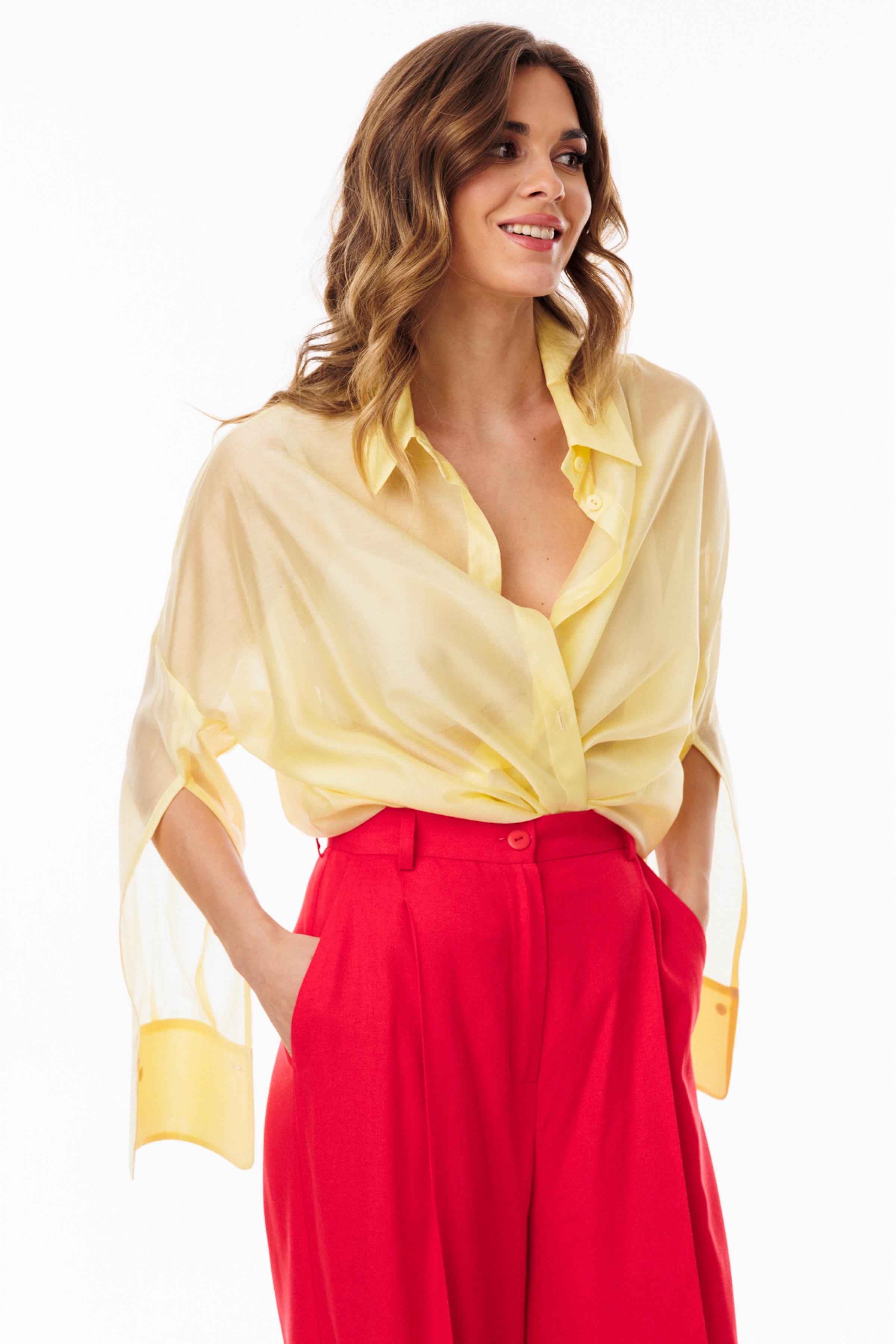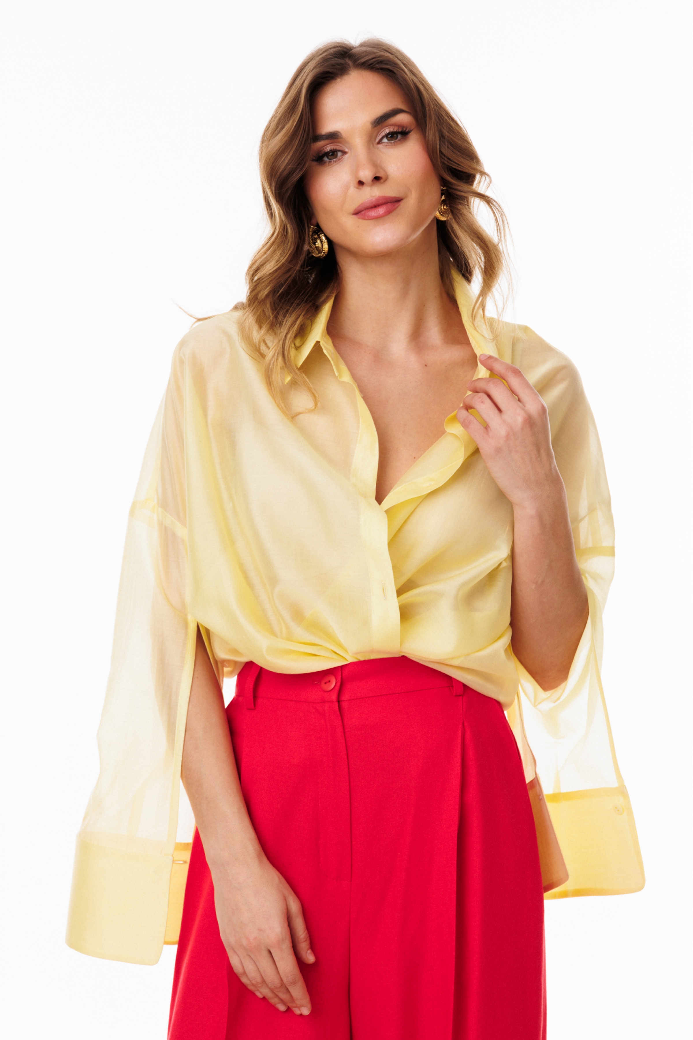 Блузка выполнена из плательно-блузочной ткани. Блузка прямого силуэта, покроя оверсайз, длиной ниже линии бедер. Спереди центральная застежка на пуговицы. Спинка цельная, длиннее переда. Воротник стояче-отложной. Плечевой шов спущен. Рукав рубашечного покроя, двухшовный, с прорезью по переду. Низ рукава на притачной манжете, застегивающейся на пуговицу. В боковых швах разрезы.