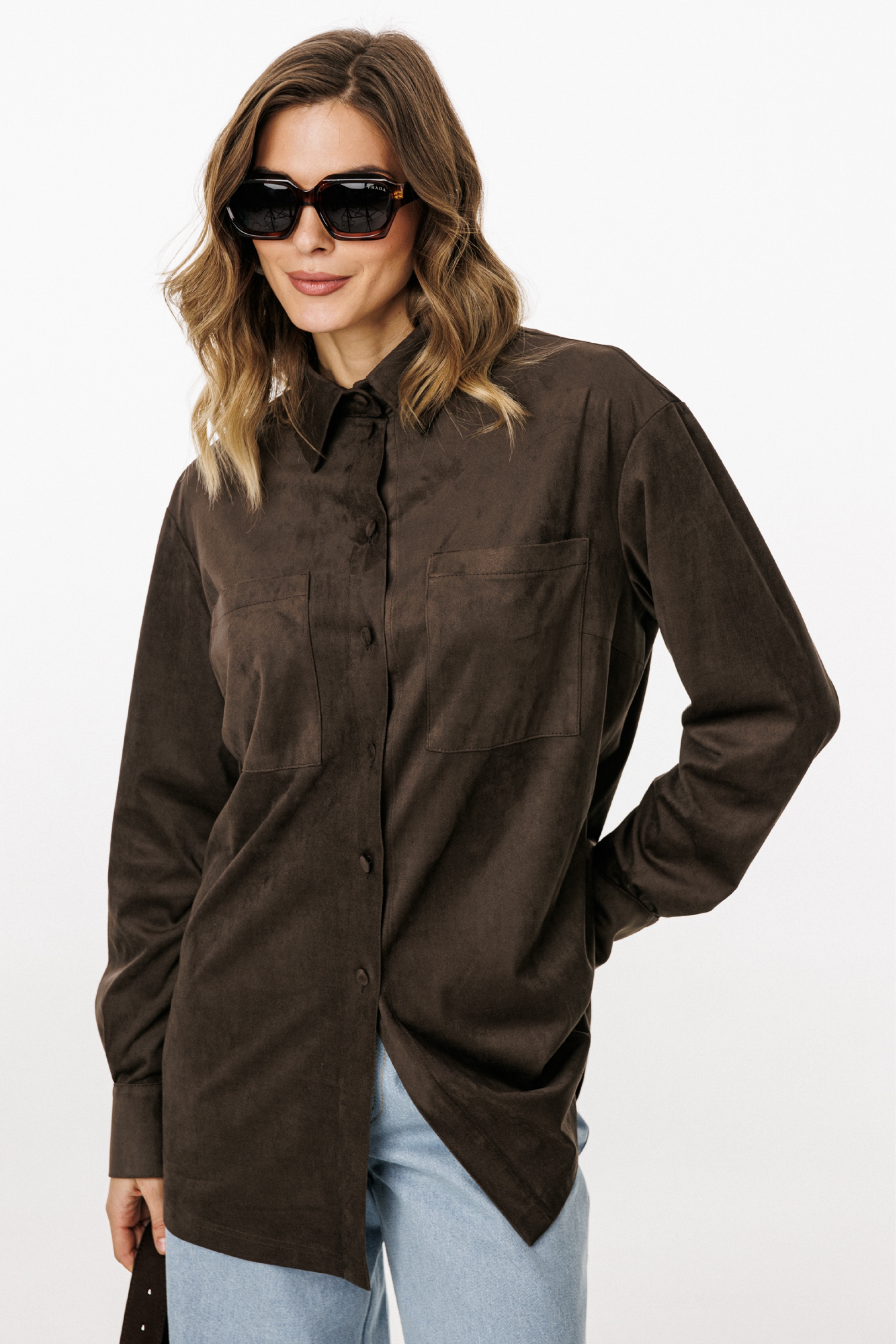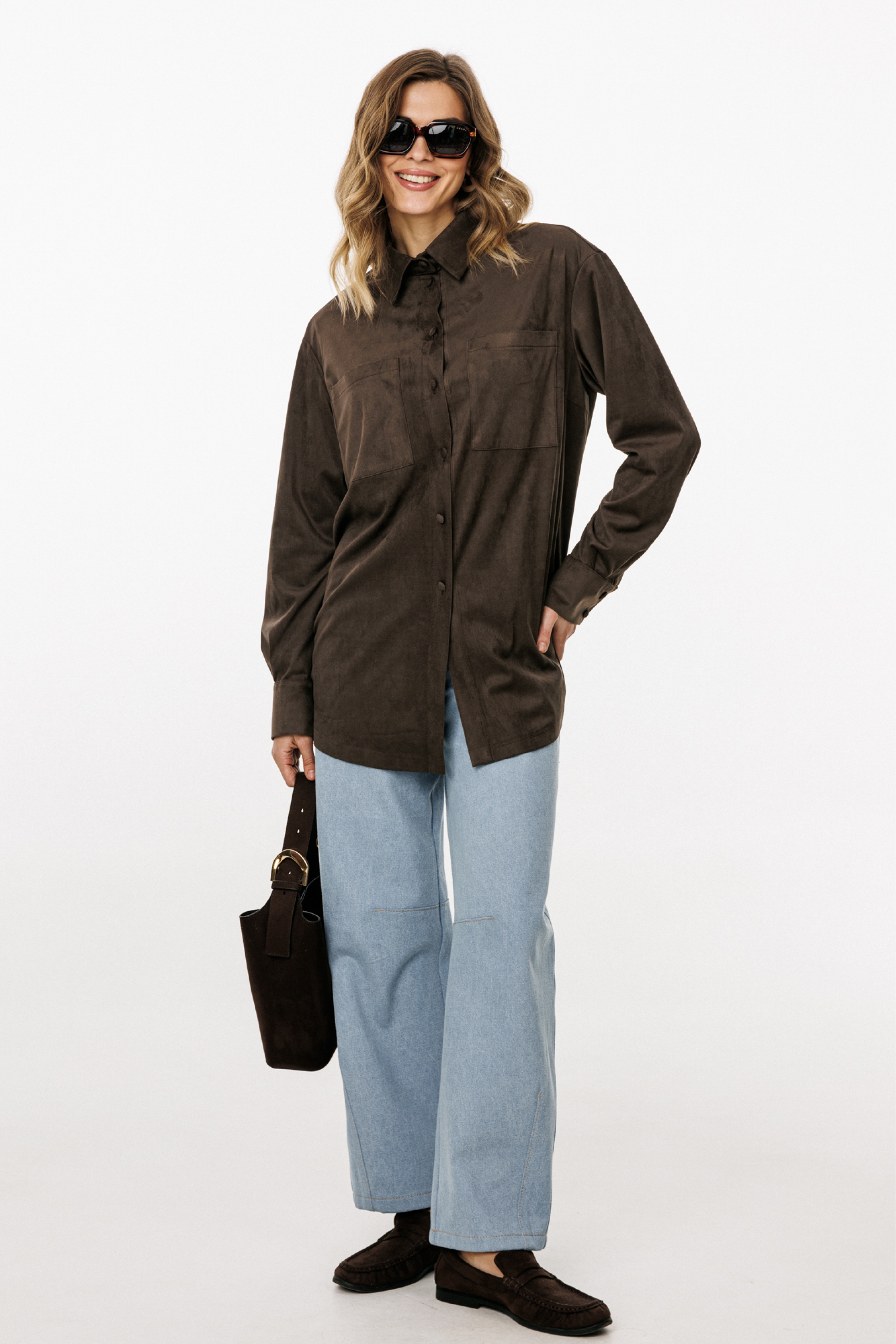 Блузка выполнена из тонкой искусственной замши. Блузка прямого силуэта, длиной до линии бедер. Спереди нагрудные карманы и центральная застежка с планкой на пуговицы. Спинка цельная. Воротник стояче-отложной с отрезной стойкой. Рукав втачной, одношовный. Низ рукава на притачной манжете с застежкой на пуговицы. Низ блузки фигурной формы.