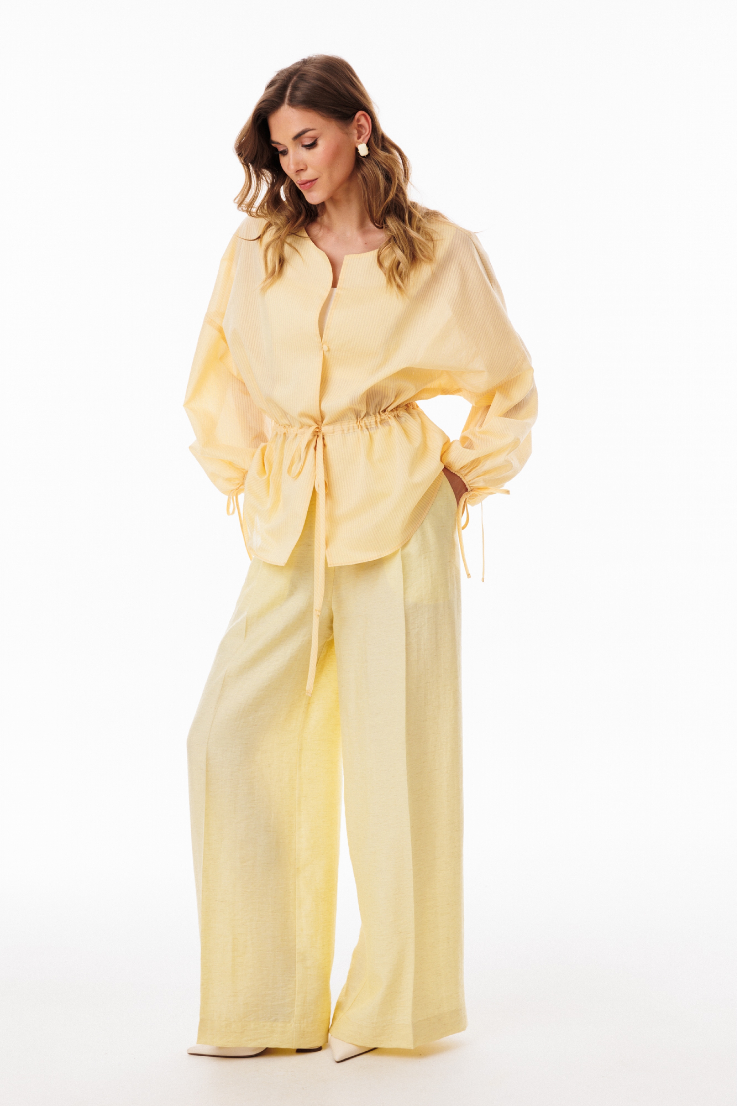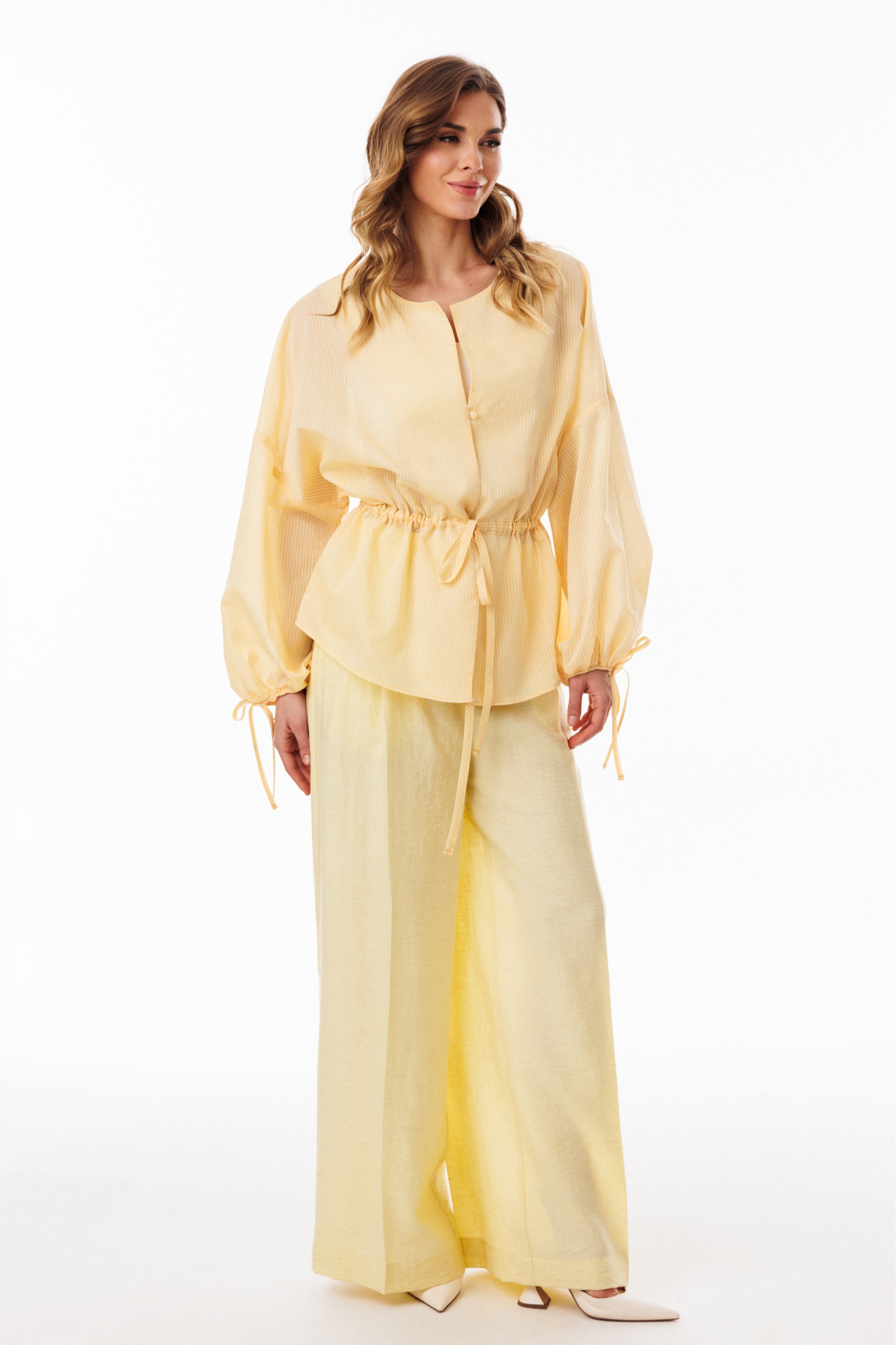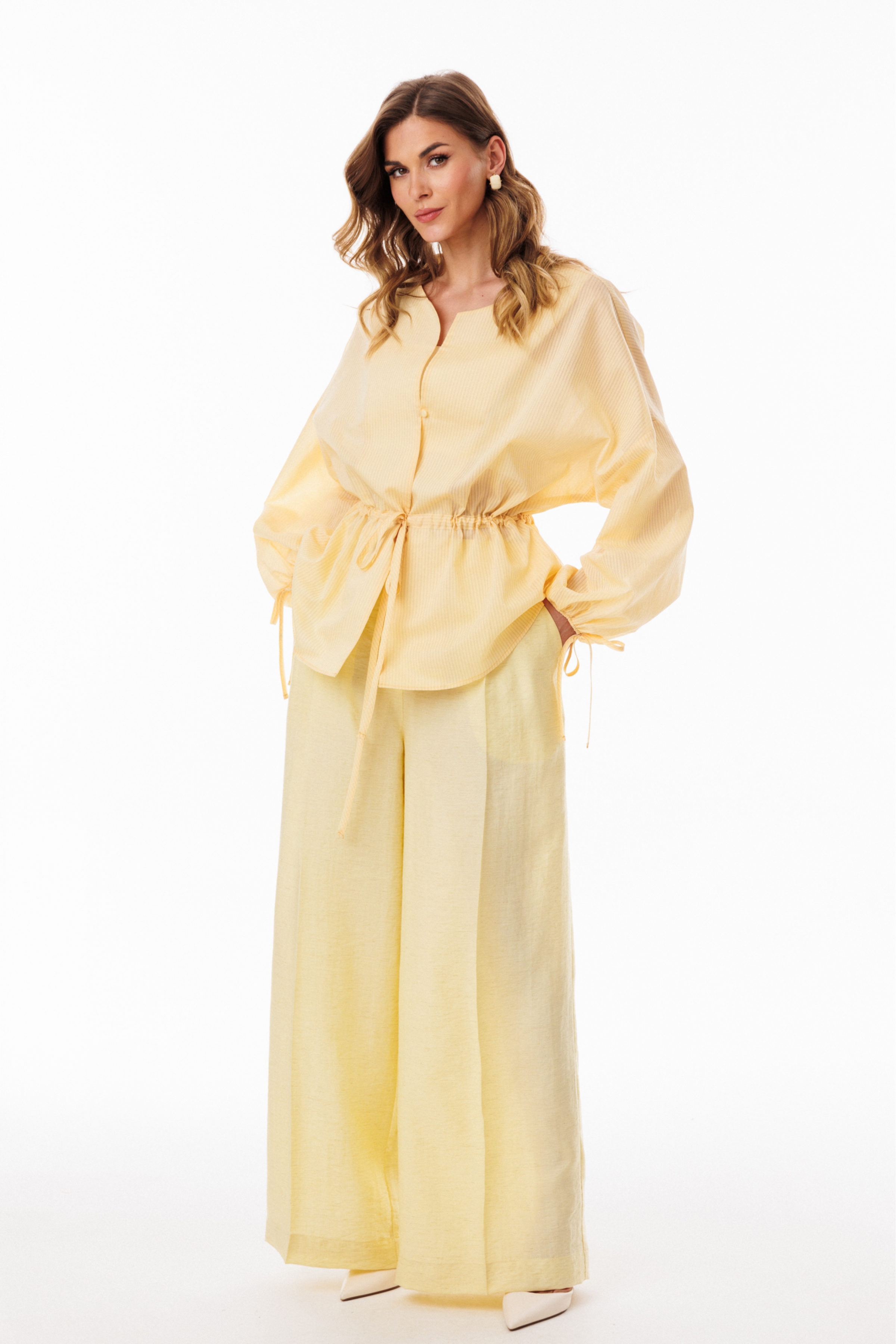 Брюки-палаццо выполнены из плательно-блузочной ткани. Брюки на притачном поясе, длиной в пол, расширенные к низу. Спереди складки и боковые карманы с наклонным входом. Застежка спереди на молнию с гульфиком и пуговицу. На задних частях обработаны талиевые вытачки.