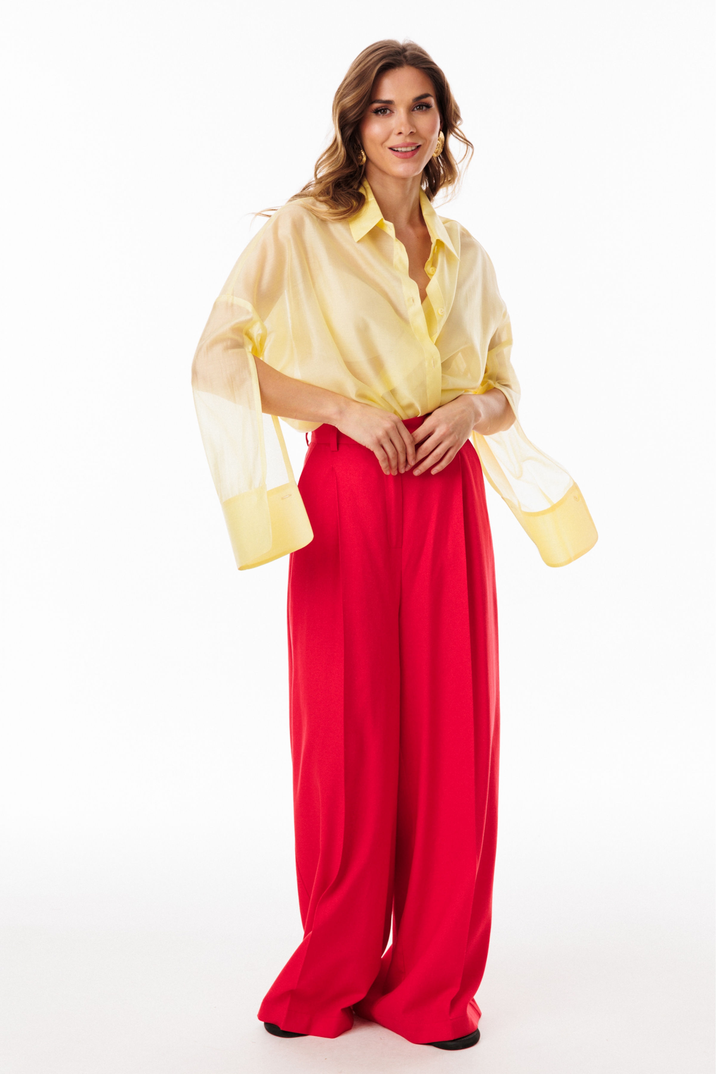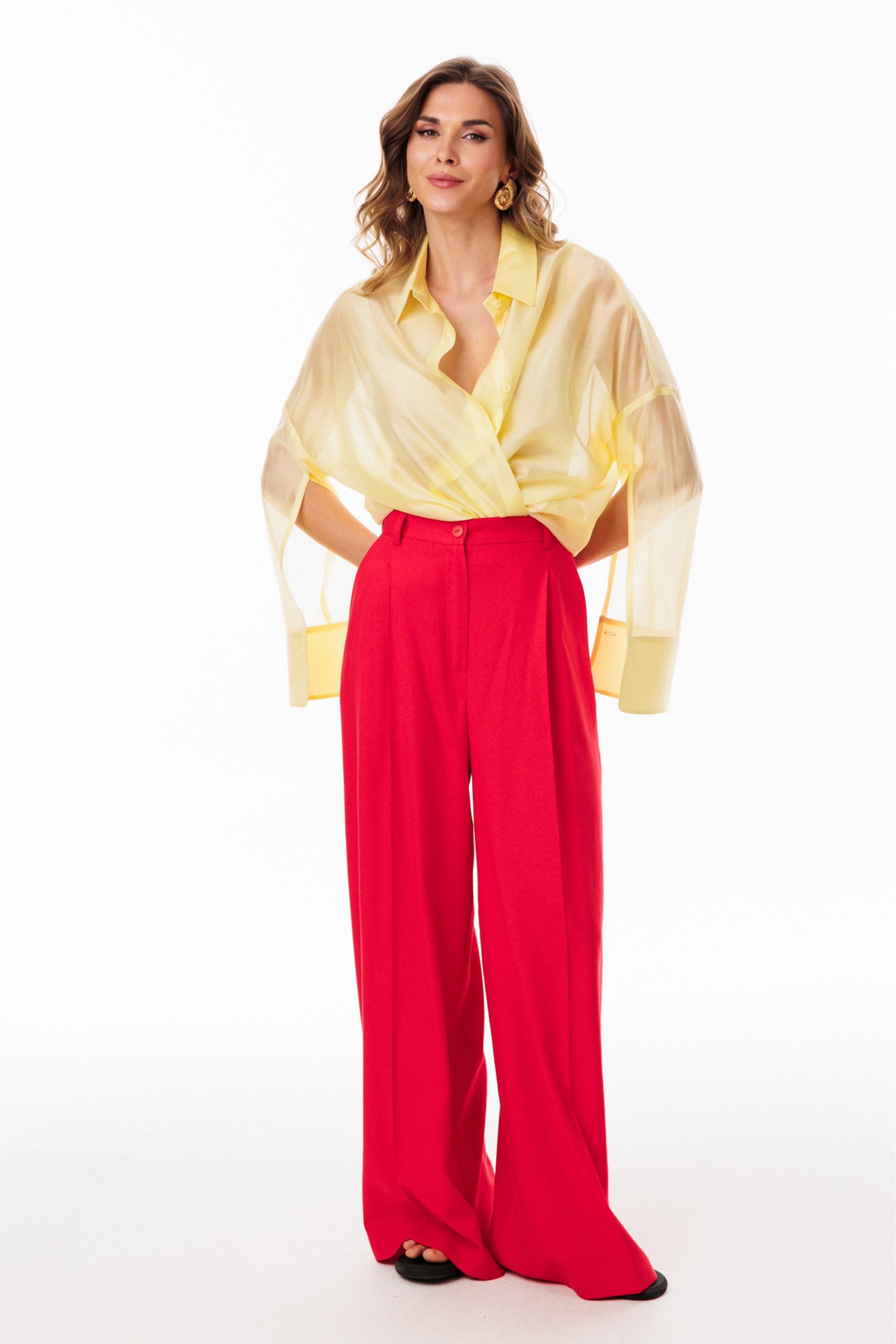 Брюки-палаццо выполнены из льна. Брюки на притачном поясе, длиной в пол, расширенные к низу. Спереди складки и боковые карманы с наклонным входом. Застежка спереди на молнию с гульфиком и пуговицу. На задних частях обработаны талиевые вытачки.