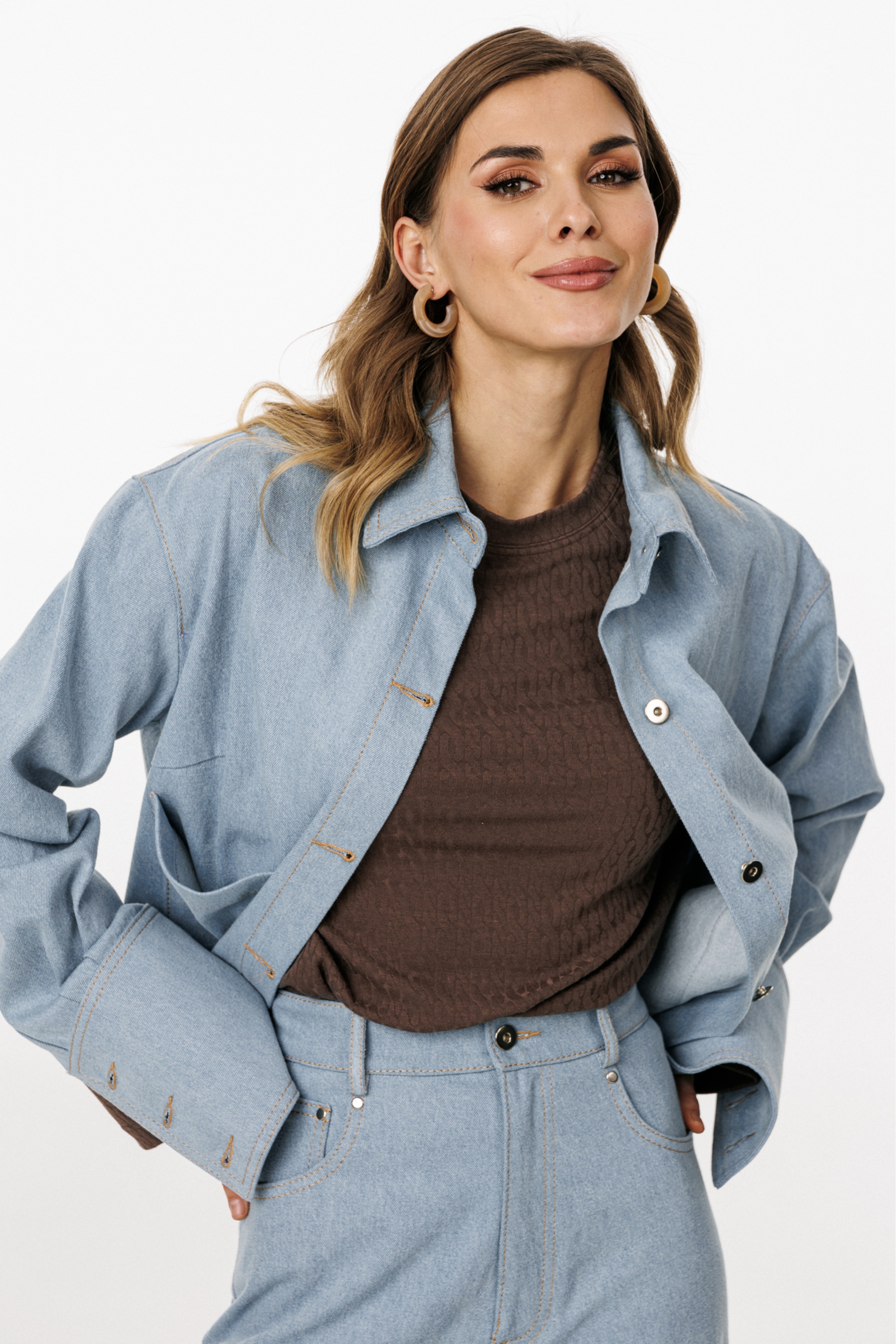 Джемпер выполнен из трикотажного полотна с рисунком. Джемпер прямого силуэта, длиной до линии бедра. Перед и спинка цельные. Горловина округлой формы, обработана широкой бейкой. Плечевой шов удлинен. Рукав одношовный, прямой.