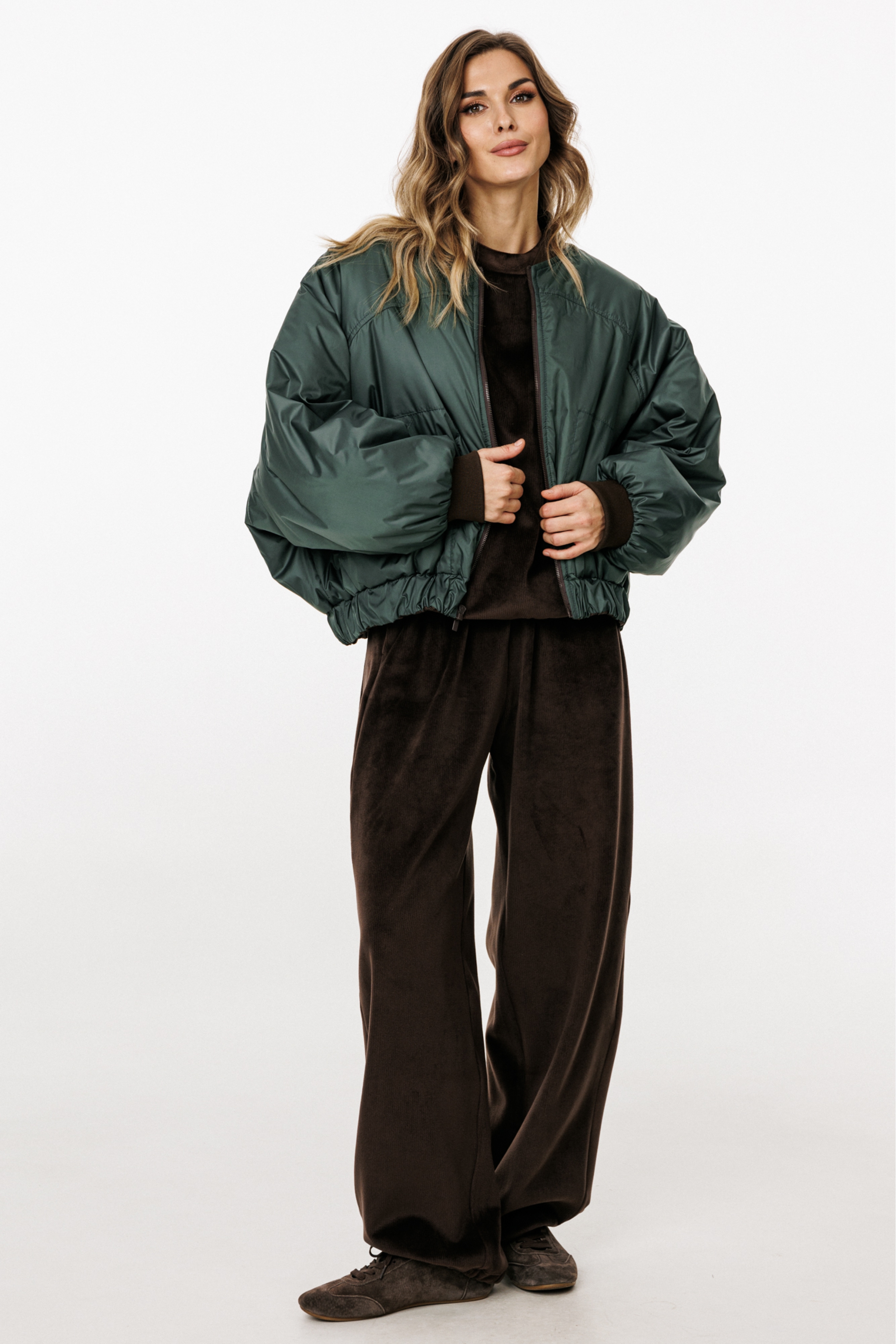 Комплект: джемпер+брюки. Комплект выполнен из двустороннего велюра в мелкий рубчик. Джемпер О-образного силуэта, покроя "oversize", длиной до линии бедер. Перед и спинка цельные. Горловина округлой формы, обработана бейкой. Плечевой шов удлинен. Рукав рубашечного покроя, одношовный. Низ рукава на манжете. Верхняя часть рукава переходит в кокетку переда т спинки и доходит до горловины. По низу джемпера обработан пояс. Пояс, манжеты, верхняя часть рукава и бейка горловины выполнены из основной, но без рубчика. Брюки на притачном поясе с эластичной тесьмой, прямого силуэта, длиной в пол, покроя "oversize". Боковой шов заменен лампасом. В швах лампаса карманы. Сзади накладные карманы. В пояс протянут шнур с наконечниками. По низу брюк втянута эластичная тесьма с фиксаторами. Лампасы и пояс выполнены из основной ткани, но без рубчика.