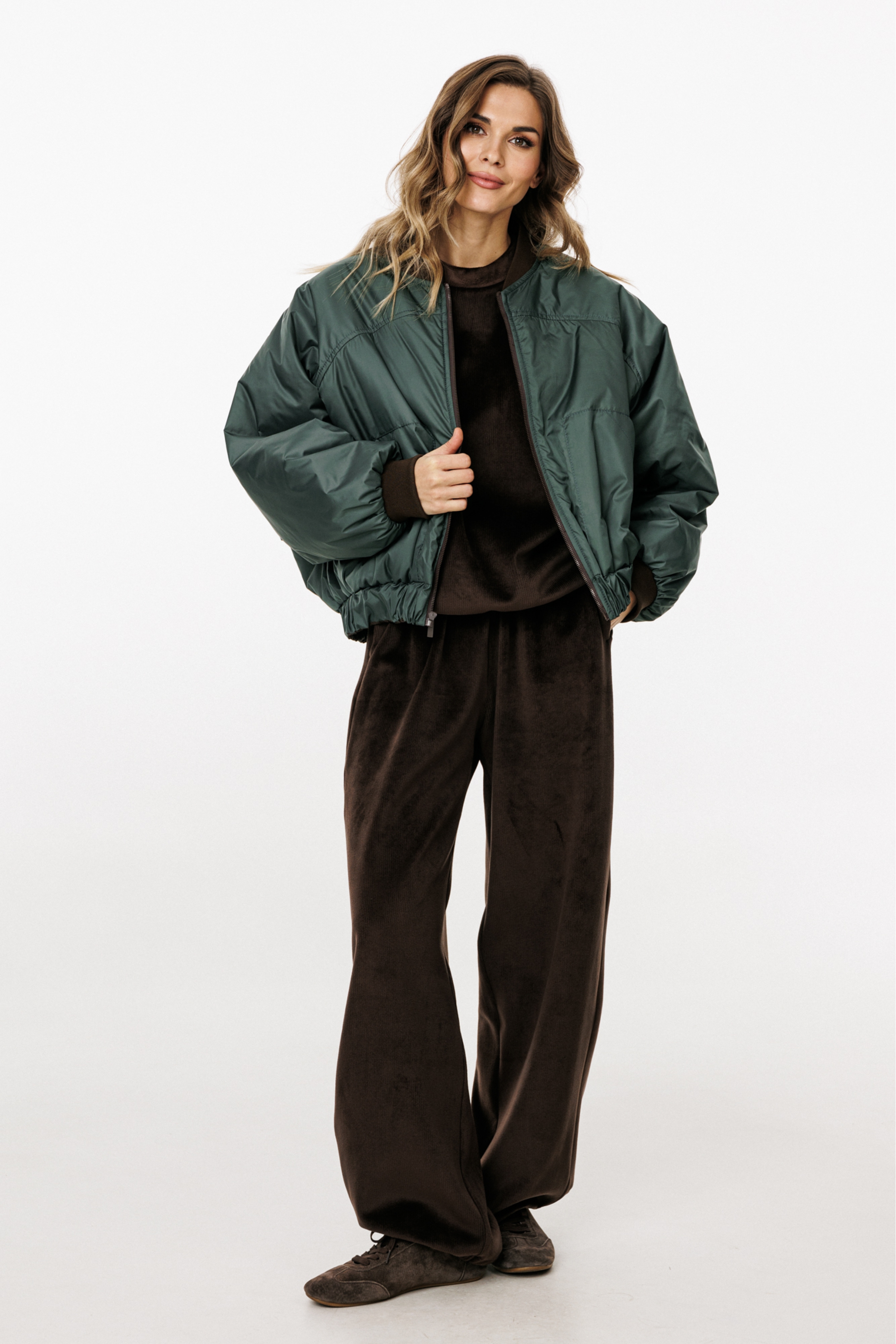 Комплект: джемпер+брюки. Комплект выполнен из двустороннего велюра в мелкий рубчик. Джемпер О-образного силуэта, покроя "oversize", длиной до линии бедер. Перед и спинка цельные. Горловина округлой формы, обработана бейкой. Плечевой шов удлинен. Рукав рубашечного покроя, одношовный. Низ рукава на манжете. Верхняя часть рукава переходит в кокетку переда т спинки и доходит до горловины. По низу джемпера обработан пояс. Пояс, манжеты, верхняя часть рукава и бейка горловины выполнены из основной, но без рубчика. Брюки на притачном поясе с эластичной тесьмой, прямого силуэта, длиной в пол, покроя "oversize". Боковой шов заменен лампасом. В швах лампаса карманы. Сзади накладные карманы. В пояс протянут шнур с наконечниками. По низу брюк втянута эластичная тесьма с фиксаторами. Лампасы и пояс выполнены из основной ткани, но без рубчика.